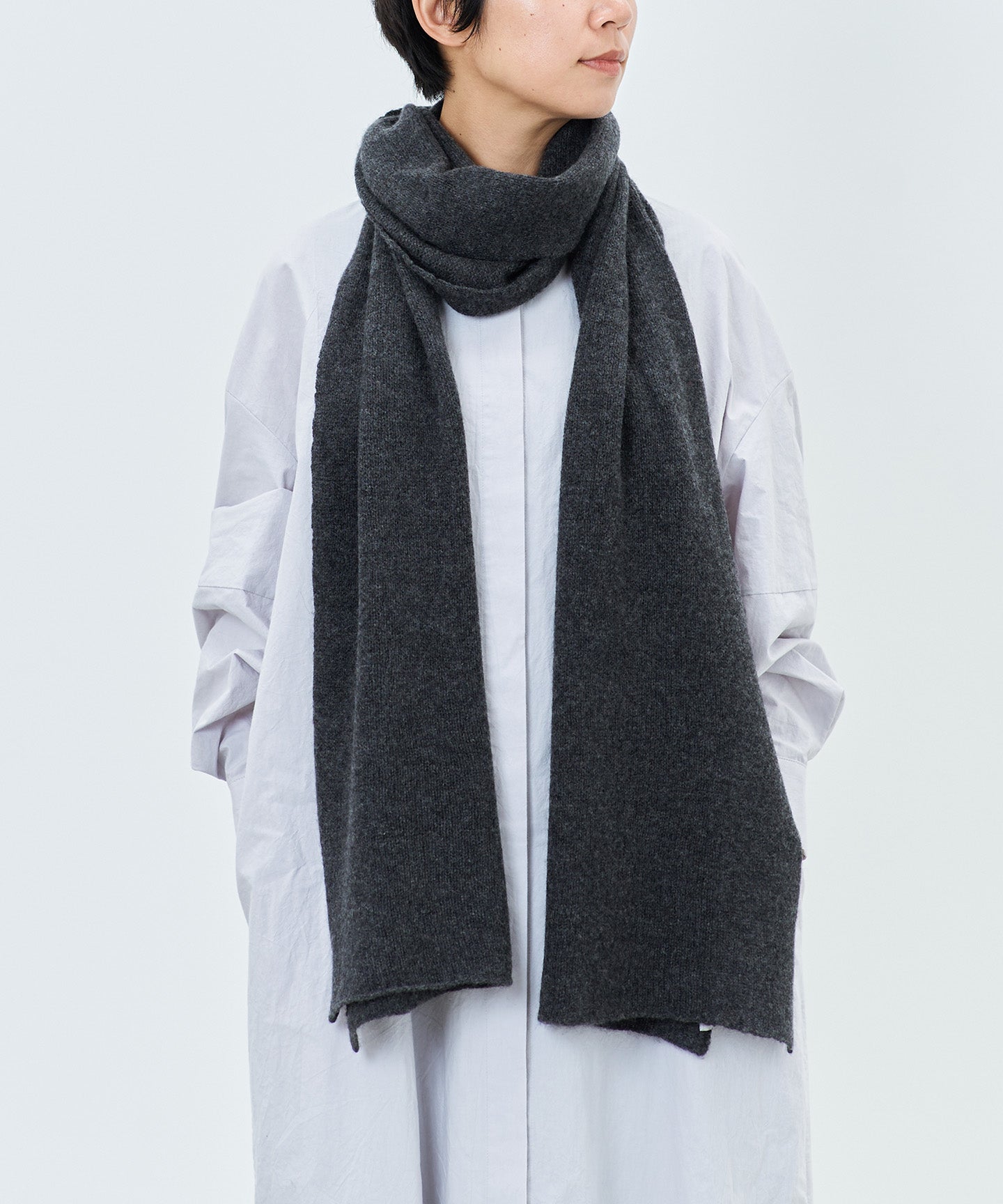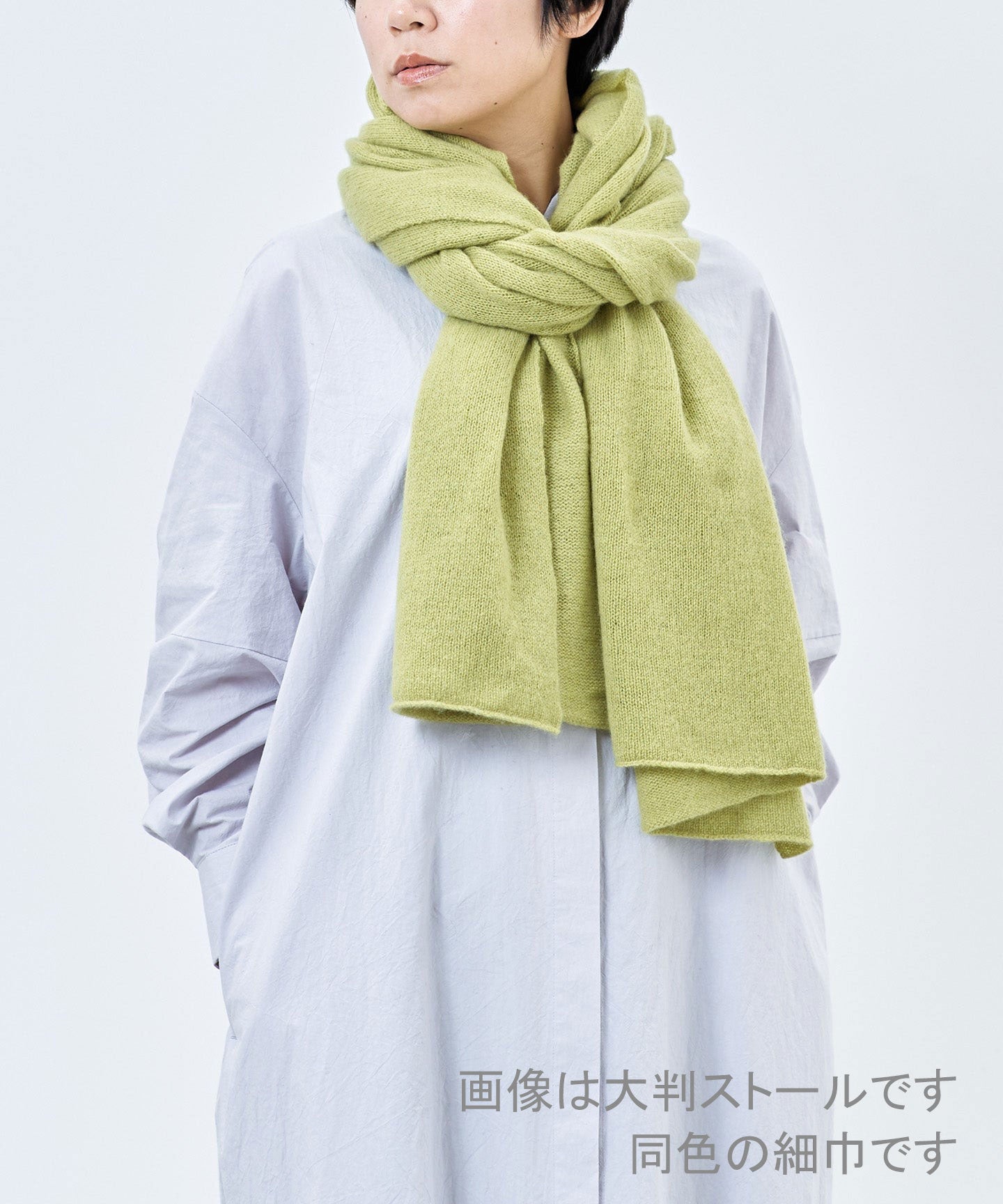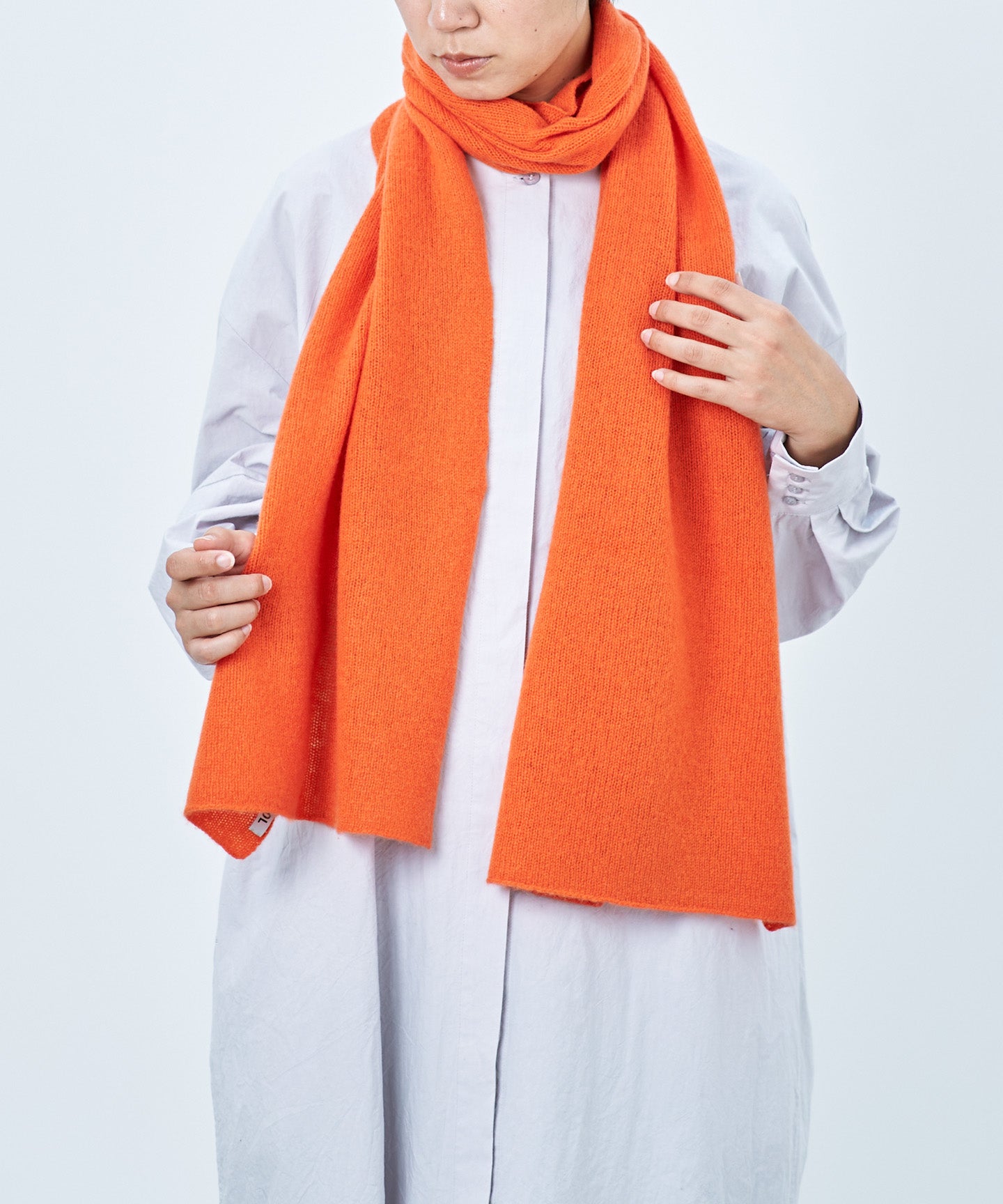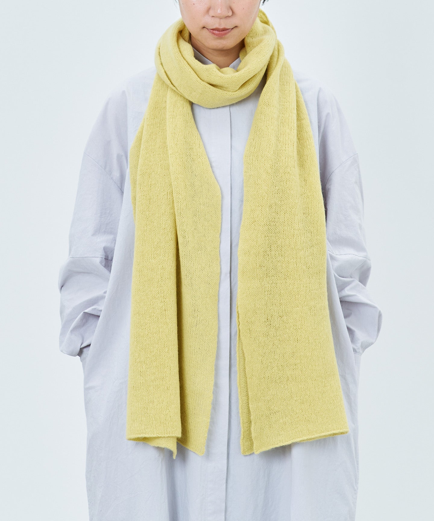 昔ながらの手編み機にて、人の手で編み機のキャリッジを動かして編んで作るマフラーです。編み機で編むときには、糸を張るテンションと、編地を下に引っ張るテンションが非常に大事です。それを人の手と目で具合を見ながら優しく編むことによって、非常に軽く柔らかく暖かいストールができました。