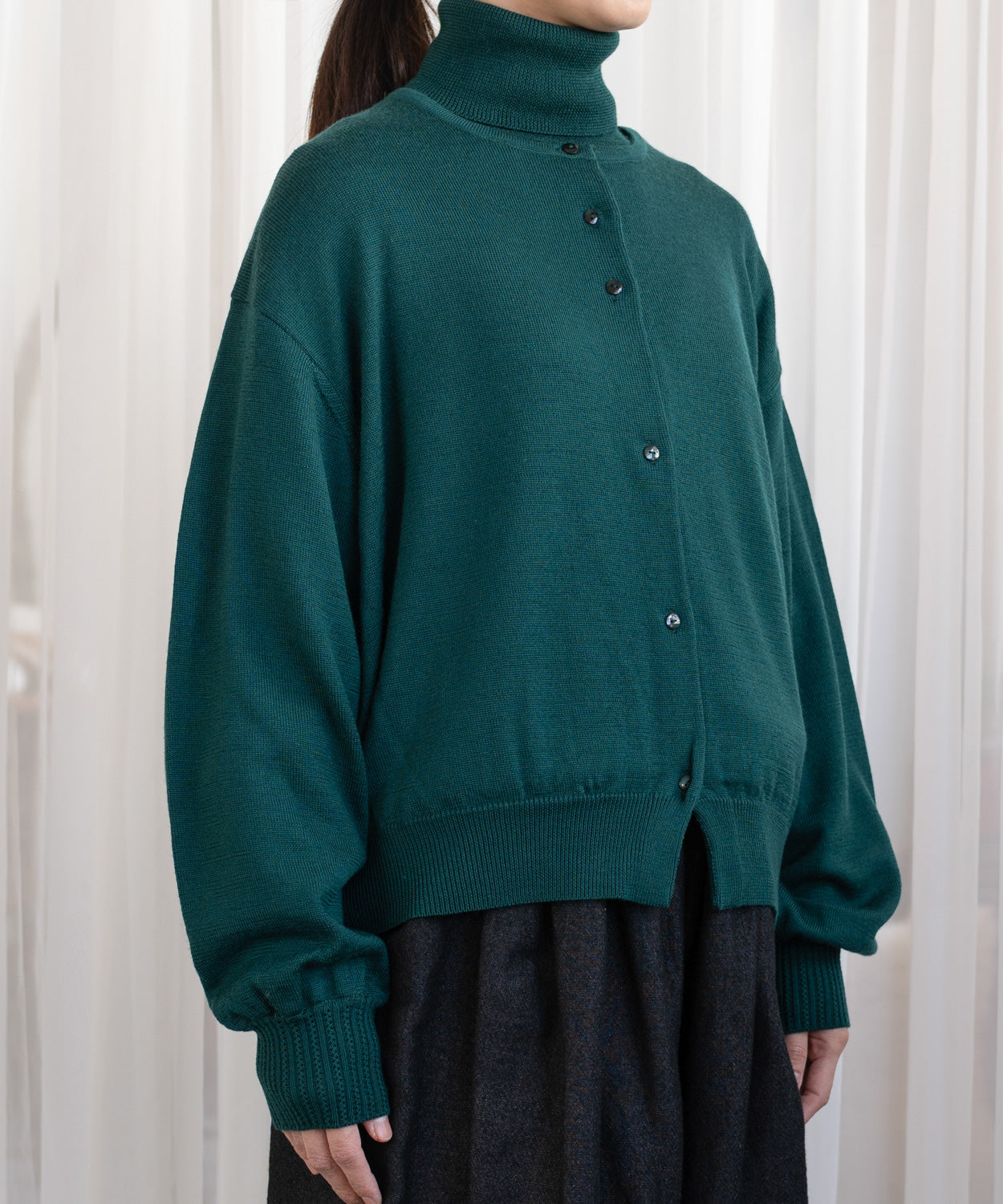 厳選されたエクストラファインメリノウールをつかって、イタリア・ビエラスタイルのレシピに基づいて国内メーカーがつくった上質な毛糸を、ハイゲージに編み上げました。空気をたっぷりと含み、ふっくらとした温かみのある風合いと、何よりなめらかで上品な光沢がとても特徴的です。