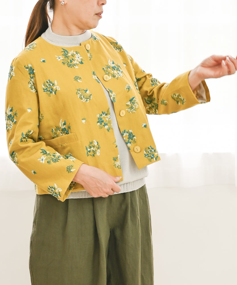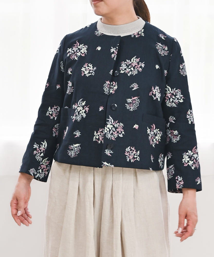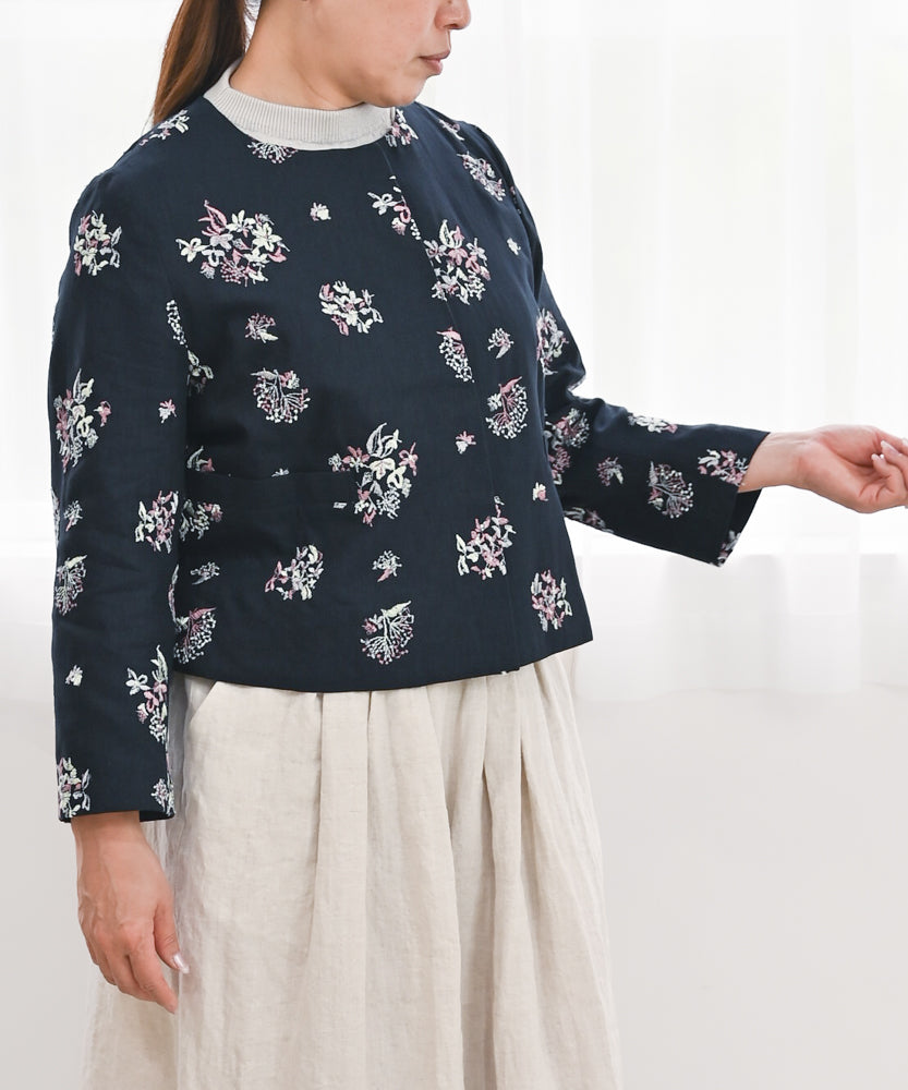〈遠州織物 コットンリネン〉野小花刺繍 ノーカラージャケット (muh504)