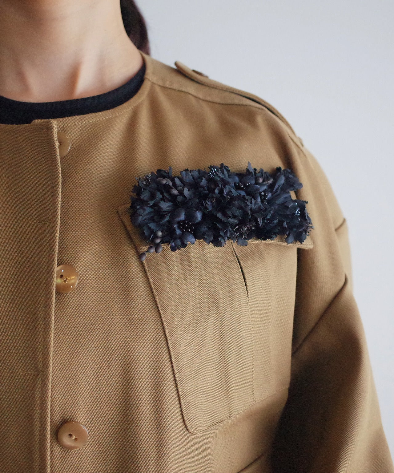 繊細ながらも美しい花ブローチは、コディネートを引き締めます。