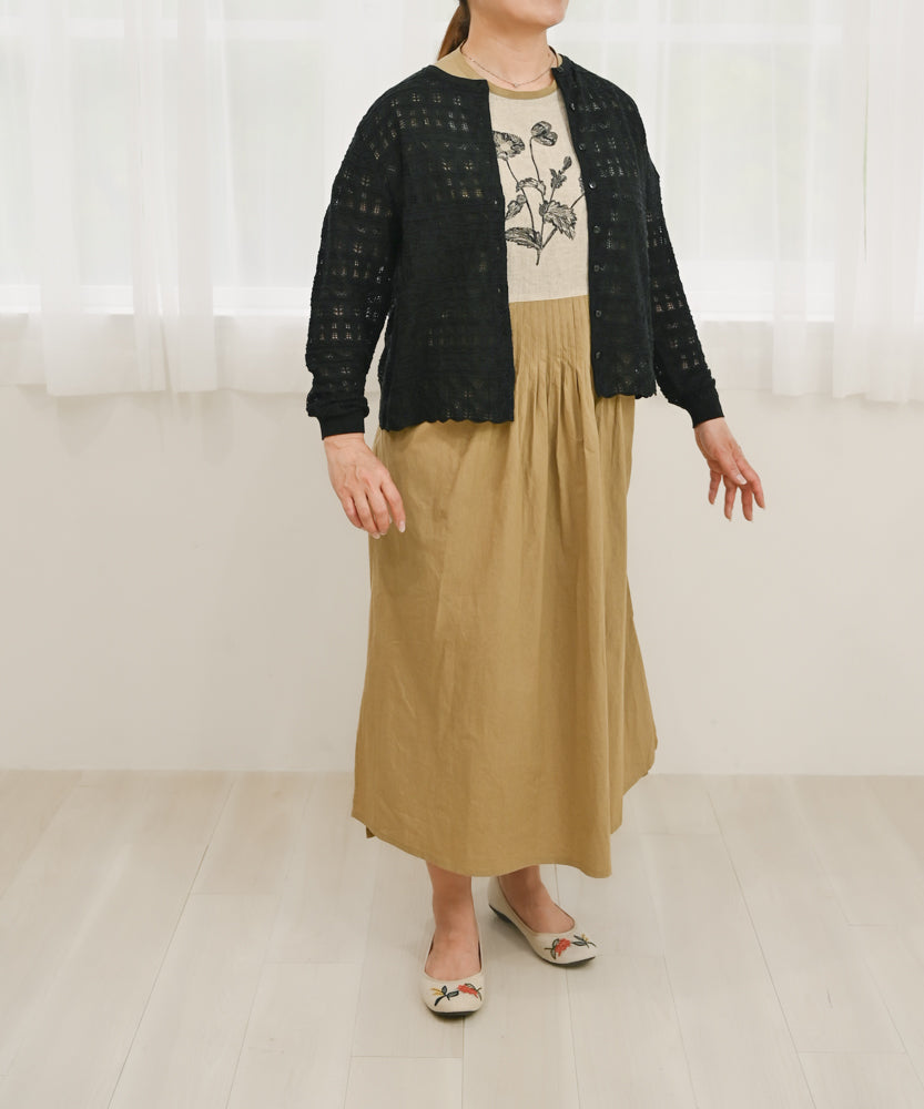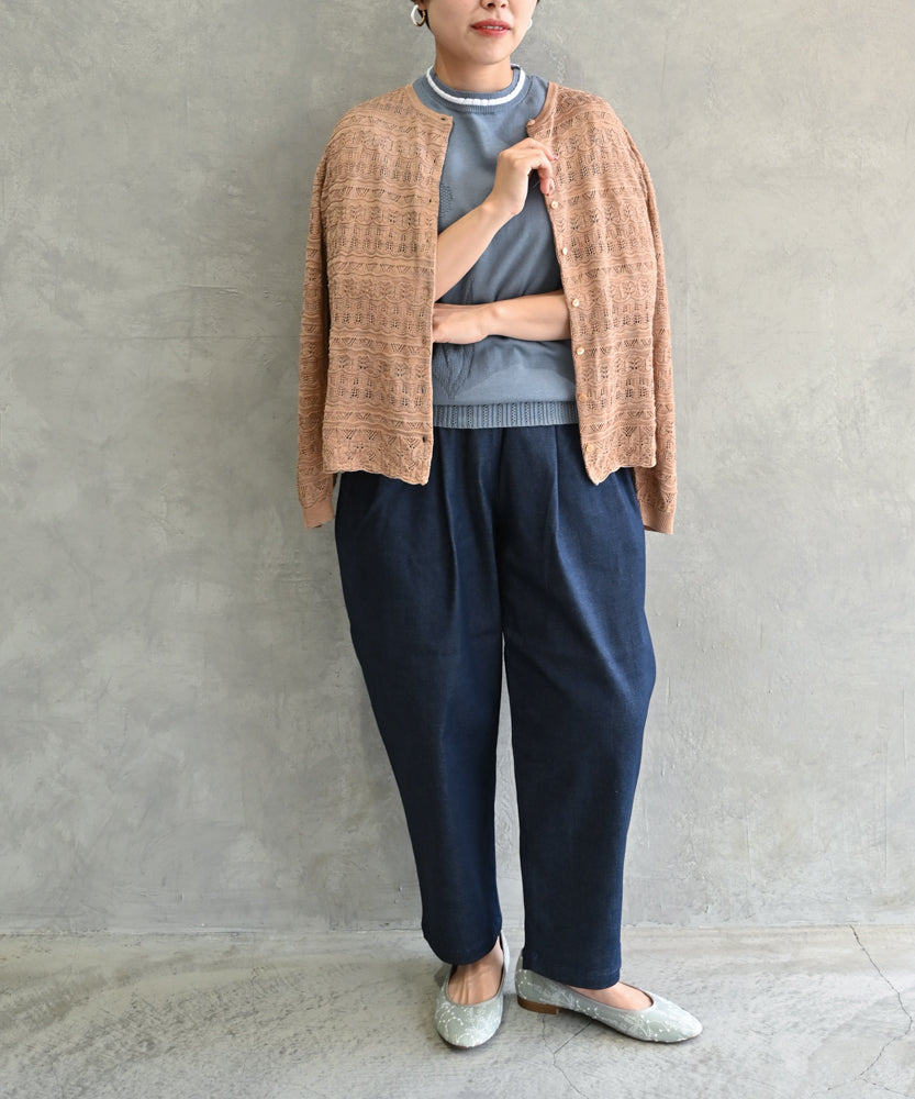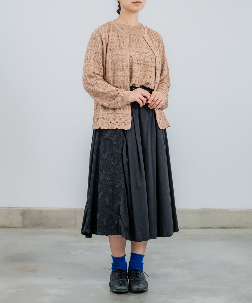 こちらの透かし編みニットは、国内メーカーがつくる上質なシルク100%の糸を使用してお作りしています。うっとりするほど滑らかな肌触りです。