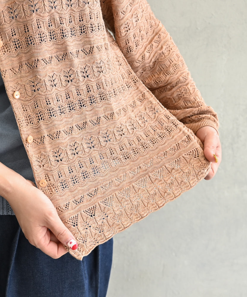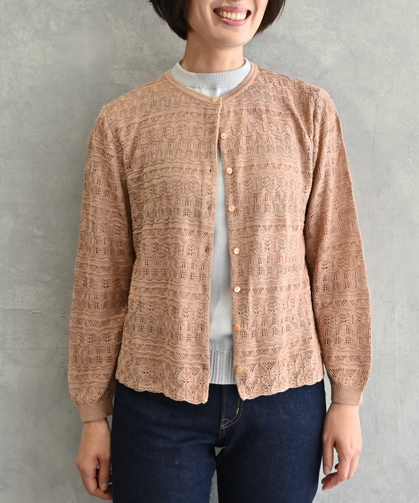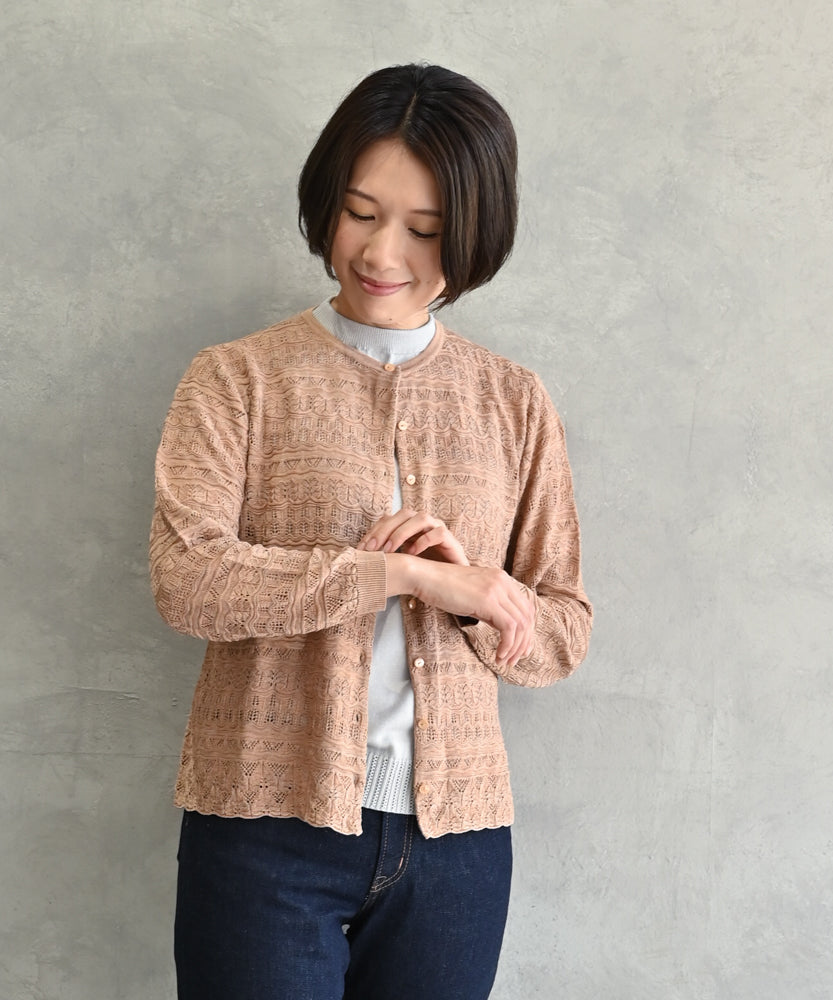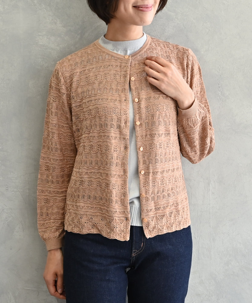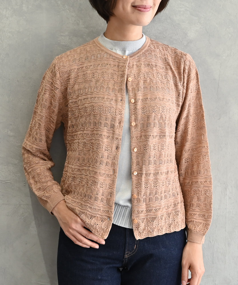 〈最高級品質シルク100%〉〈通年着られる〉透かしレース編み 袖リブあり シェルボタン使用 シルクカーディガン (mub425)