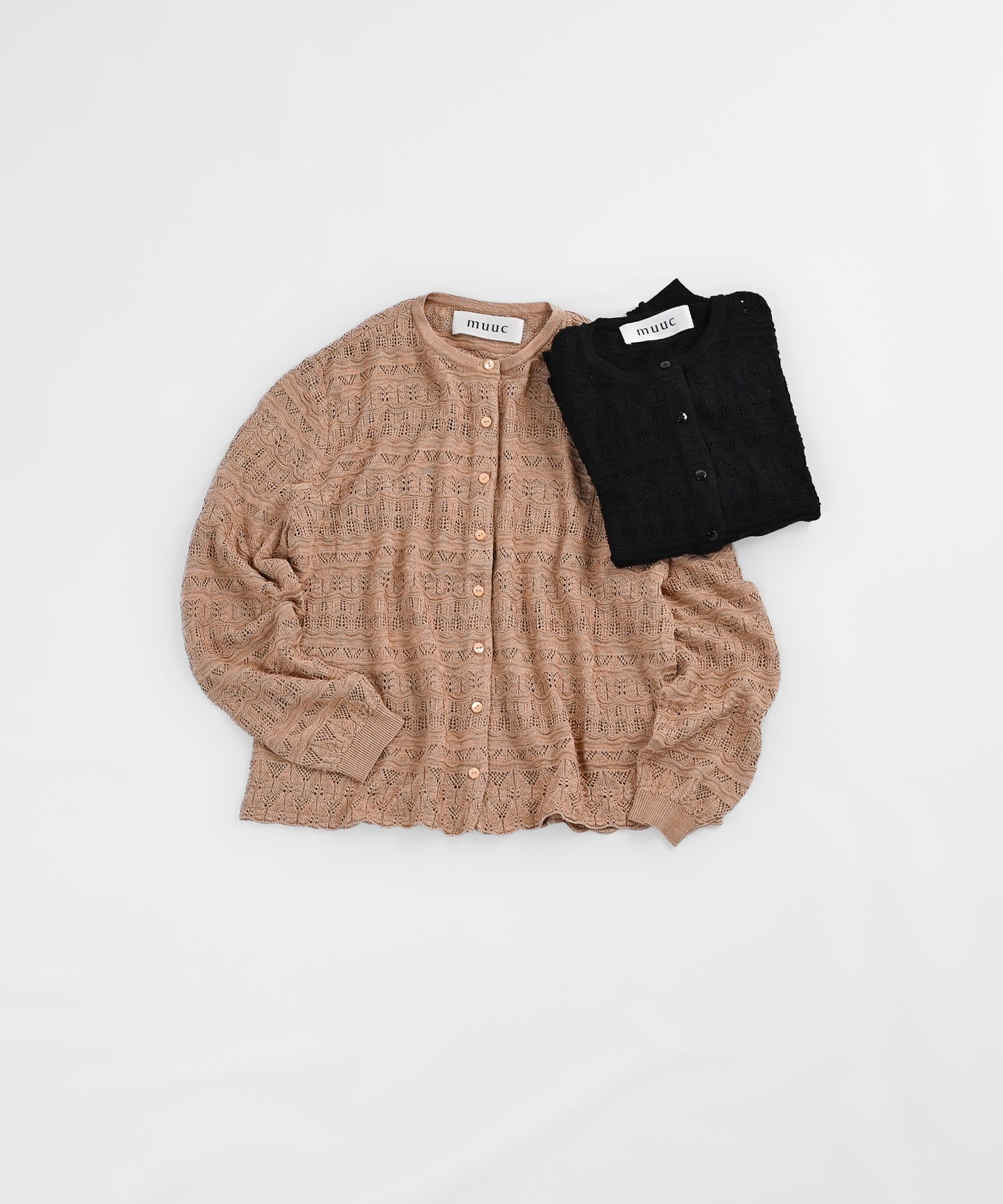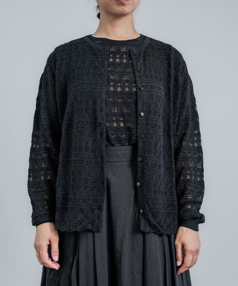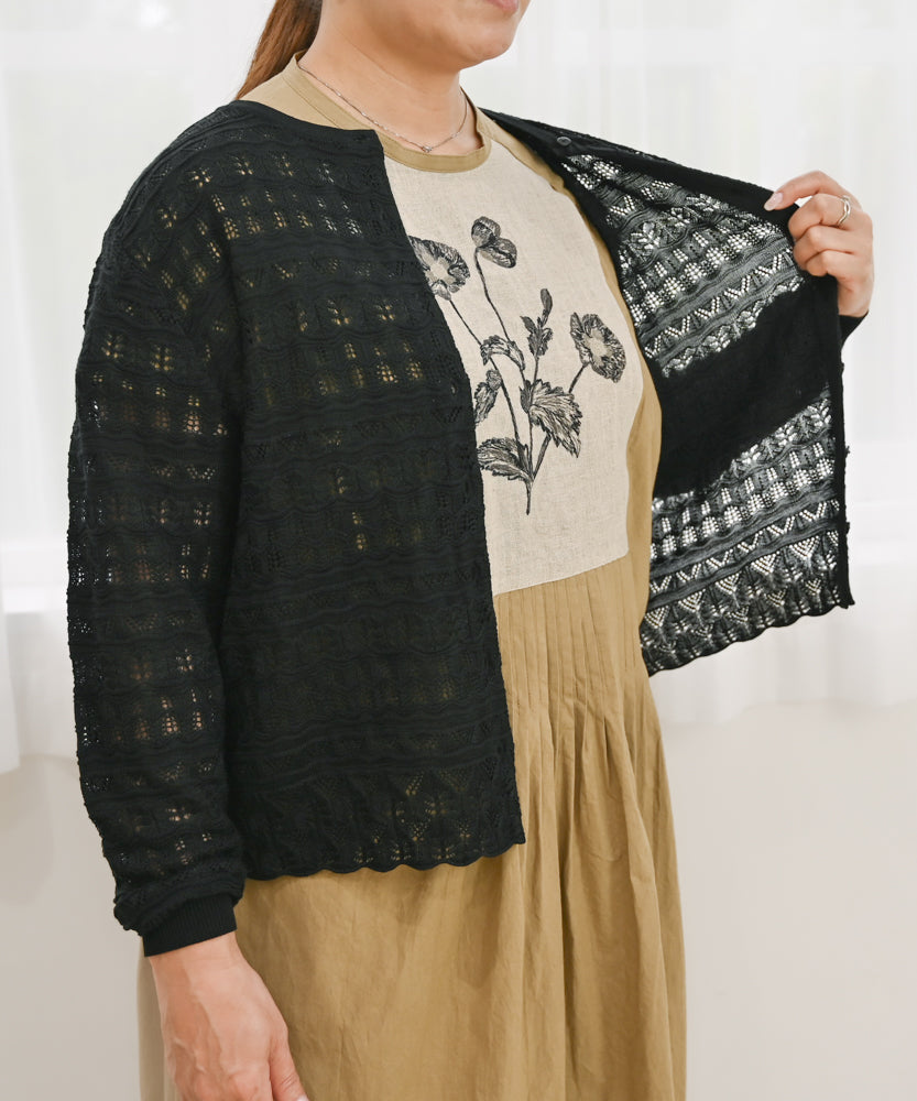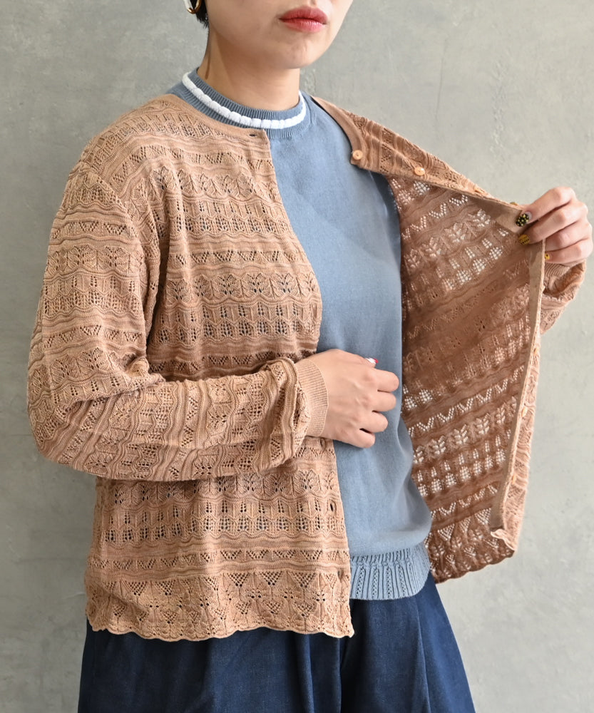 〈最高級品質シルク100%〉〈通年着られる〉透かしレース編み 袖リブあり シェルボタン使用 シルクカーディガン (mub425)