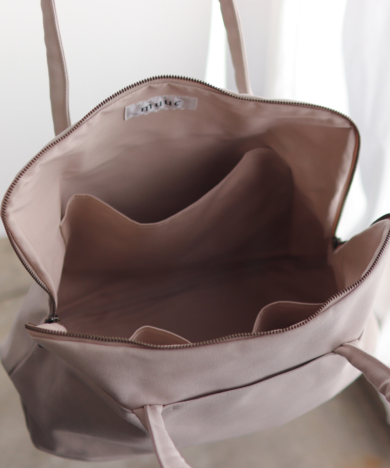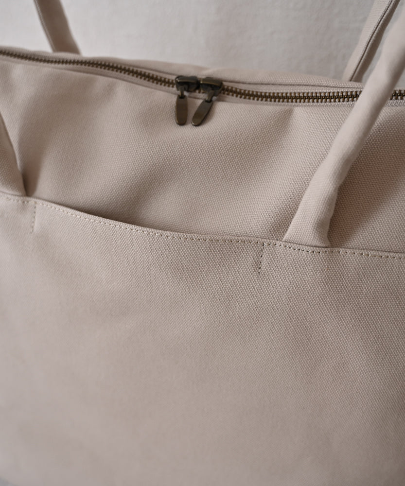 A4サイズの用紙・クリアファイルも楽々入るサイズで、小旅行にも使えるぐらいのたっぷり容量です。ポケットは外側に1箇所、内側に大きいサイズ1箇所、中サイズ2箇所。バッグの中が整理できて便利です。ファスナーはダブルジップで、両サイドどちらからでも開けられます。持ち手はレザー素材で、肩にかけることができる長さです。