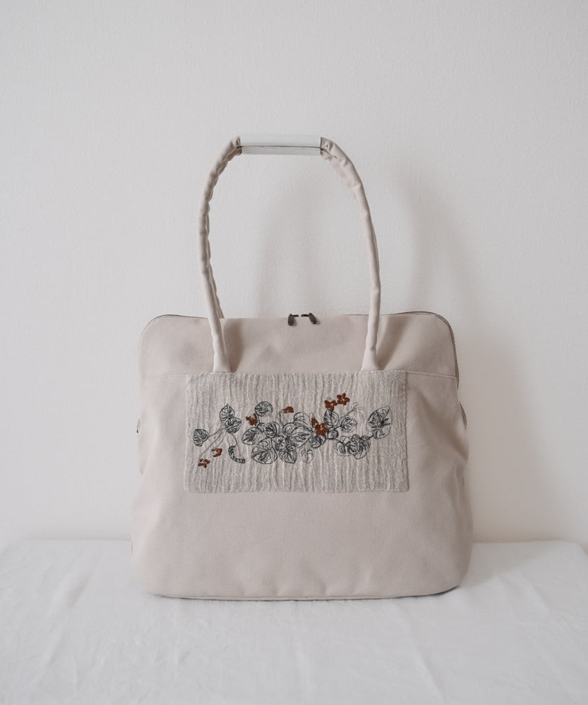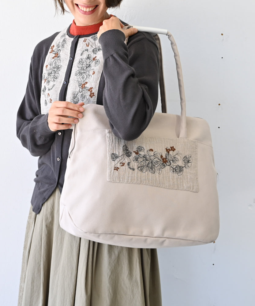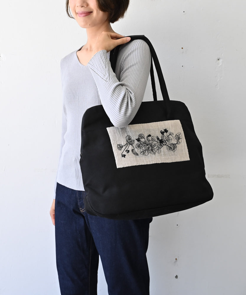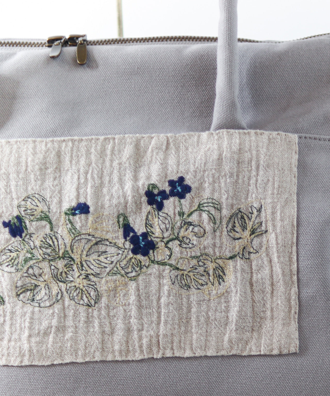 〈肩かけ可〉〈A4書類可〉〈たっぷりマチあり〉〈ファスナー開き〉〈複数ポケットあり〉〈持ち手レザー〉スミレ花刺繍 ビッグサイズバッグ (mud025)