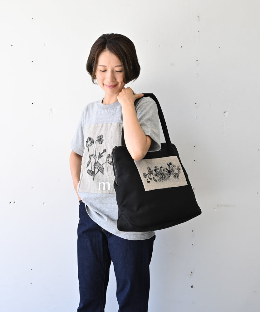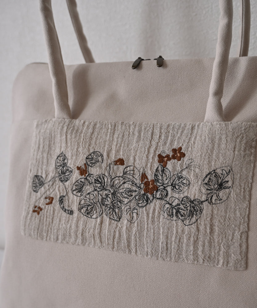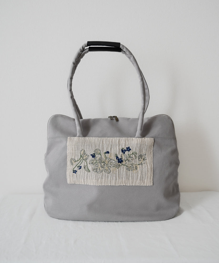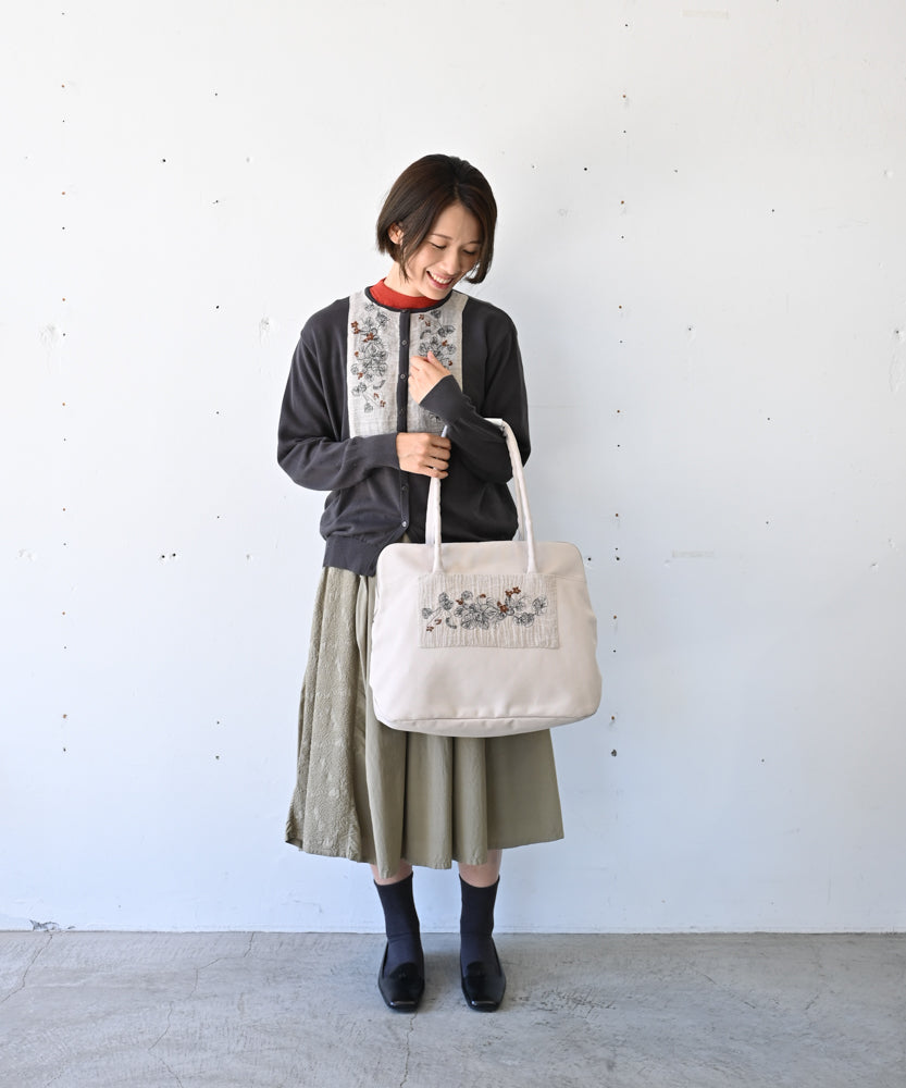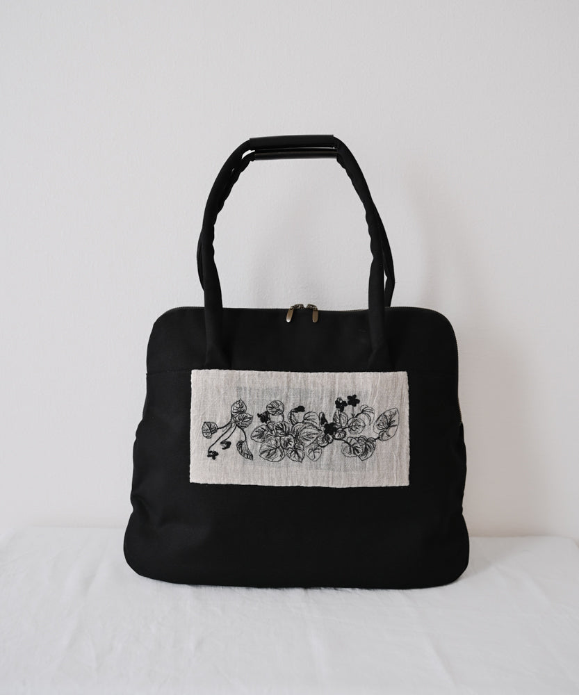 〈肩かけ可〉〈A4書類可〉〈たっぷりマチあり〉〈ファスナー開き〉〈複数ポケットあり〉〈持ち手レザー〉スミレ花刺繍 ビッグサイズバッグ (mud025)