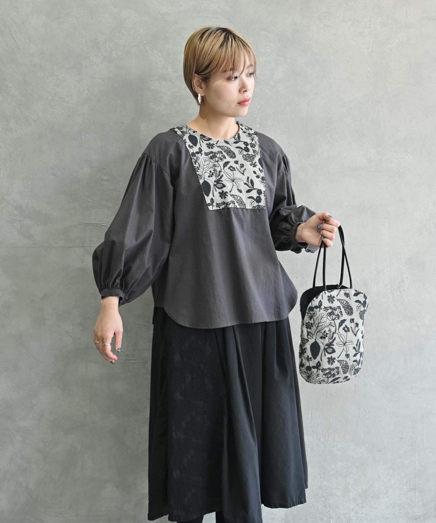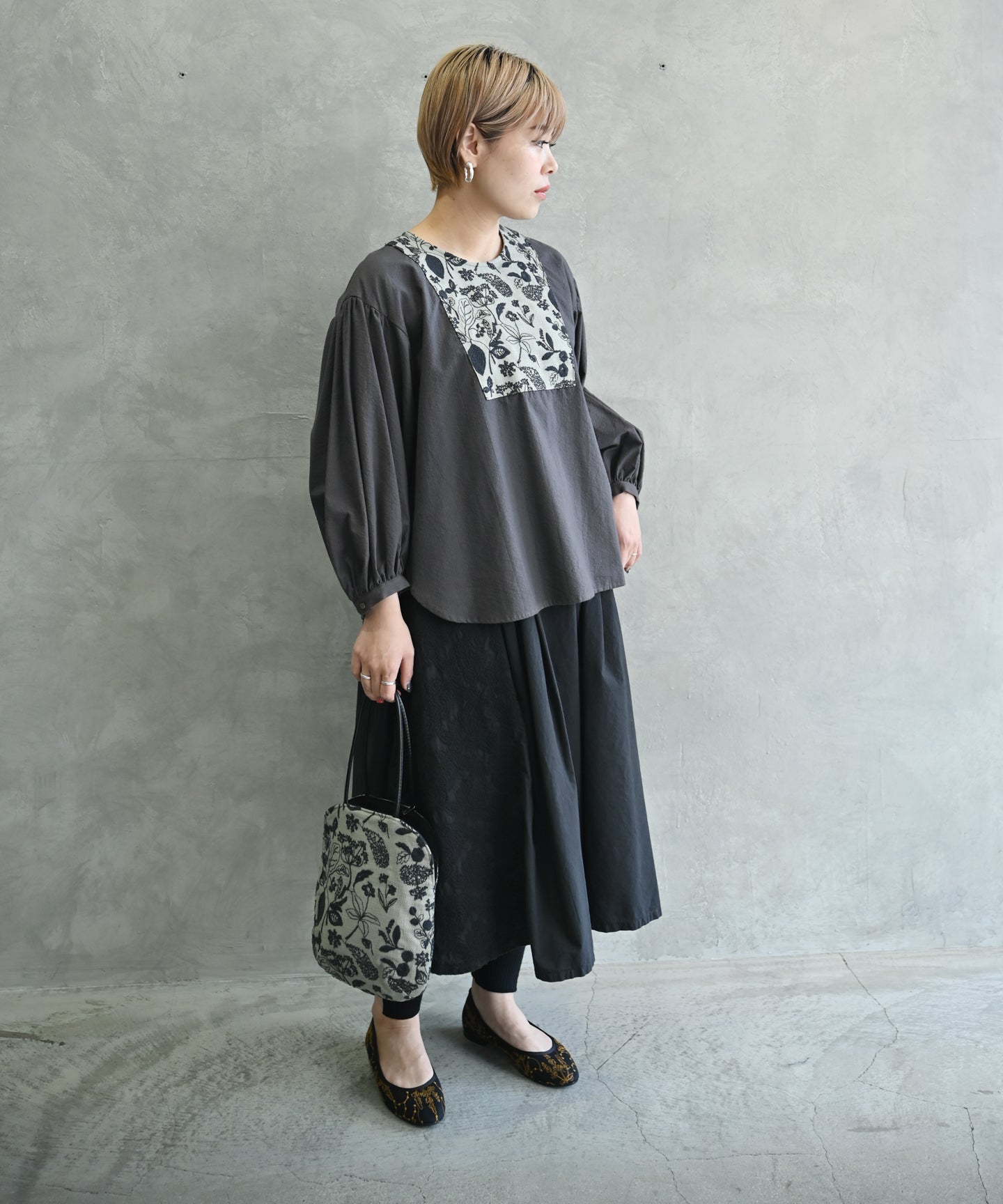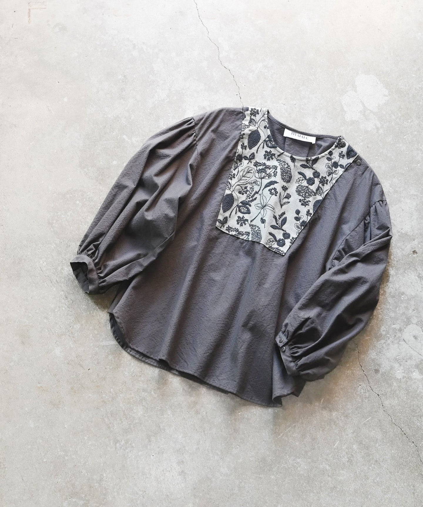 プルオーバータイプのブラウスです。左肩開きなので着脱しやすく、後ろファスナーなどが苦手な方にもお勧めです。身幅や肩まわりや袖にもゆとりがたくさん入っているため、様々な体型の方に着ていただけます。ホワイトには多配色の刺繍、グレーにはシックなブラック刺繍を施しています。