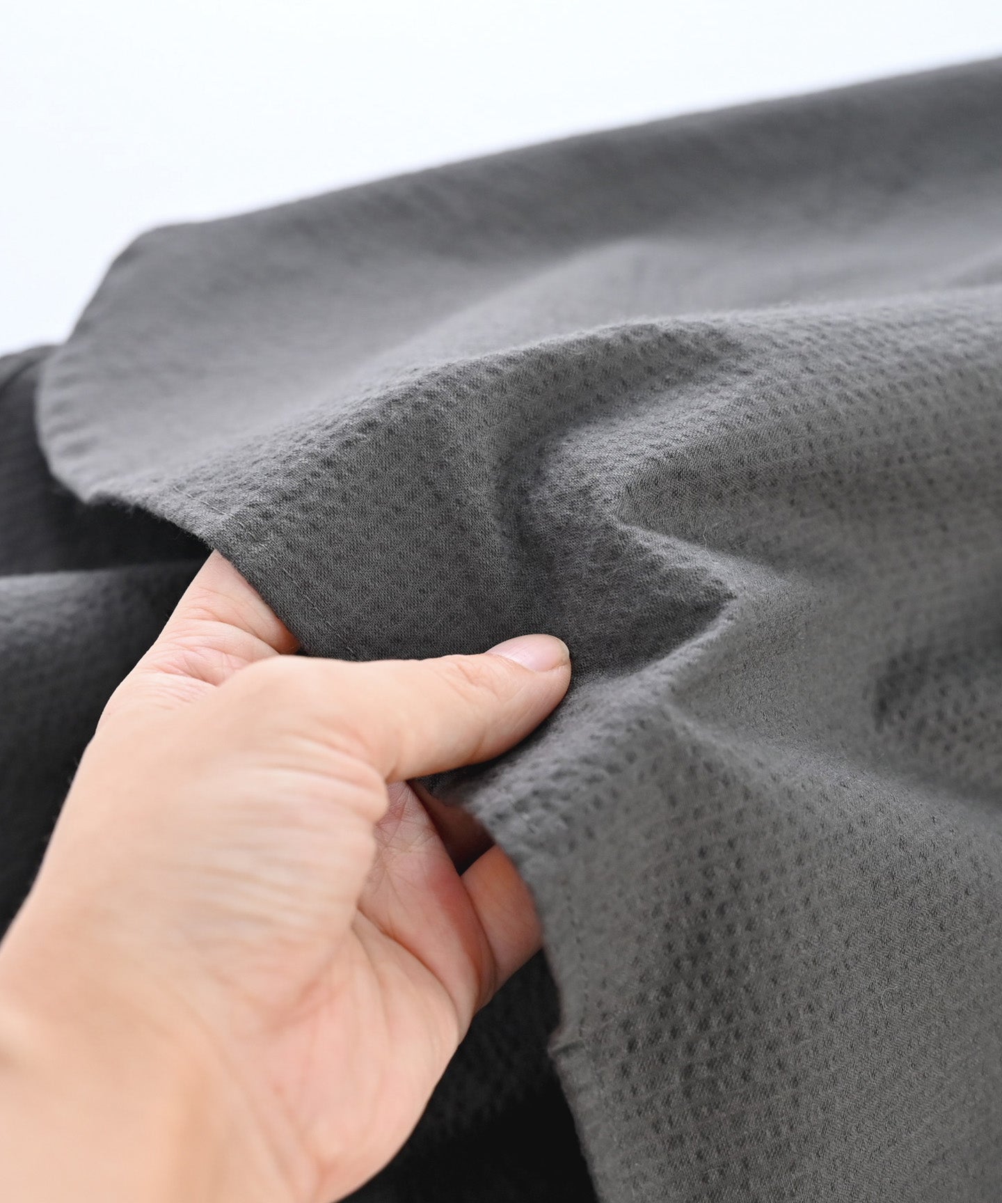 静岡県浜松市の遠州織物の工場で作られた上質なコットン生地を使用しています。長い時間と手間をかけて、生地を数回にわたり揉み練り芯から解し、ふんわり優しい肌触りに仕上げています。化学薬品を殆ど使わず環境に考慮した加工でもあります。サッカー生地の凹凸は暑い季節でも肌に程よい距離を保ち、快適な着心地になります。裏地は無く、さらりとオールシーズン着ていただけます。