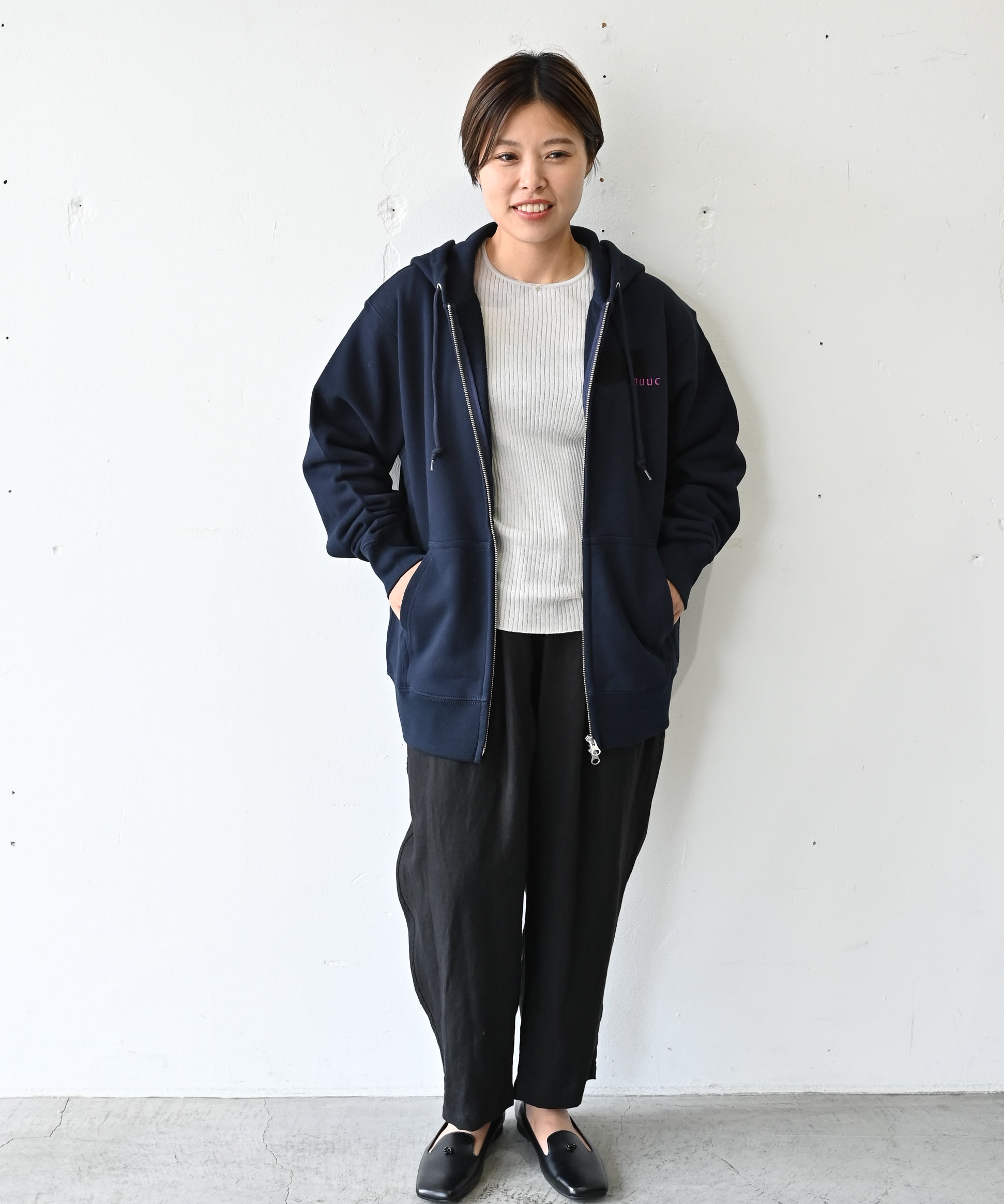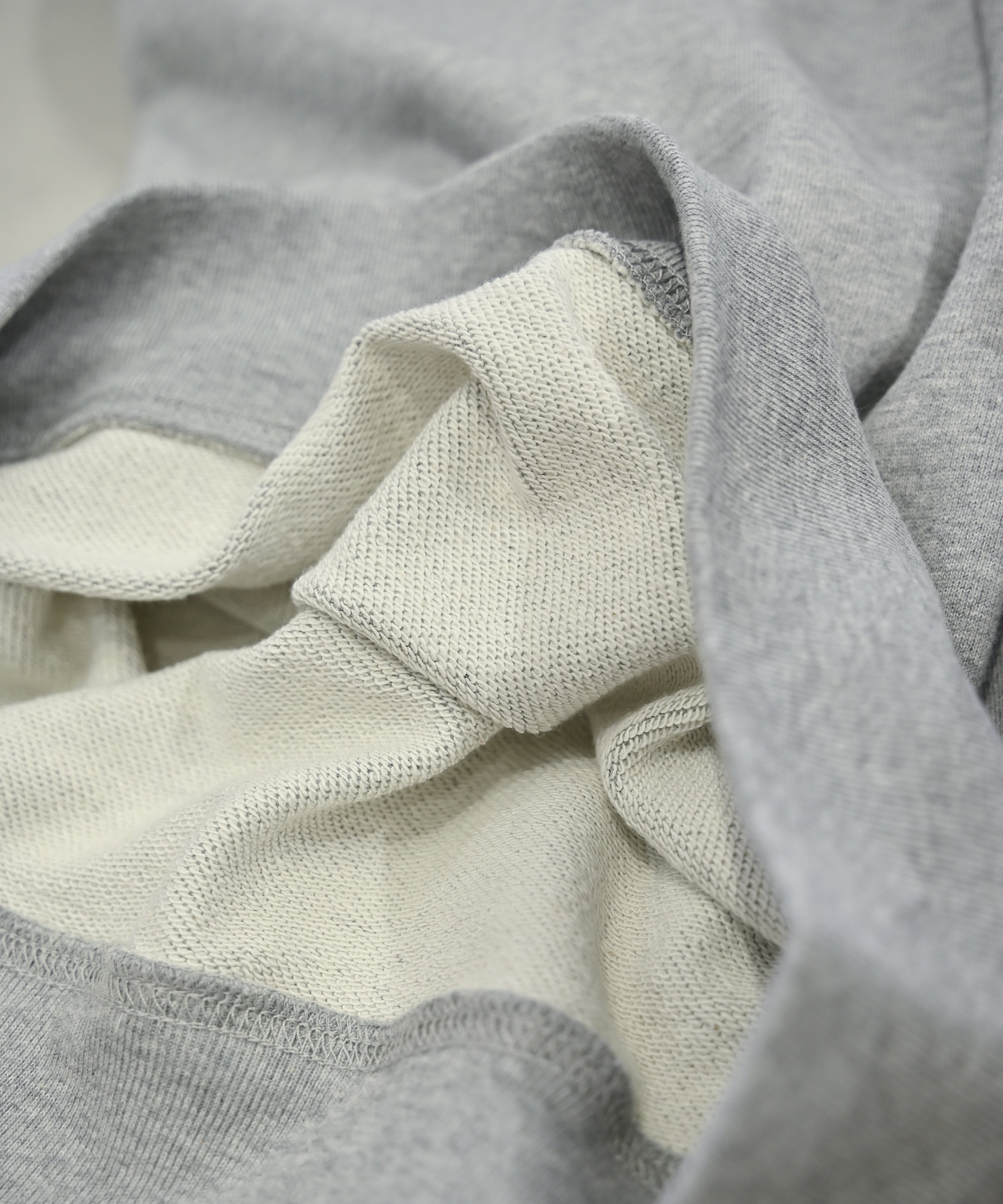 こちらは胸の刺繍がデザインポイントのスウェットシリーズです。生地は、コットン100%のしっかりした厚さの12.7オンス、裏面は肌触りが良く暖かいパイル生地です。ボディは『United Athle』というメーカーの生地を採用し、刺繍は福井県の工場に加工していただきました。
