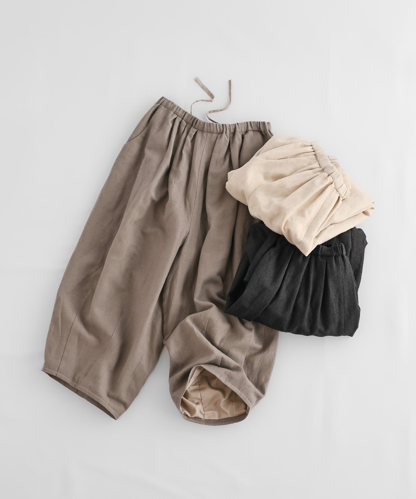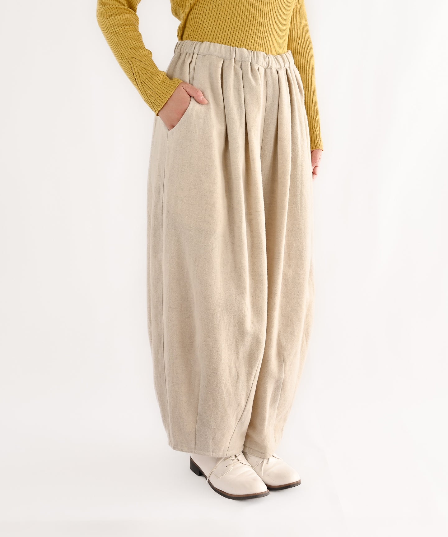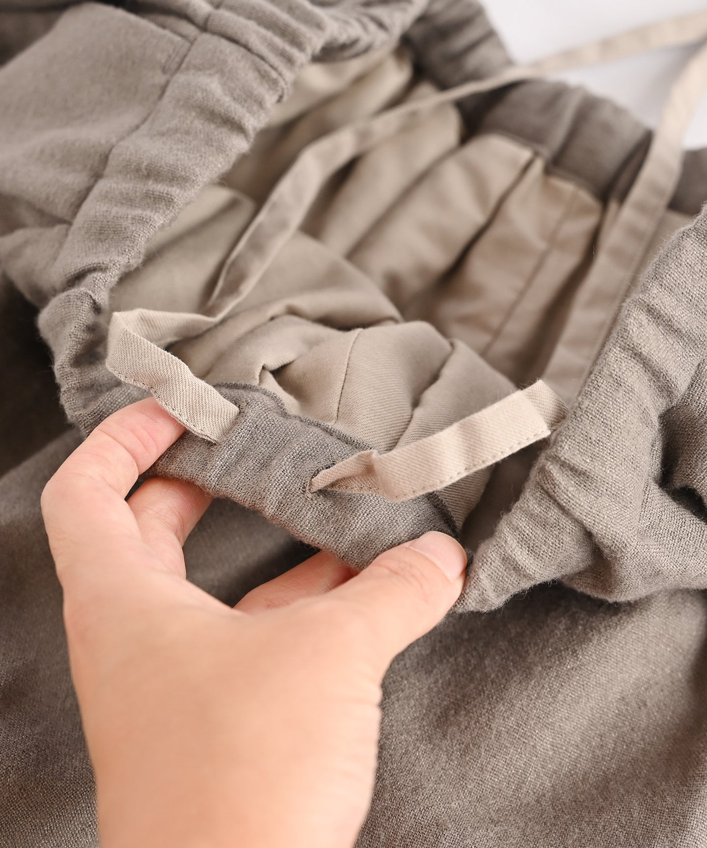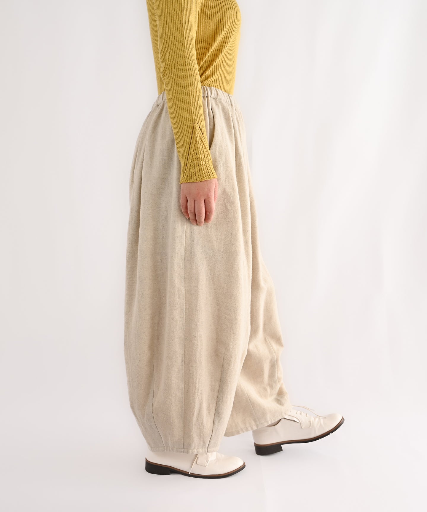 【サイズ】着丈(後ろ中心)88cm /股上39cm /股下47cm /ウエスト70-80cm ※ウエストゴム入りのため伸縮します。また、裏にヒモが通しているので、ウエストサイズの調整が可能です。                                                                                                                         【素材】毛58% 麻42% 【裏地】綿100%