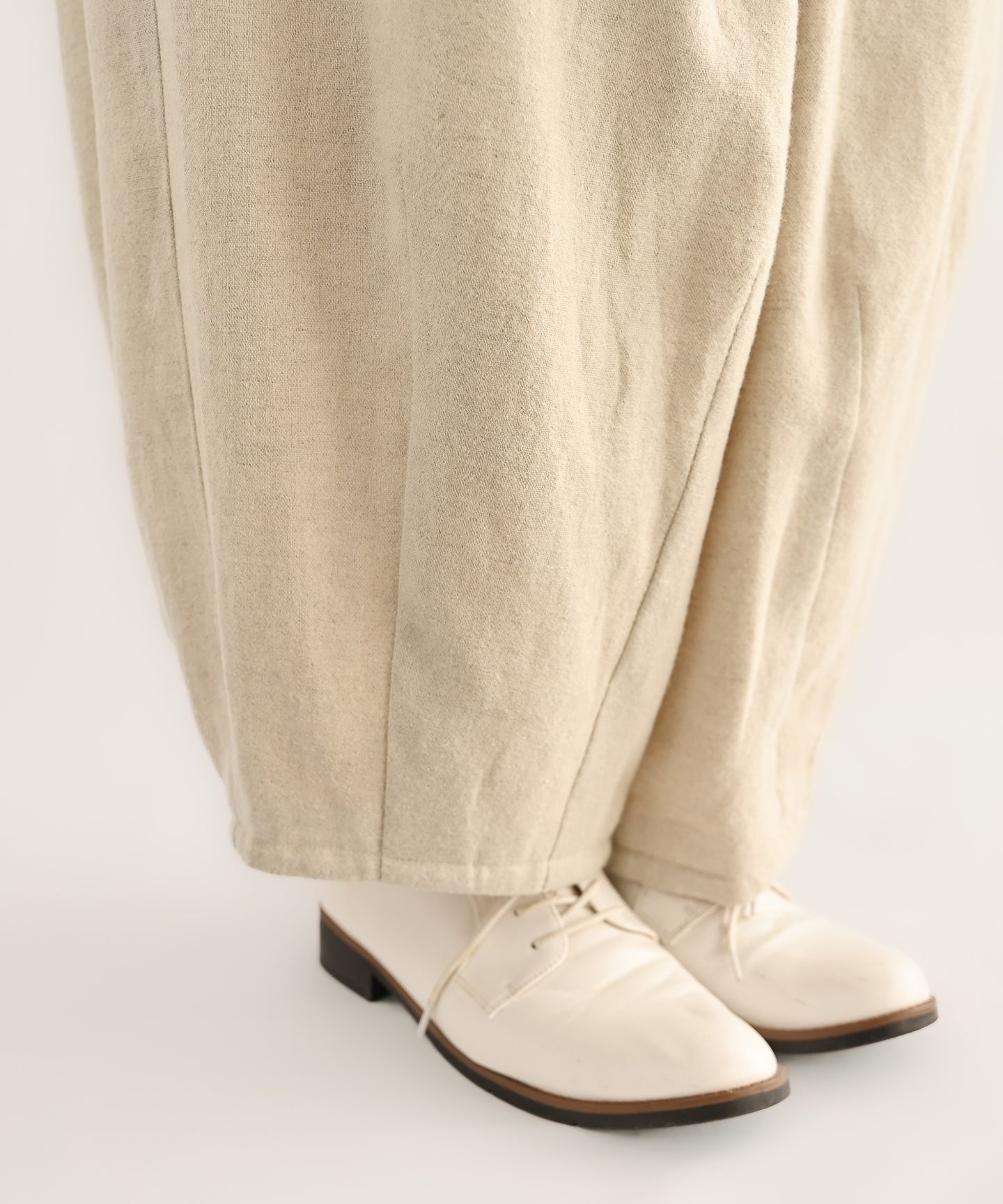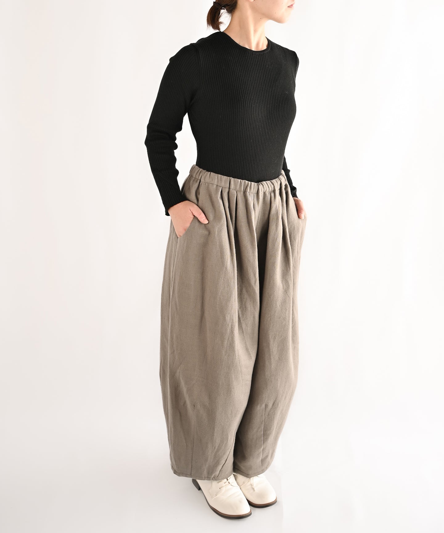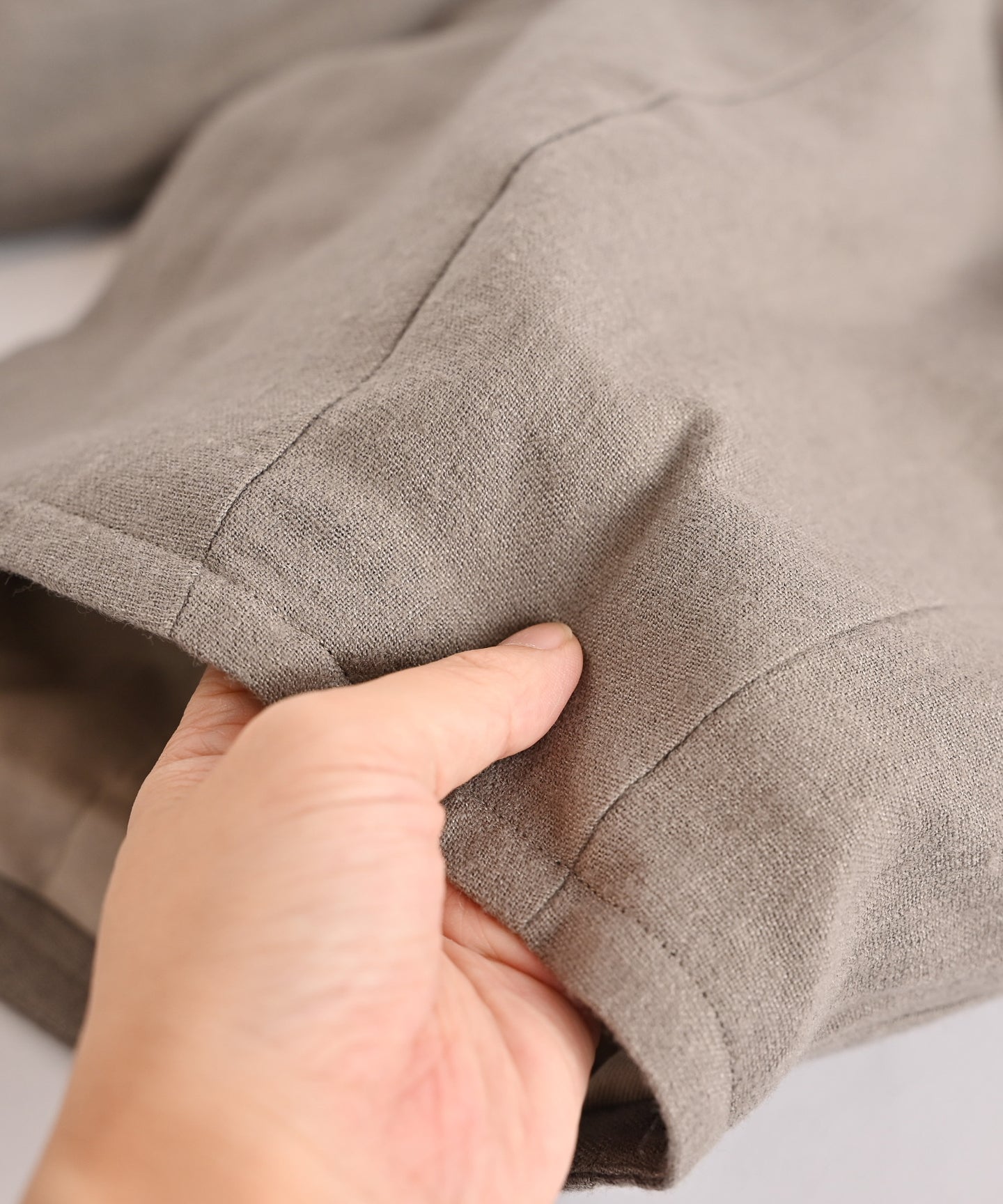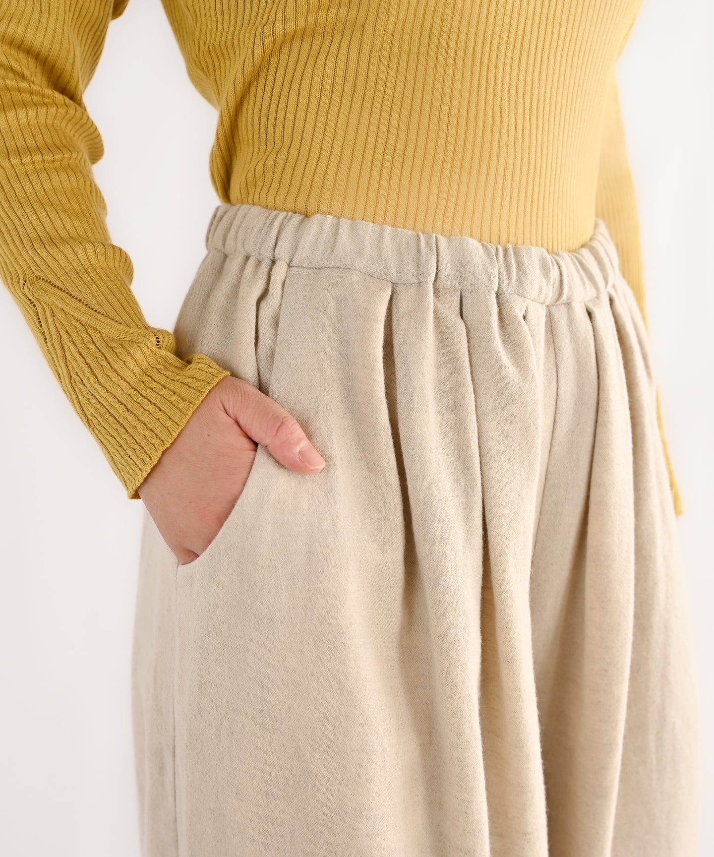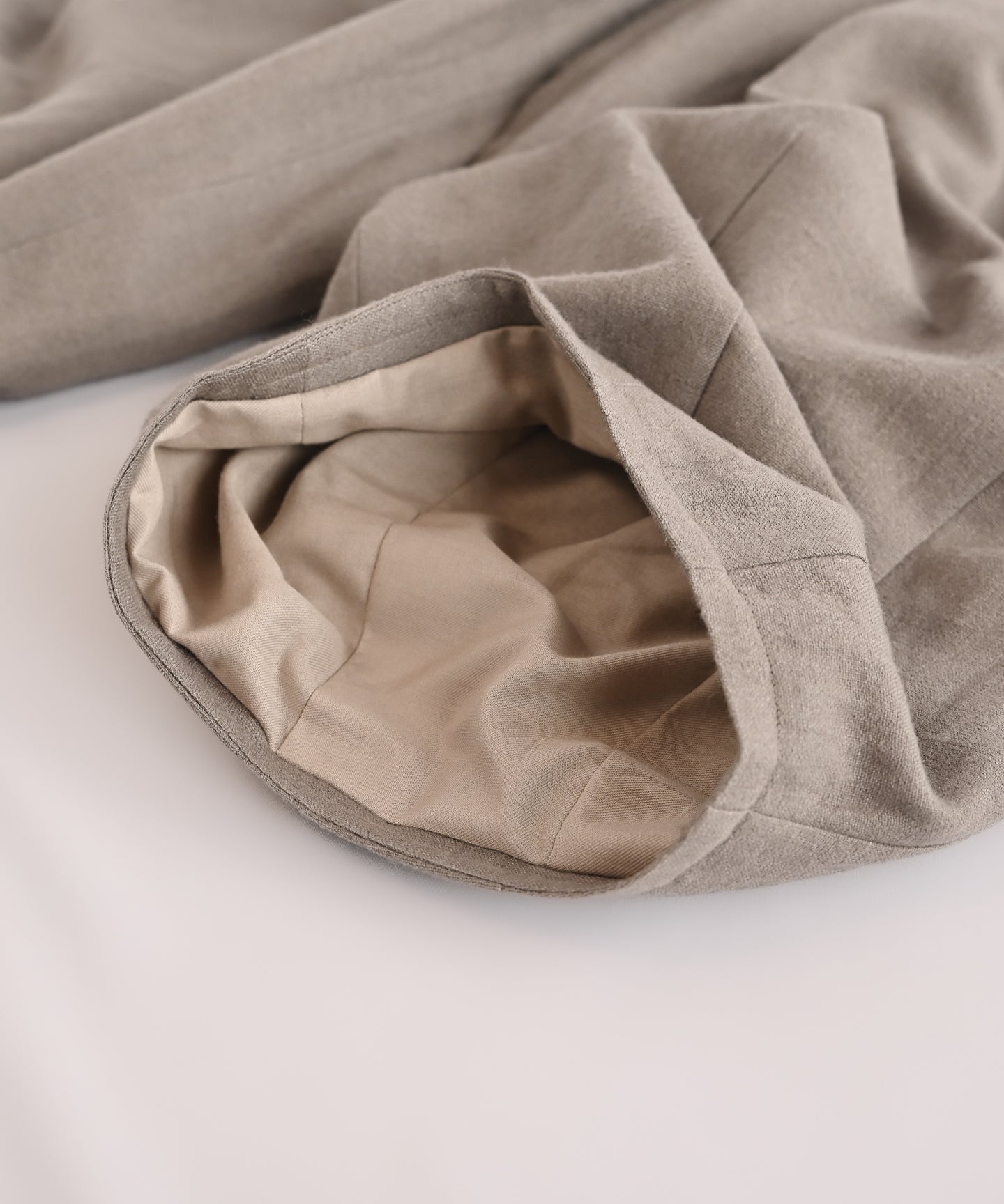 定番人気型をウールリネン生地でお作りしました。きちんと感とカジュアルさを両立したデザインがご好評のパターンです。ワイドな裾は、広がり過ぎず美しいラインを作るために挟む方にもこだわりました。素材感ある優しい色味が様々なトップスに合わせやすく、幅広くコーディネートをお楽しみいただけます
