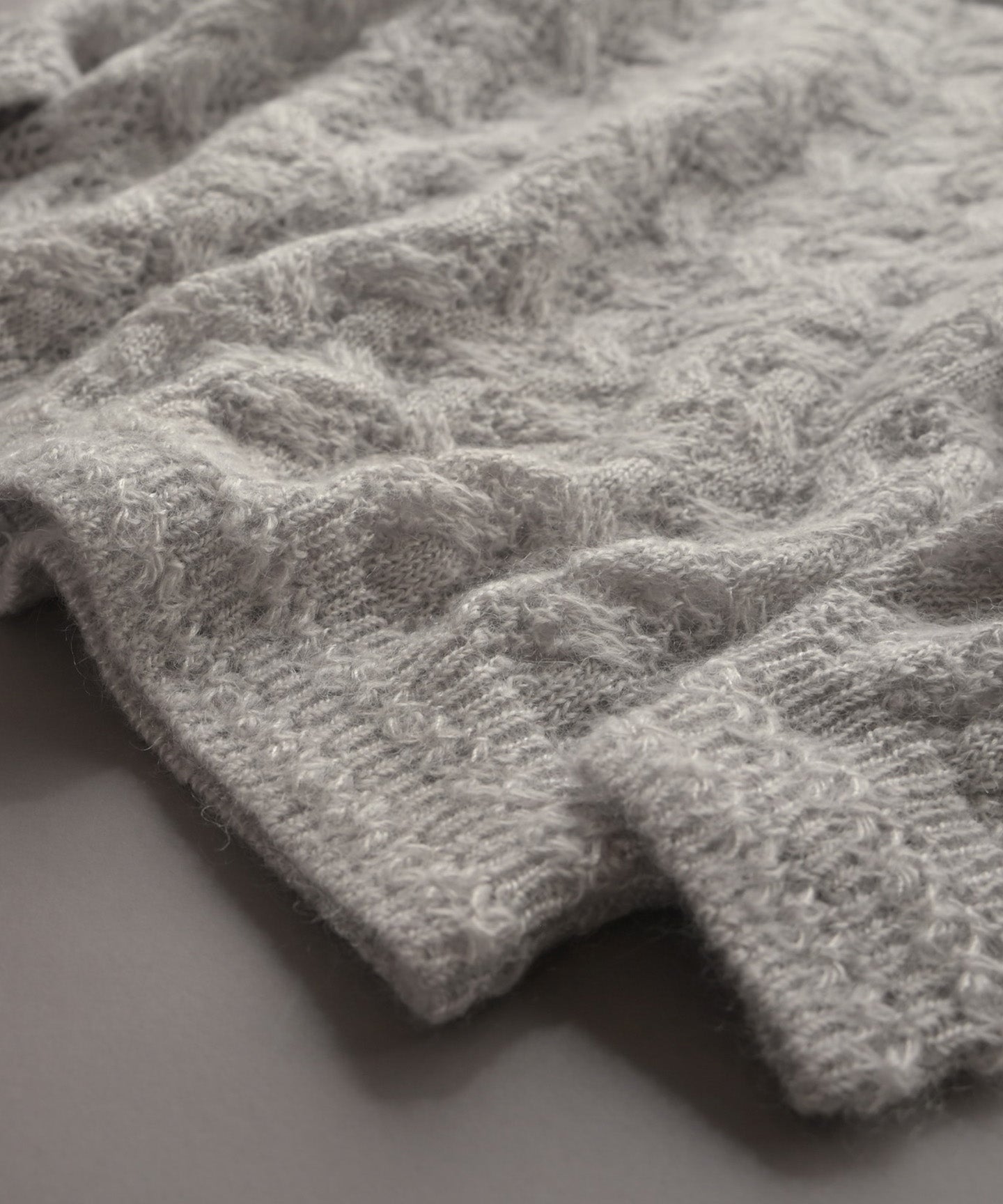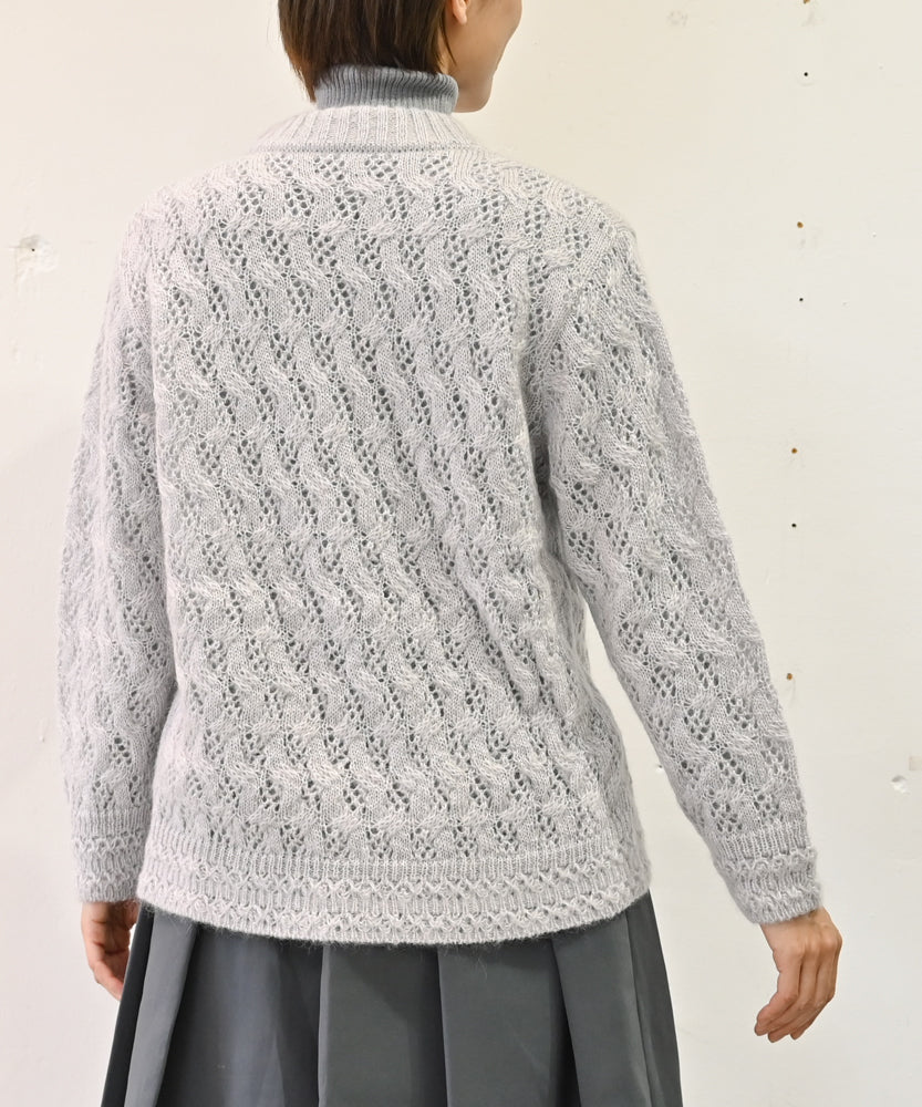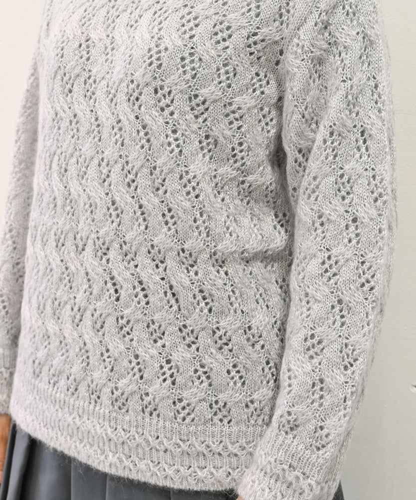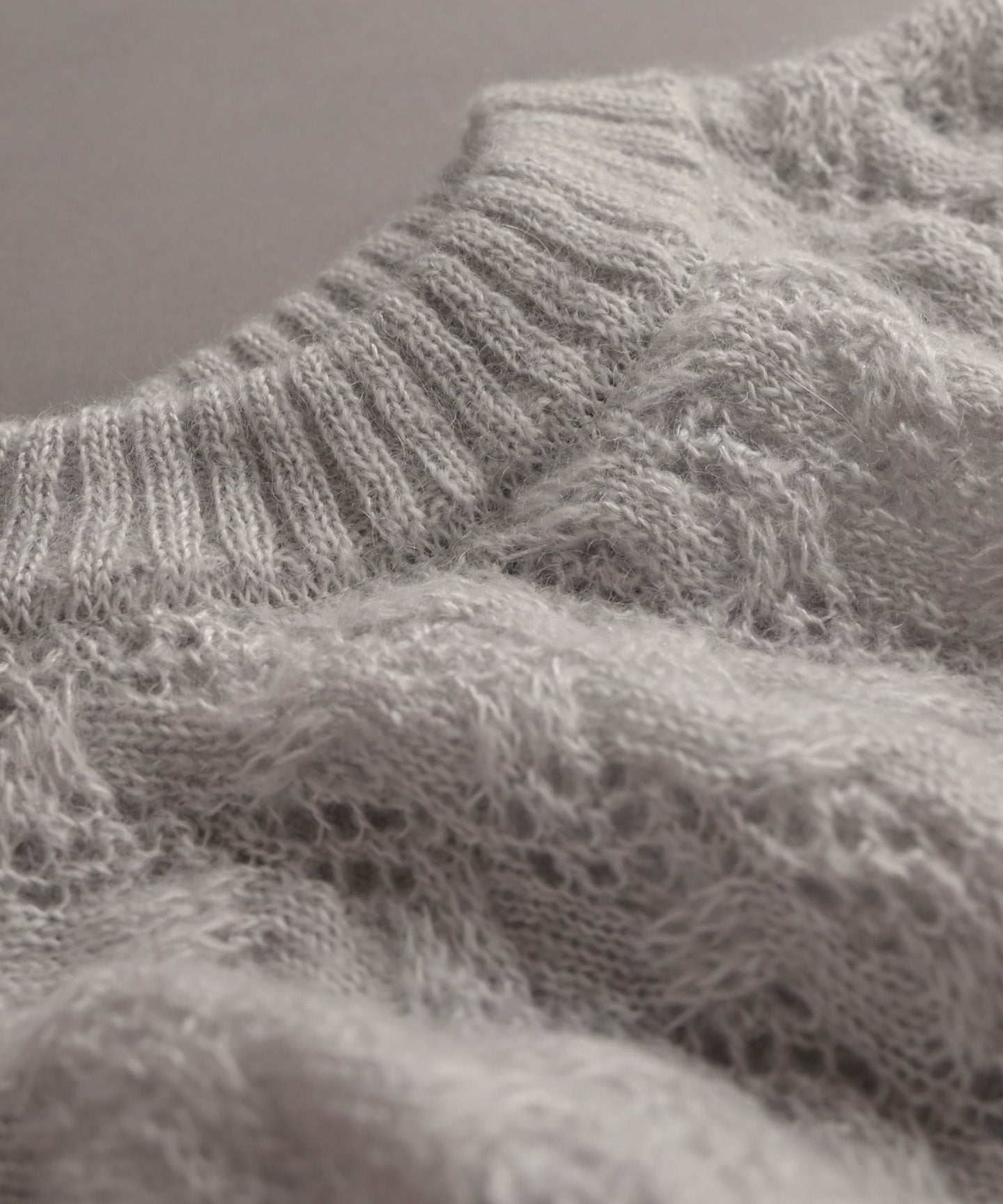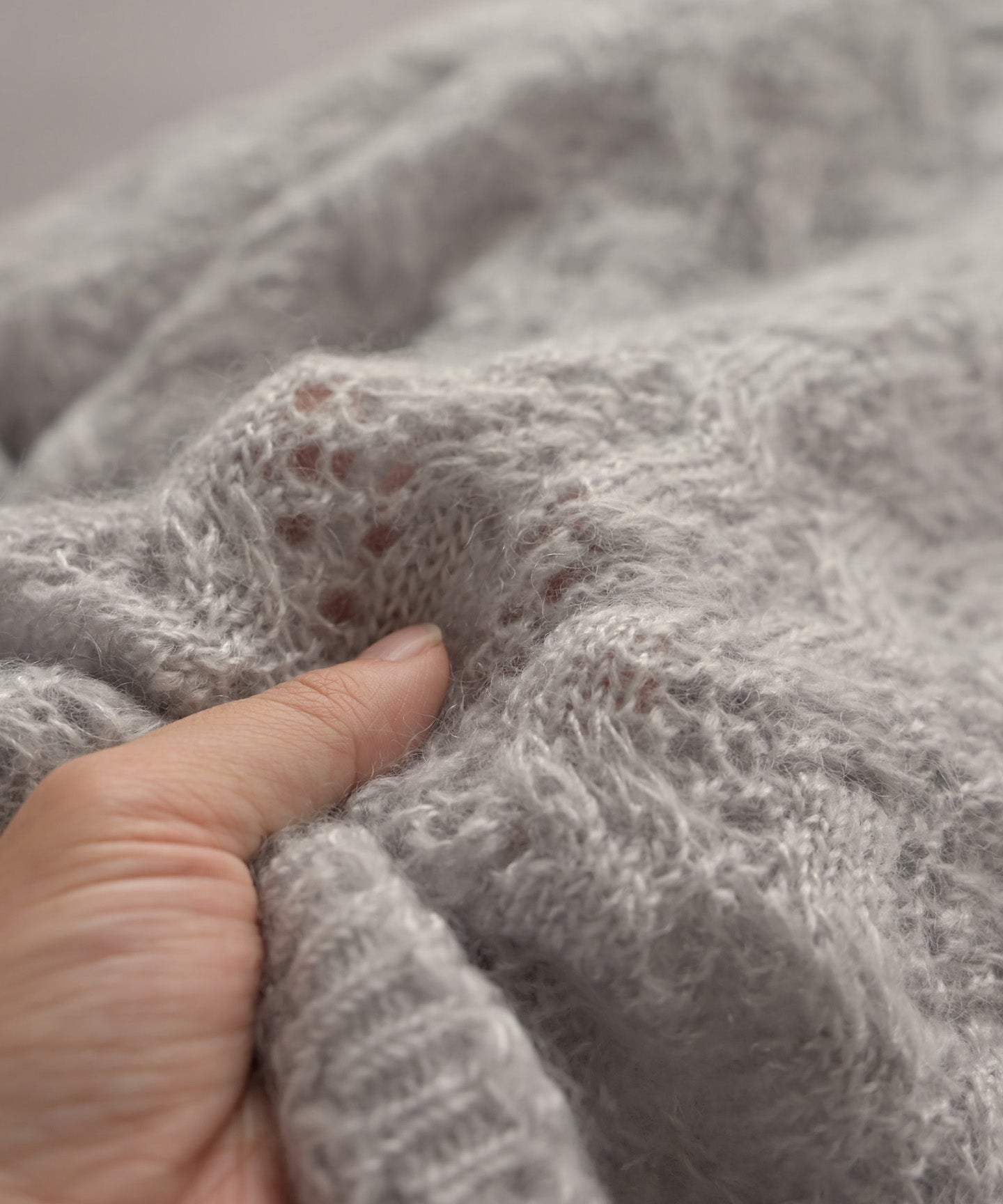 また、非常に技術を要する編み方です。モコモコとしやすいモヘヤ素材をすっきりとした模様編みが抑えて、甘くなりすぎない大人の印象に仕上げました。