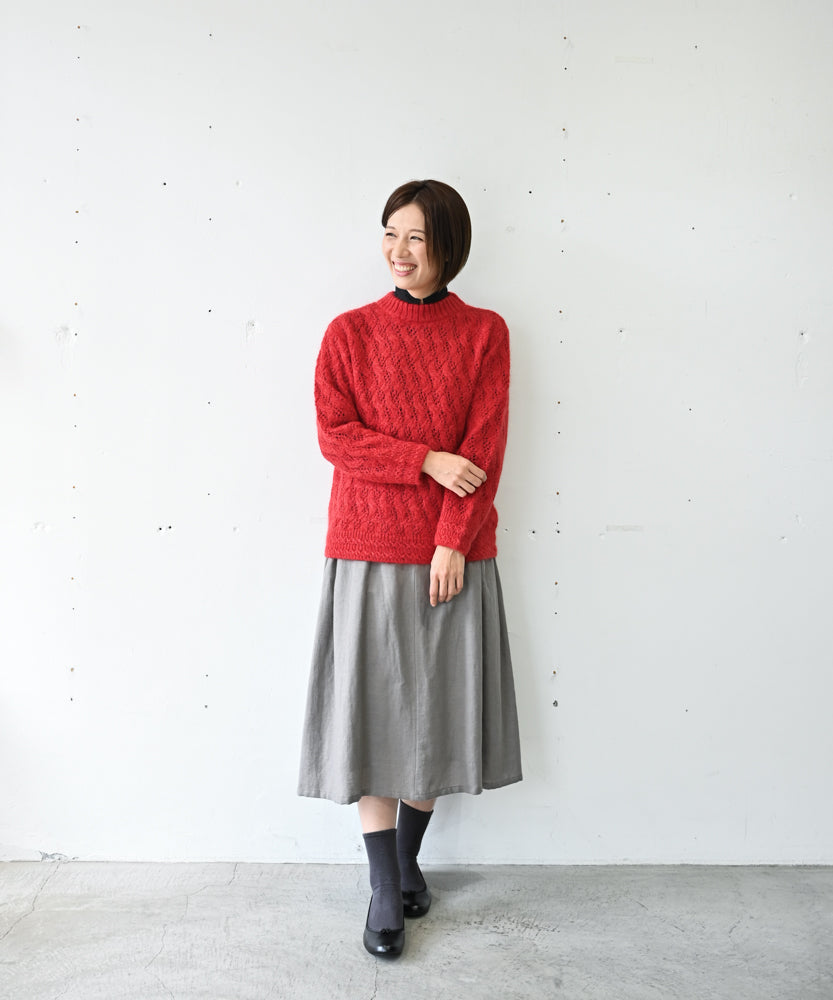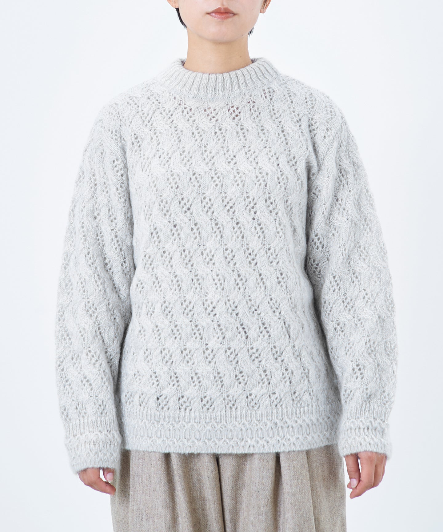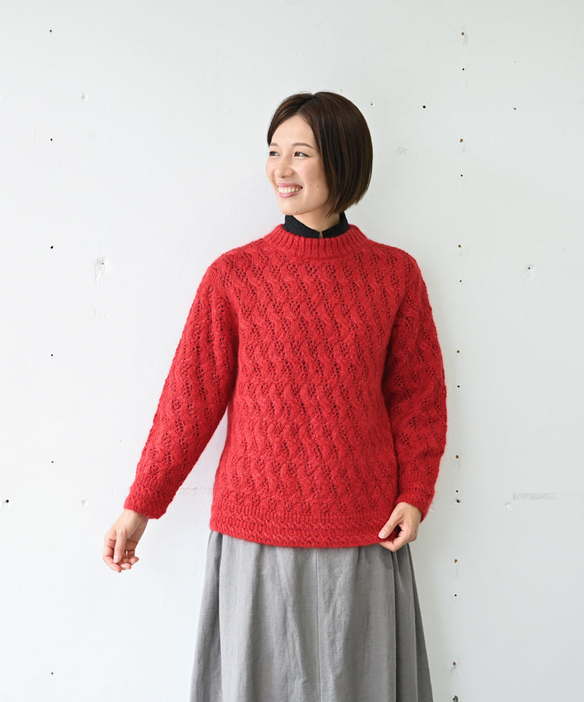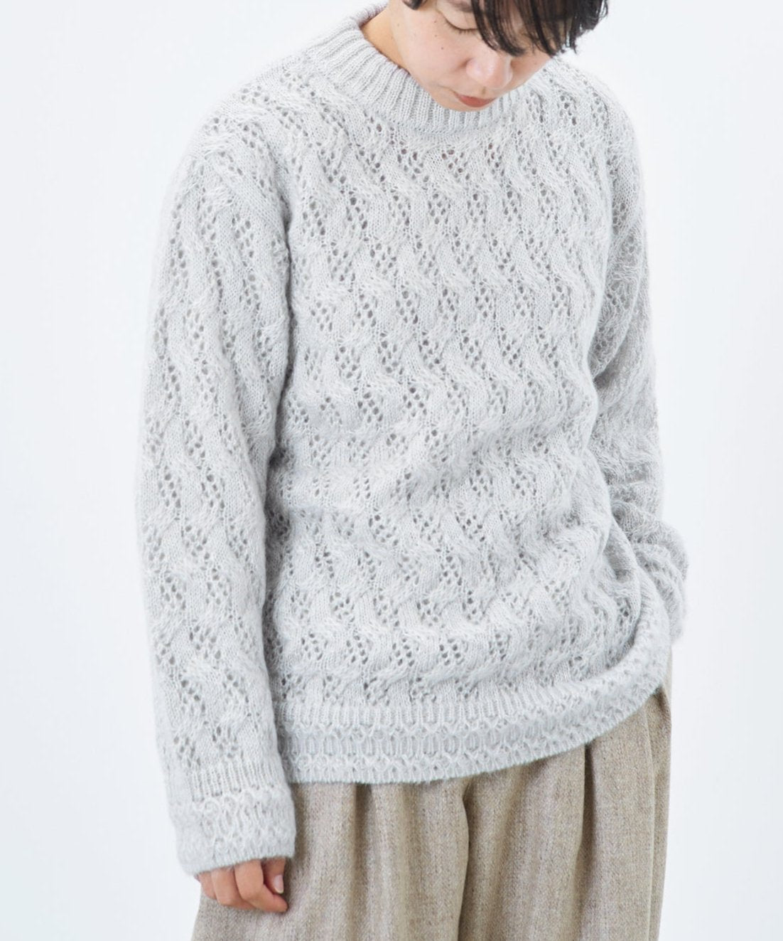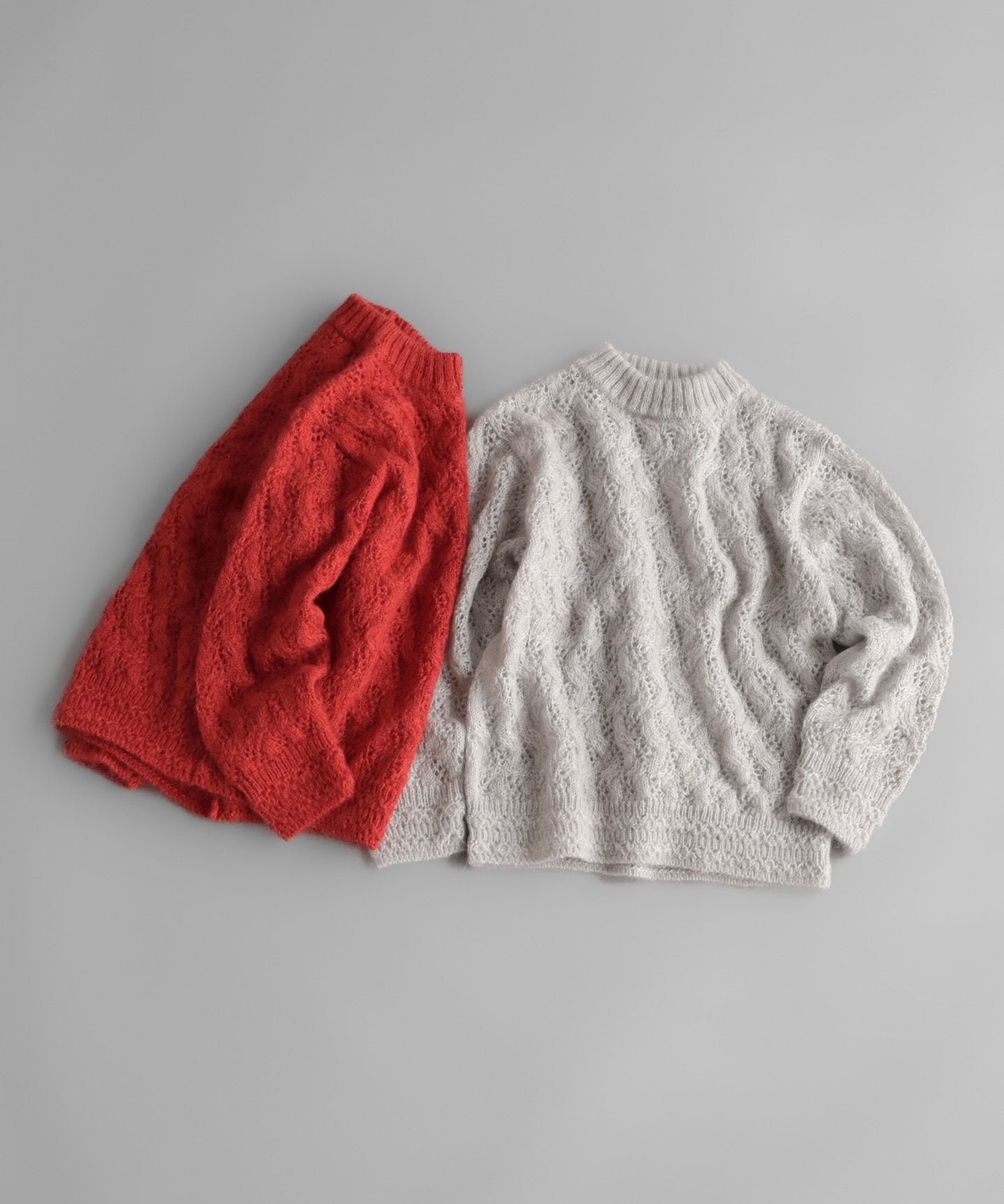 また、非常に技術を要する編み方です。モコモコとしやすいモヘヤ素材をすっきりとした模様編みが抑えて、甘くなりすぎない大人の印象に仕上げました。