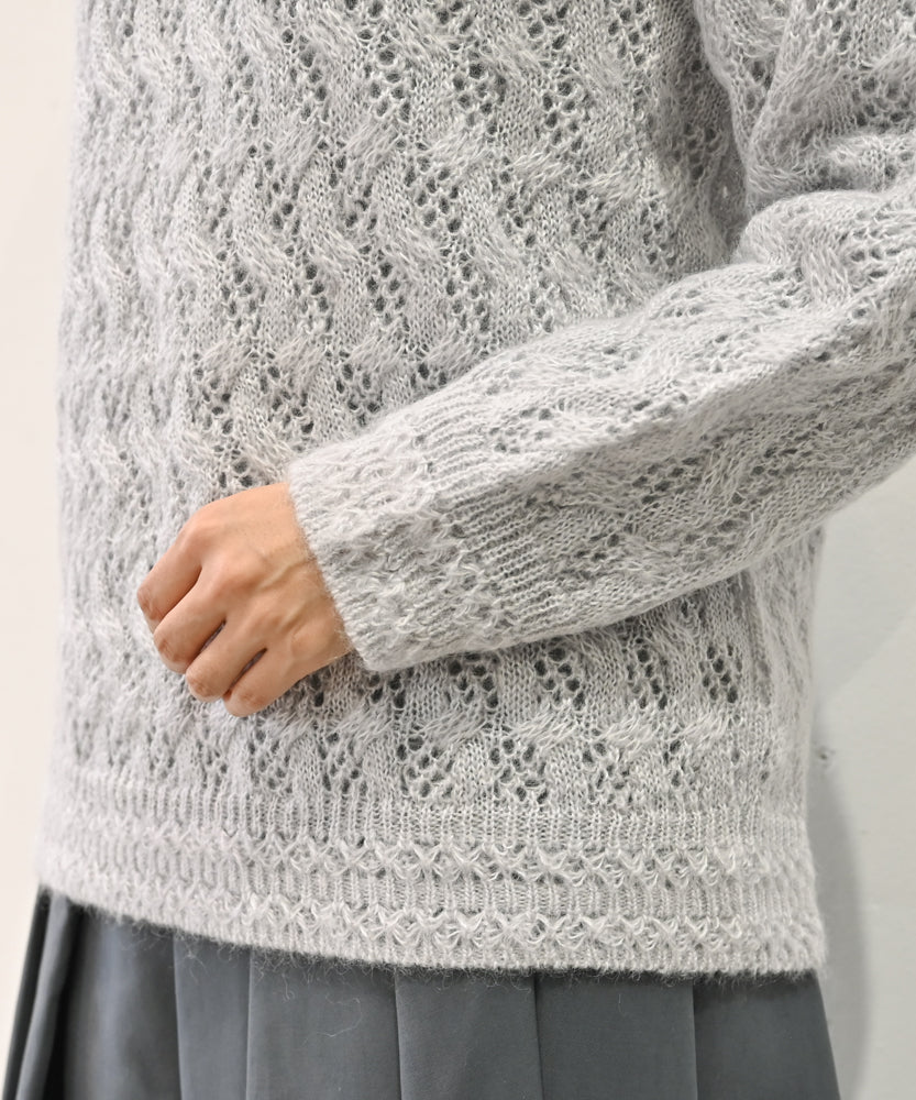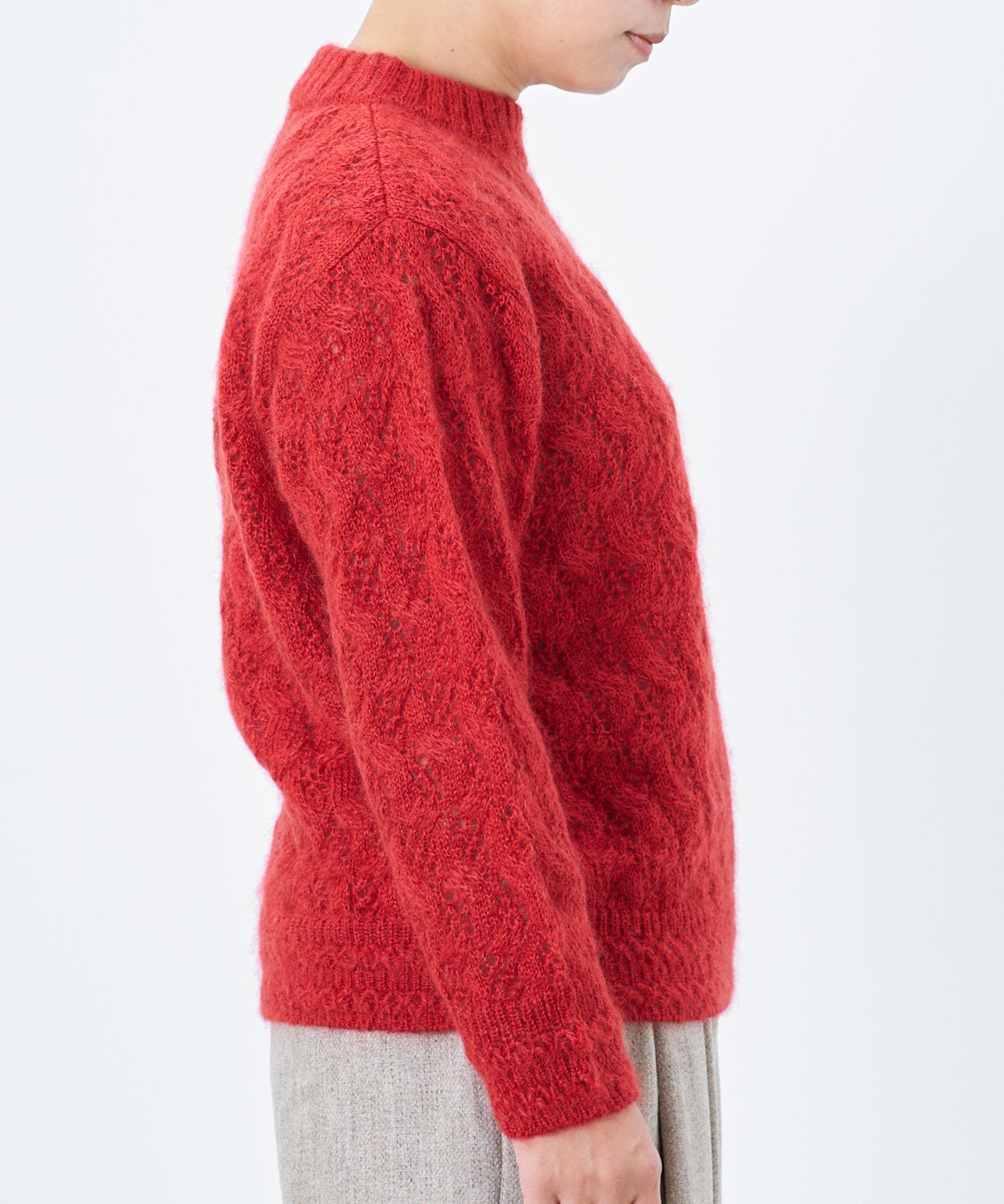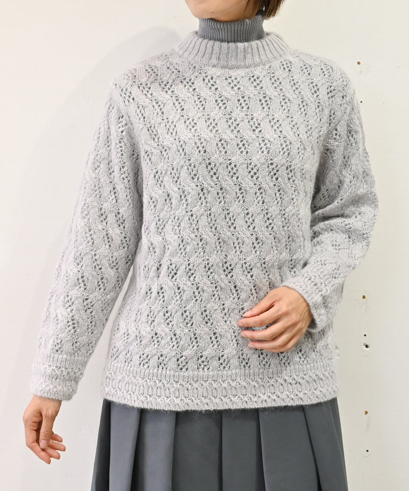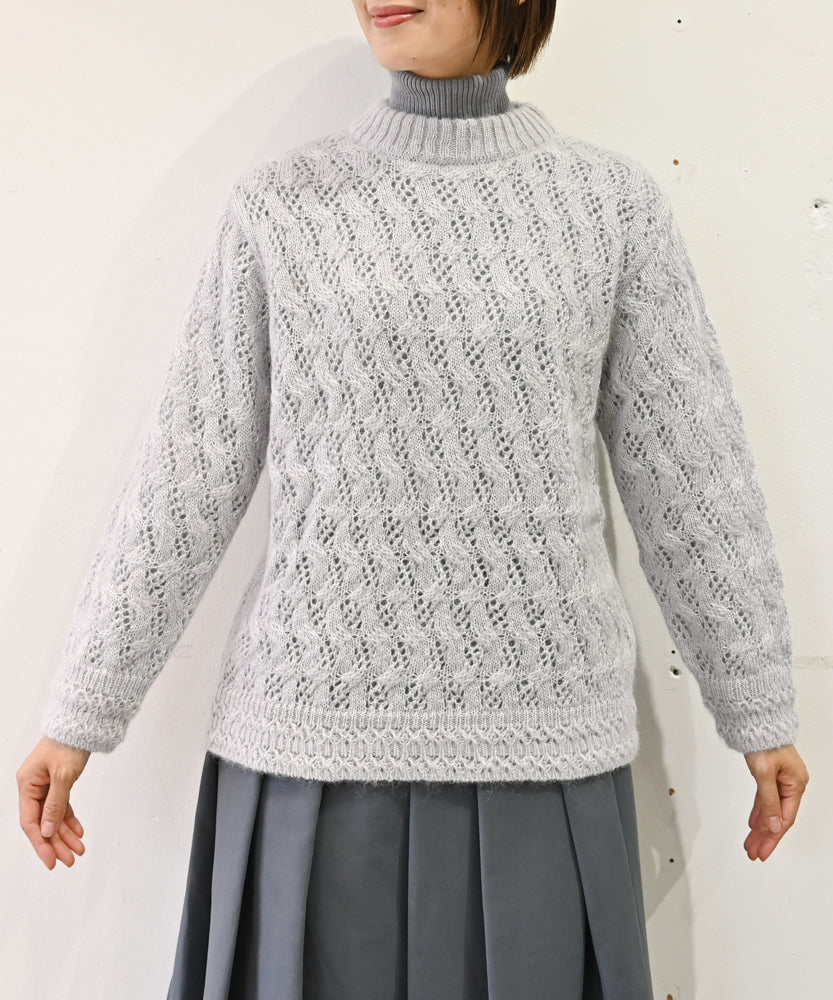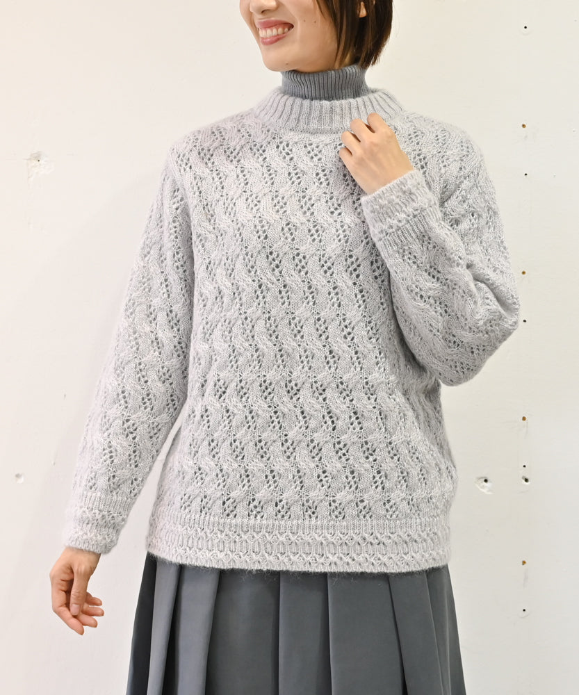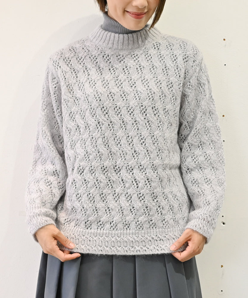 〈高品質シルク&アンゴラ山羊モヘヤ〉模様編み ボトルネックセーター (mug915)