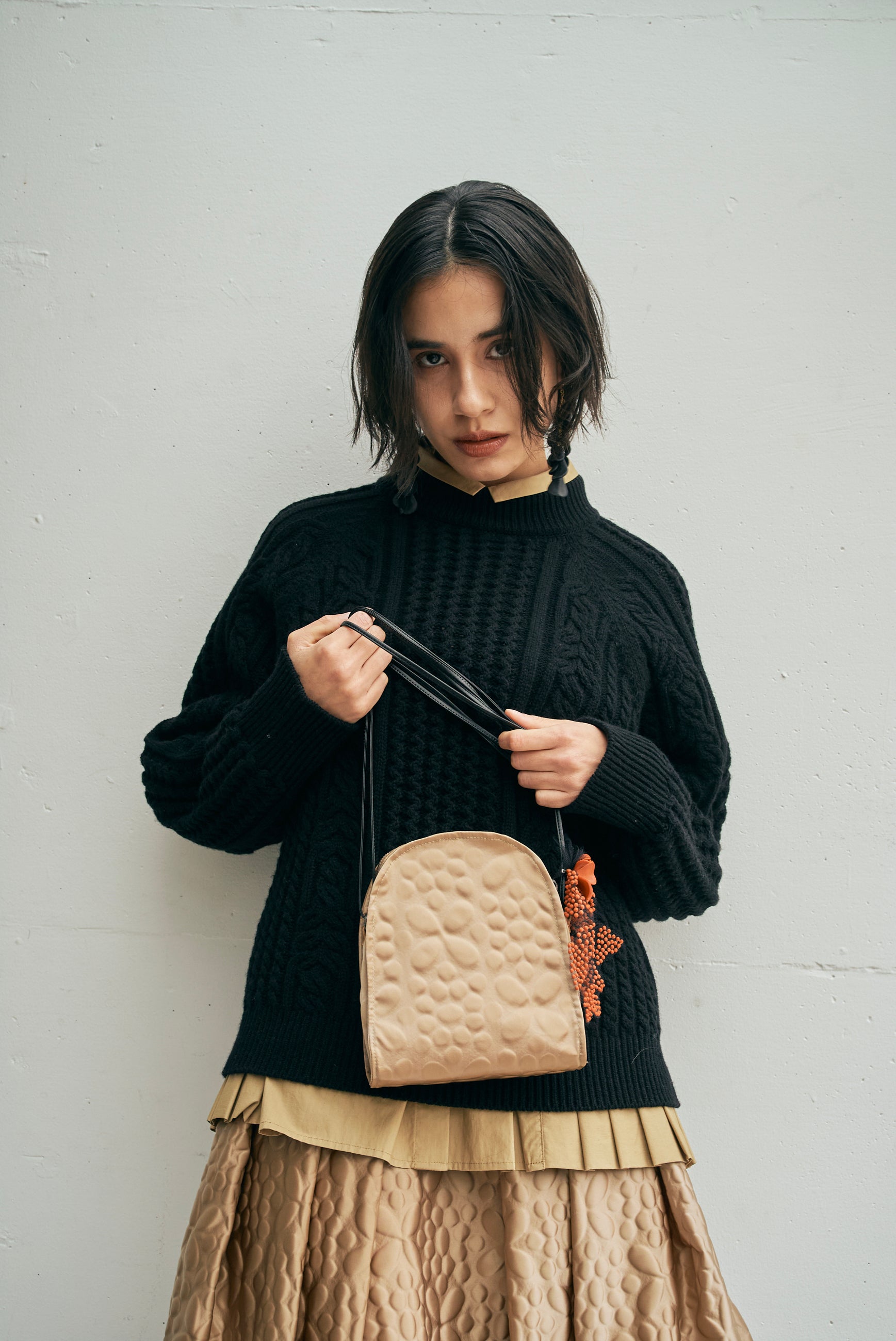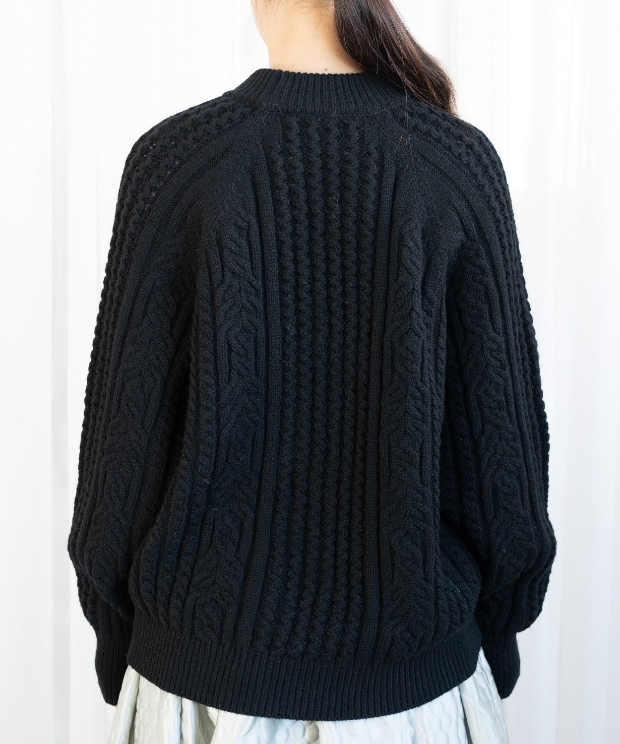 立体感のあるケーブルを3パターンつかっているのですが、構築的でありながらもスッキリとしたシルエットに見えるように、実はしっかり計算した上で編み地を配置しています。この編み地の立体感を出すことが難しく、何度も工場さんと試行錯誤しながら制作しました。