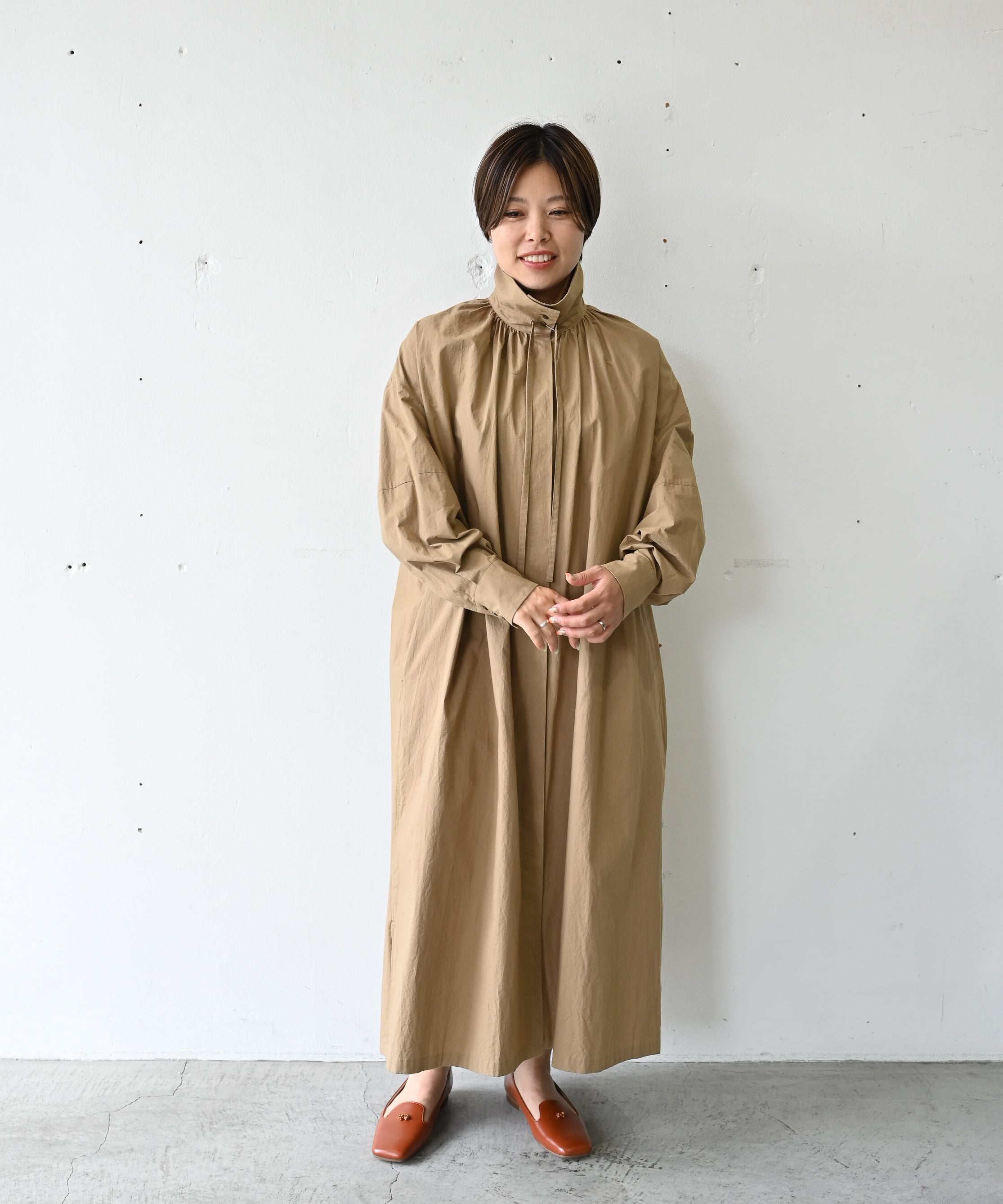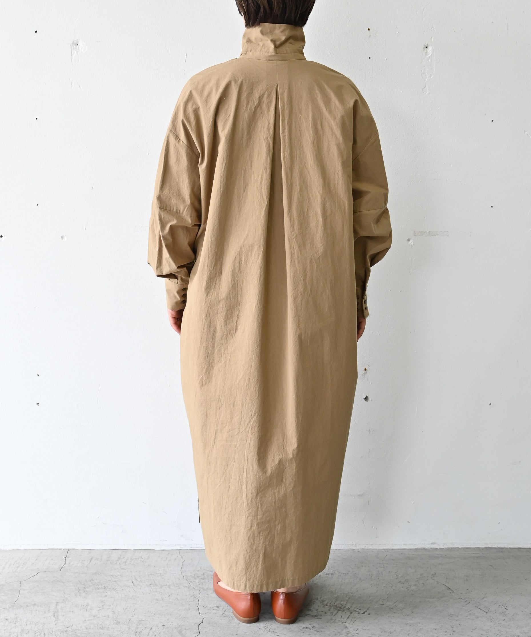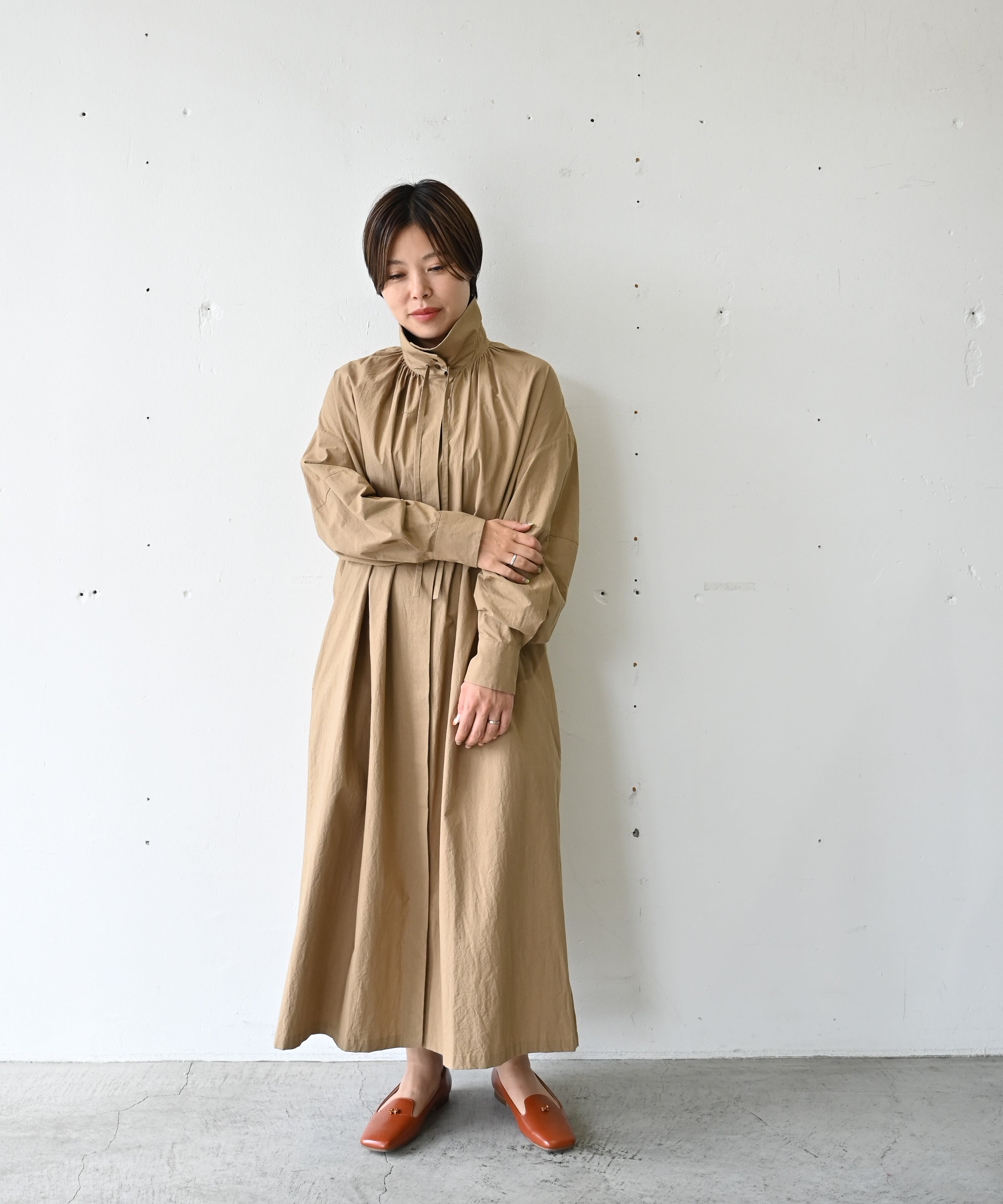 こちらのシャツワンピースは、静岡県浜松の遠州織物の上質なコットン生地を使用しています。柔らかいのにハリがあり、しっとりしているのにドライな感触もある、不思議な手触りが心地良い生地です。表面に細かなシワ加工があり、ナチュラルな風合いをお楽しみいただけます。