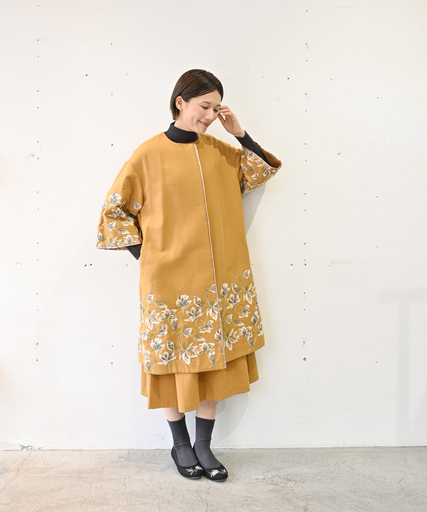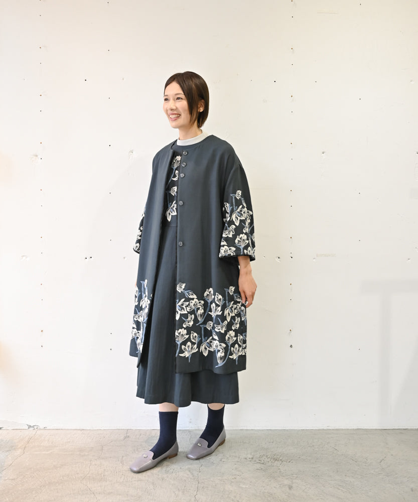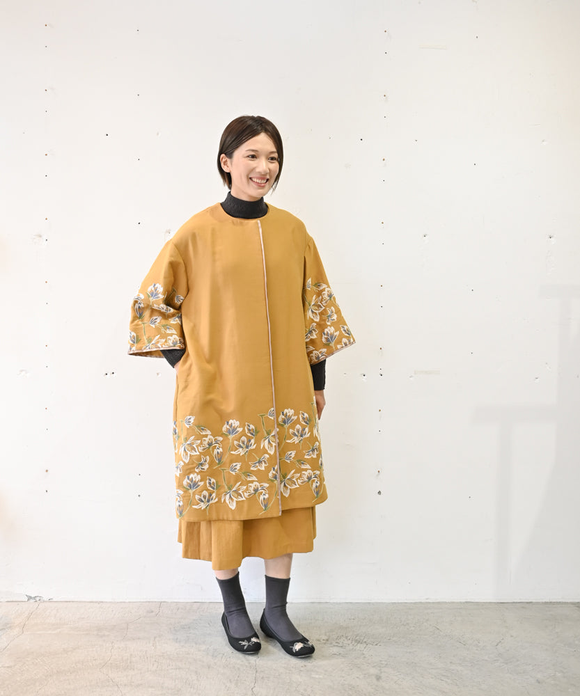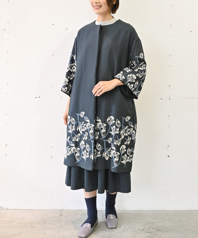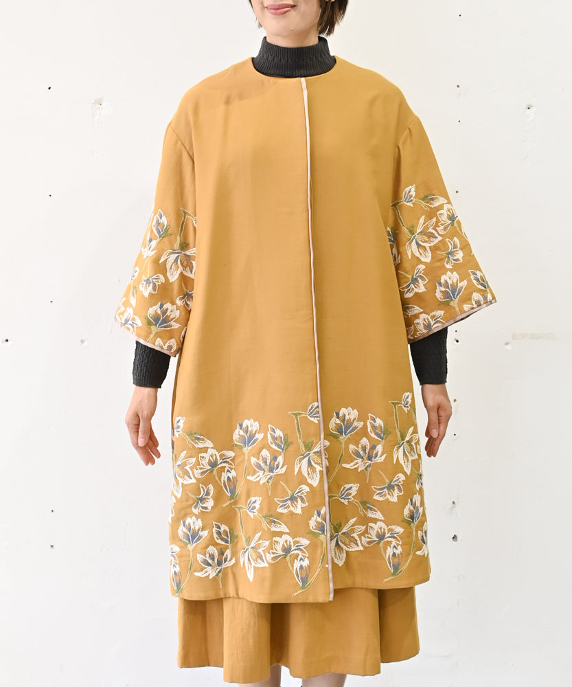〈遠州織物〉モクレン刺繍 ノーカラー ワイドシルエット コート(セットアップ可能) (mud501)