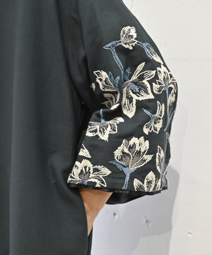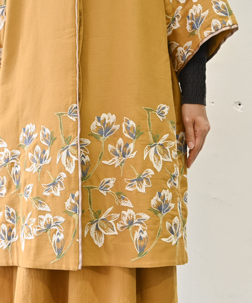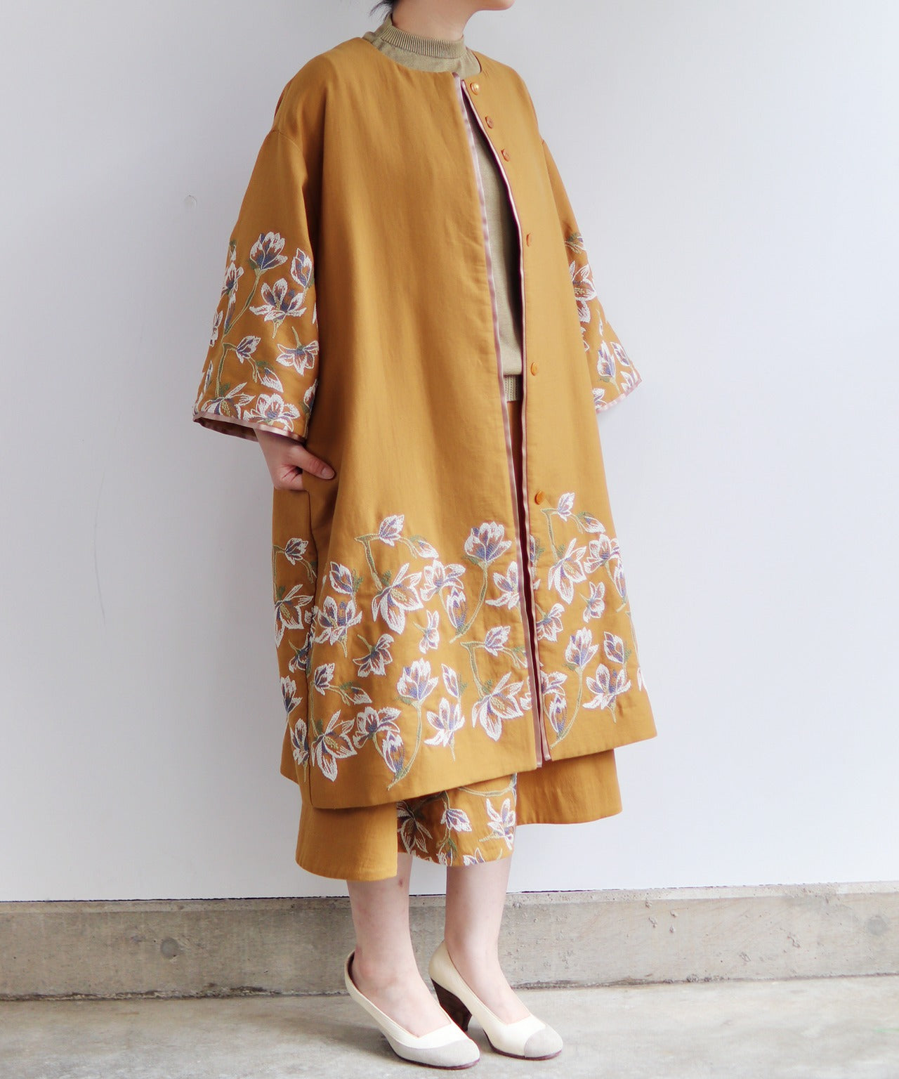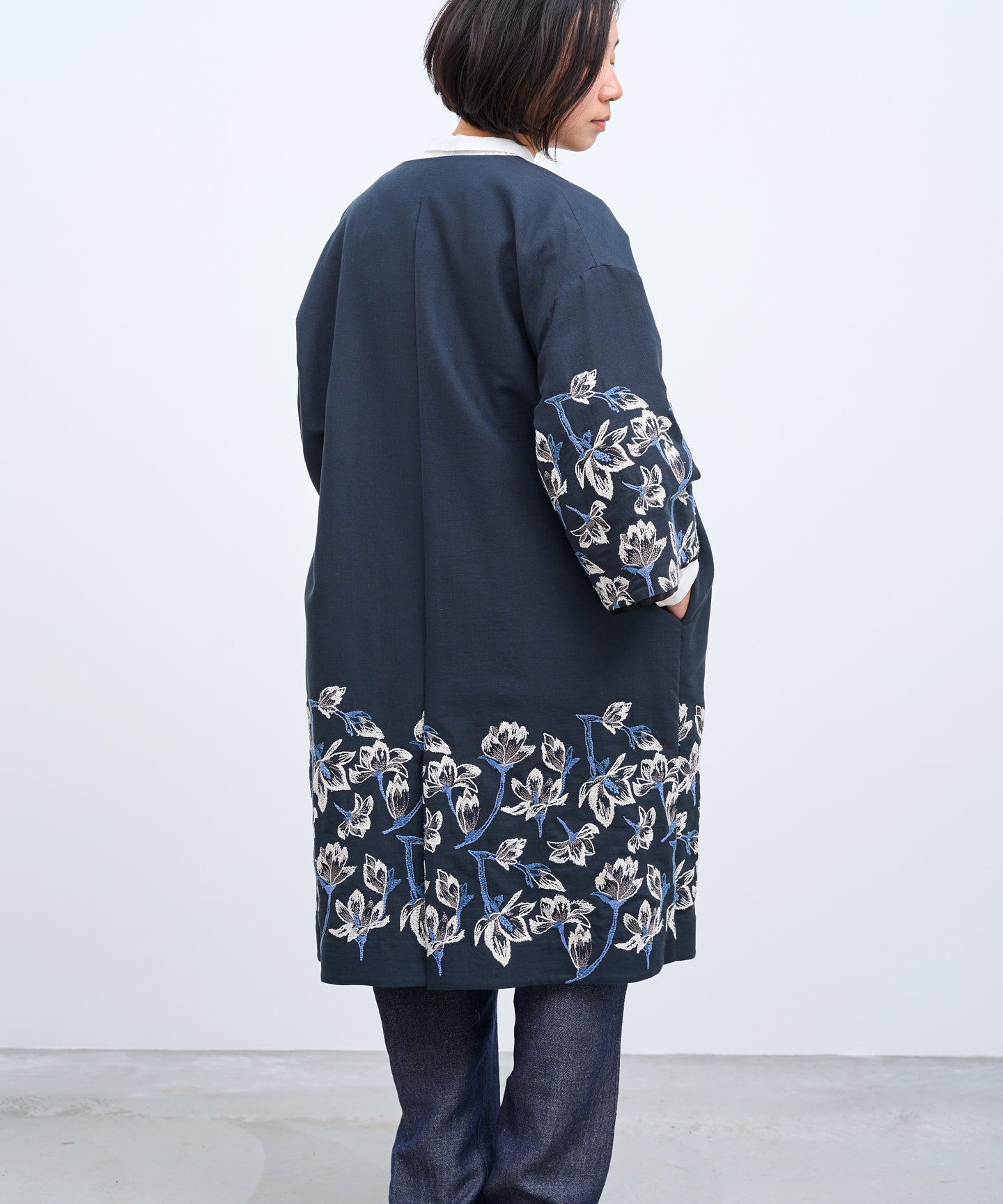 〈遠州織物〉モクレン刺繍 ノーカラー ワイドシルエット コート(セットアップ可能) (mud501)