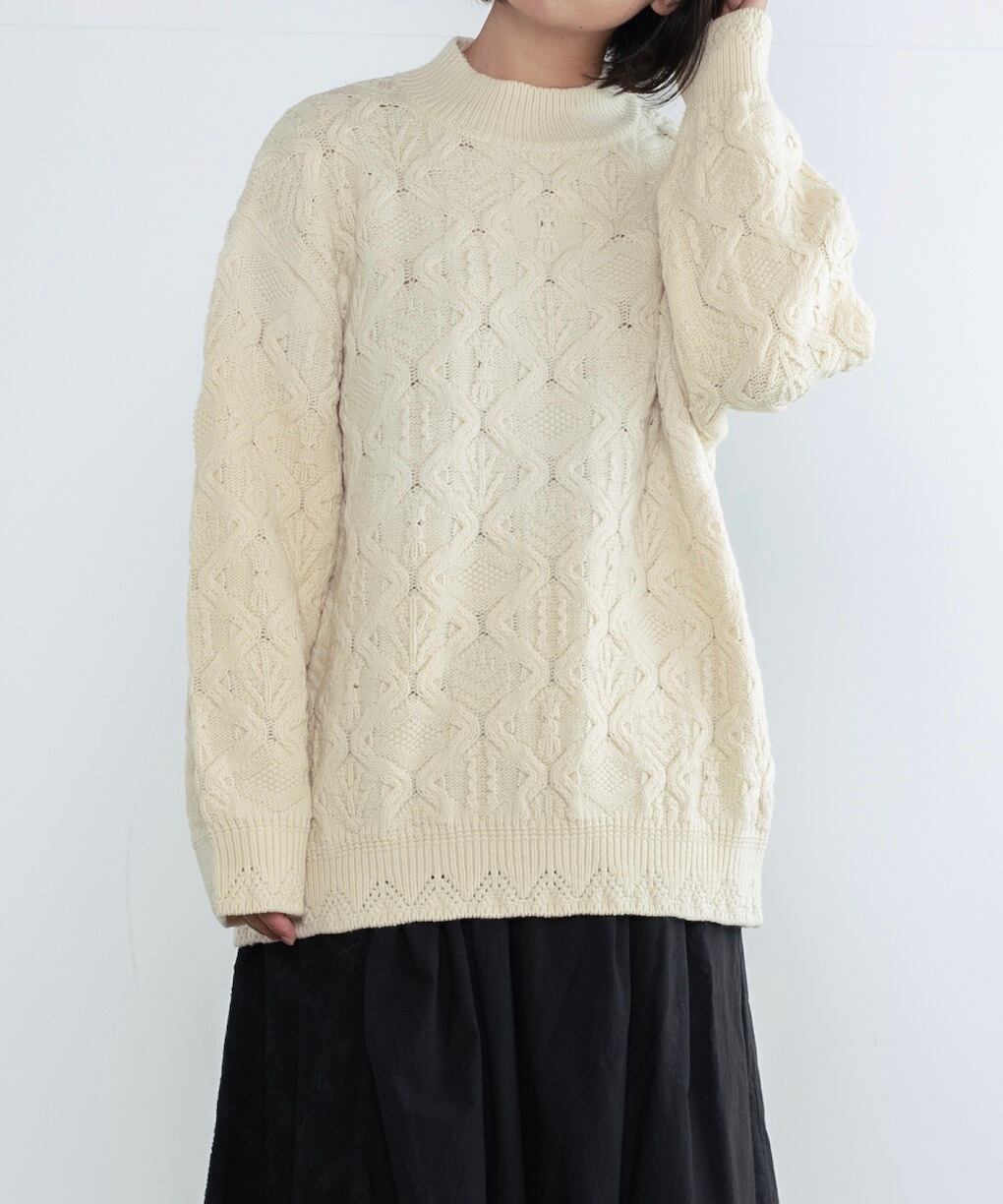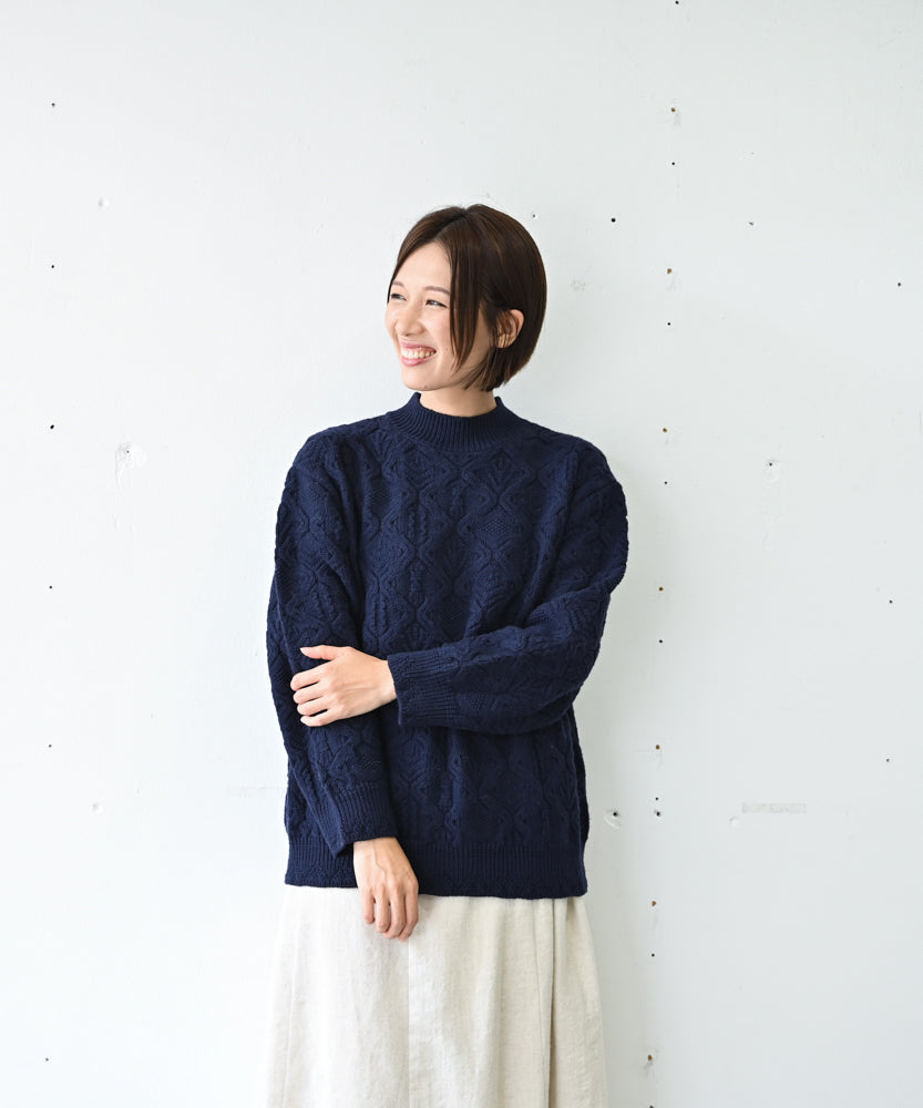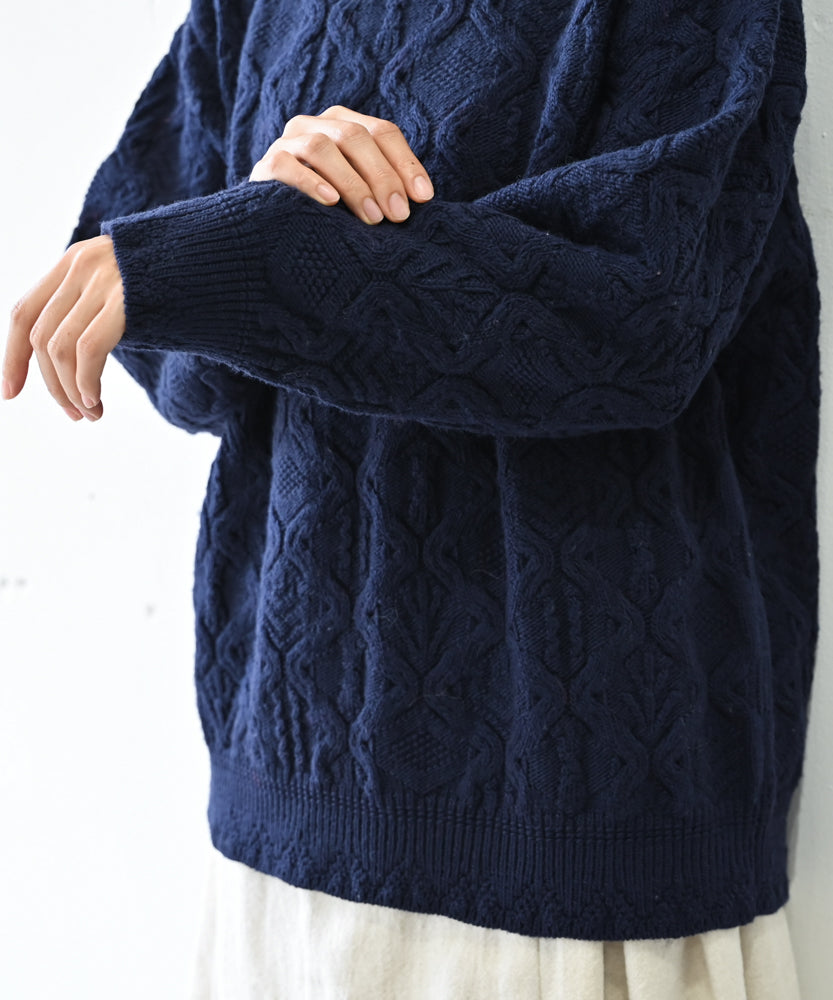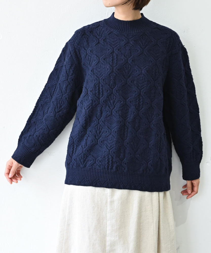 緻密で凝った模様編みが華やかで上品な印象に。模様編みはカジュアルな印象や着膨れして見えそうで苦手な方もいらっしゃるかもしれませんが、こちらのニットは、身頃はゆったりした着心地ながら腕周りはすっきり見えを叶えます。流行り廃れのない普遍的な美しさがあり、長くご愛用いただけます。