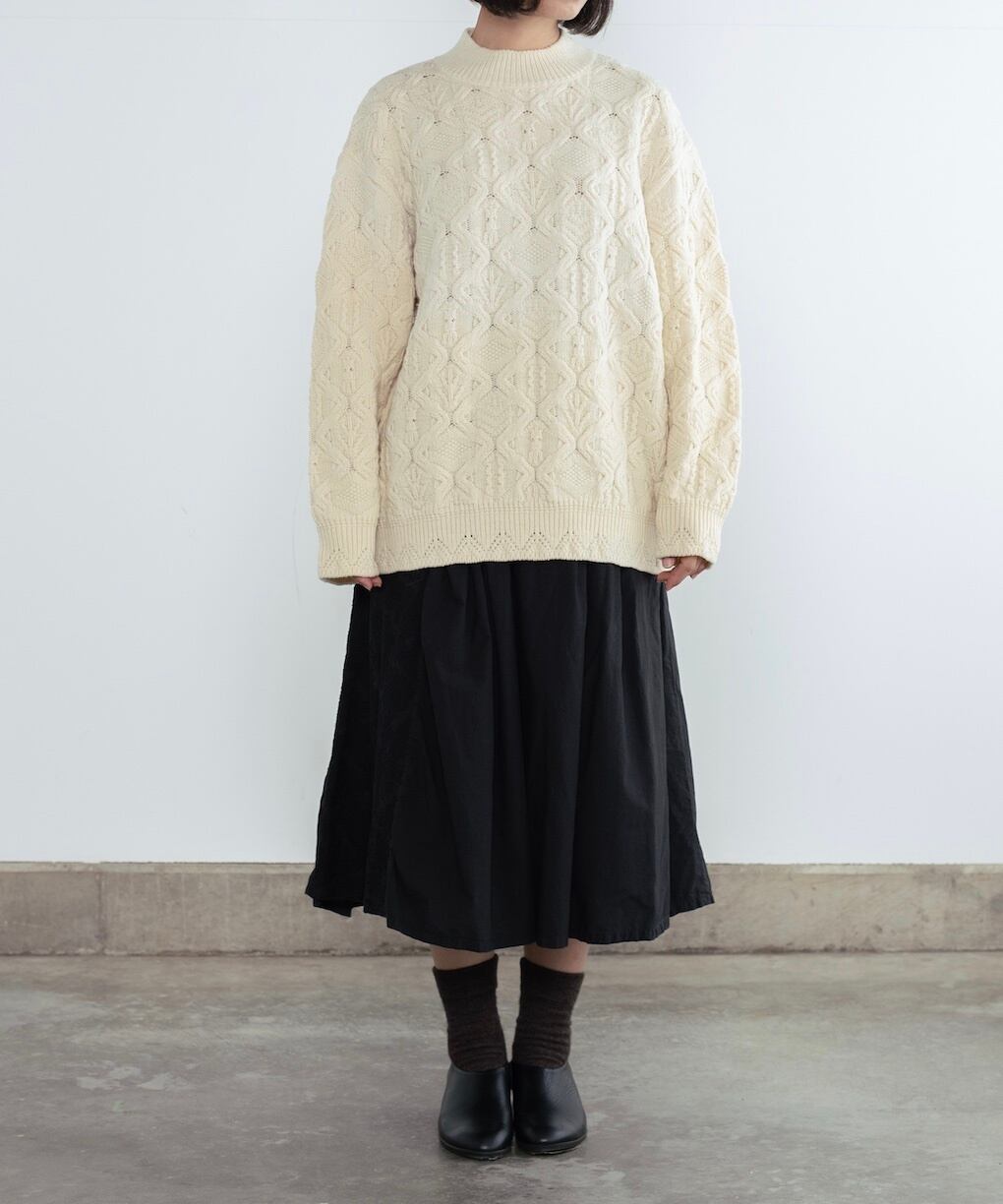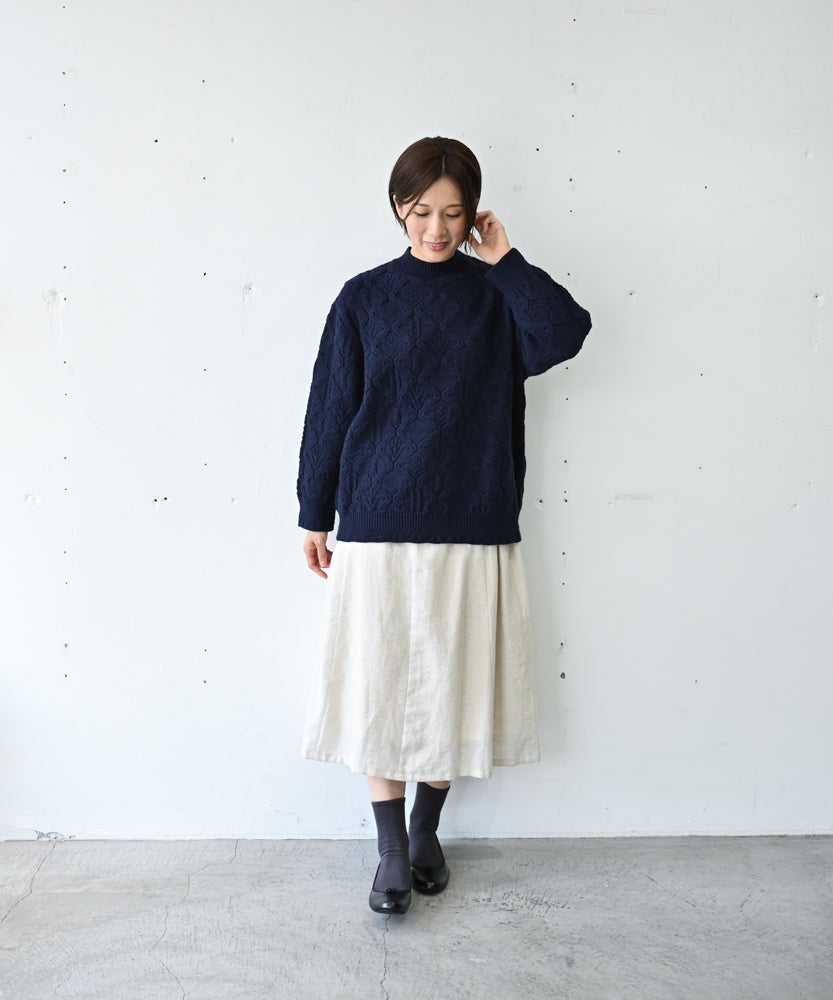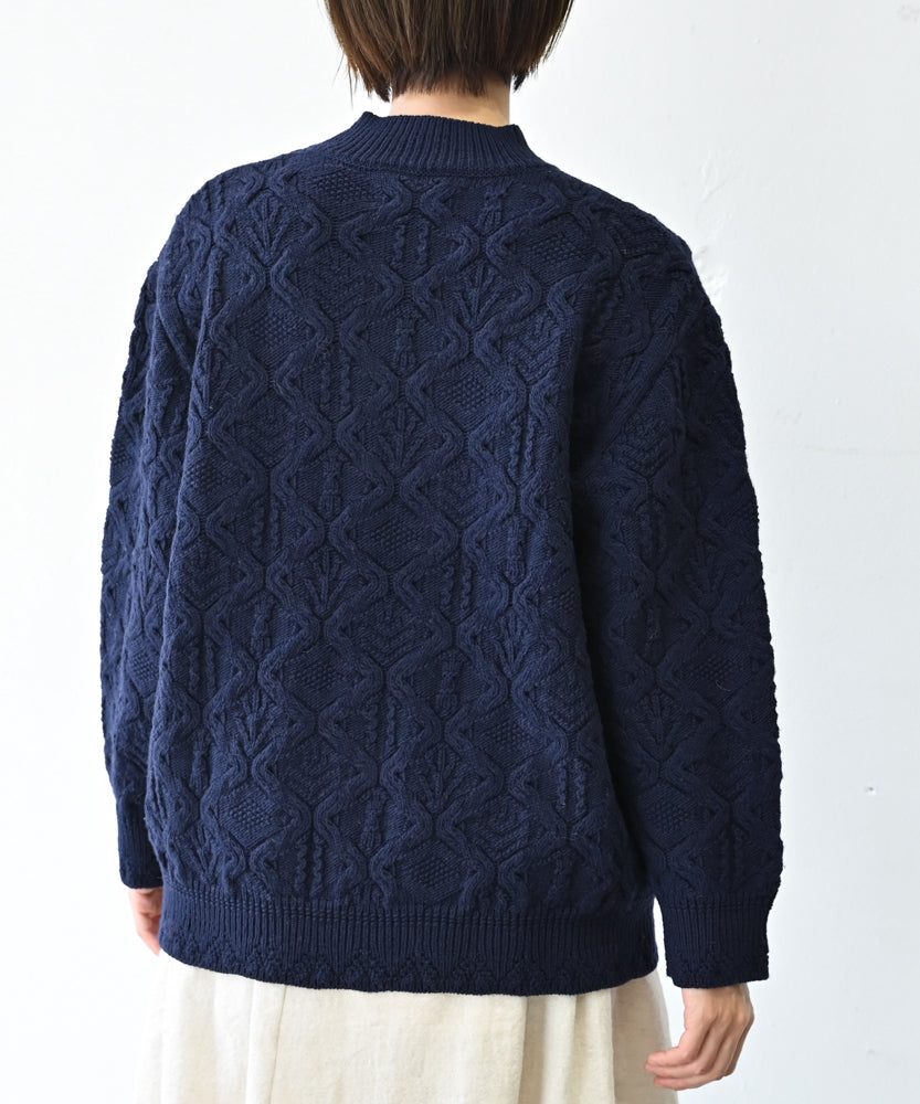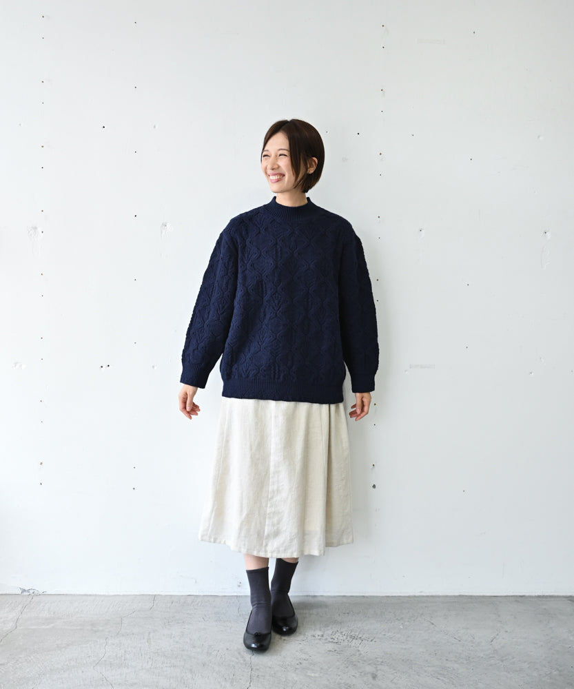 緻密で凝った模様編みが華やかで上品な印象に。模様編みはカジュアルな印象や着膨れして見えそうで苦手な方もいらっしゃるかもしれませんが、こちらのニットは、身頃はゆったりした着心地ながら腕周りはすっきり見えを叶えます。流行り廃れのない普遍的な美しさがあり、長くご愛用いただけます。