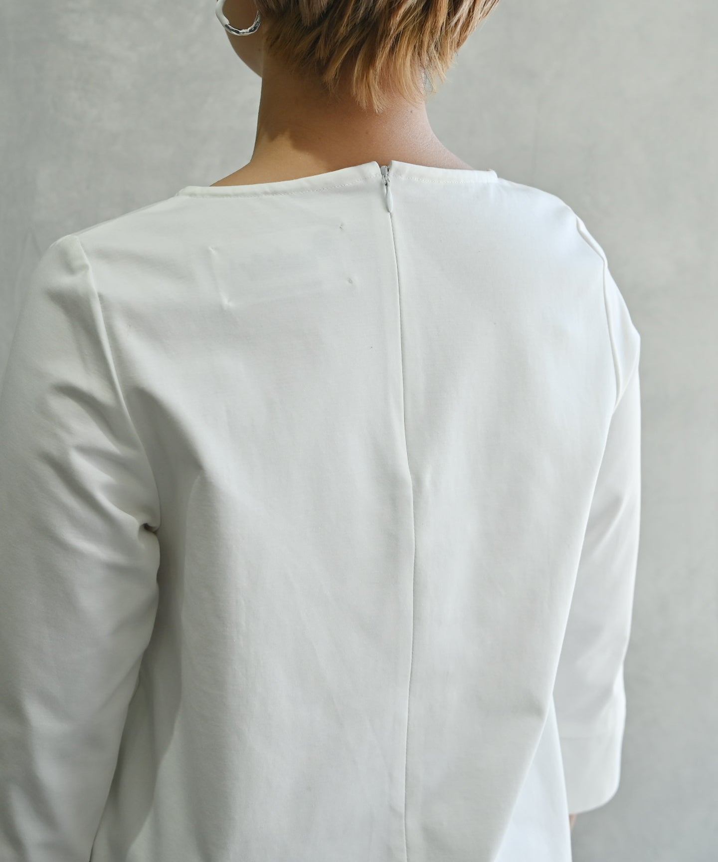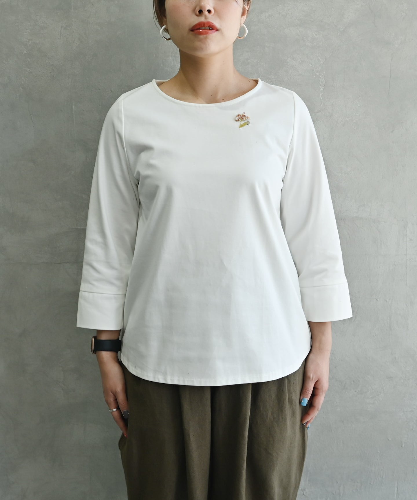 一見ベーシックなカットソー生地のTシャツタイプのアイテムになりますが、袖口のカフスには、さりげなくチュールの生地の切り替えを入れたり、裾をラウンドさせたりと、カジュアルなTシャツデザインに、クラシックなブラウスのような要素を入れました。後ろ衿にコンシールファスナー開きがあり着脱しやすい仕様です。胸元にはチェコビーズをした刺繍で花モチーフでワンポイントアクセントを入れています。このビーズ刺繍は一点一点アトリエにて手刺繍を行っています。