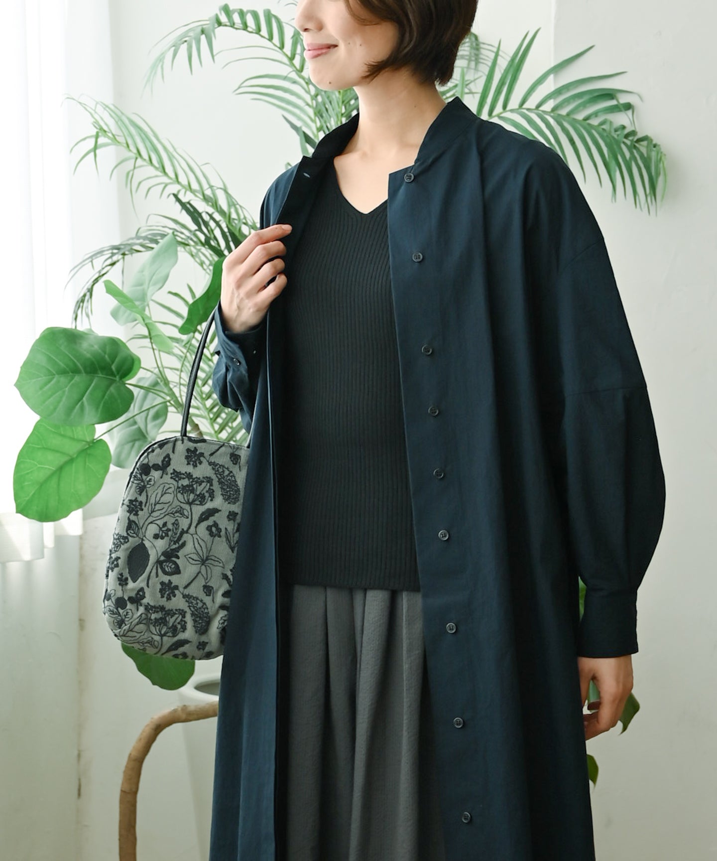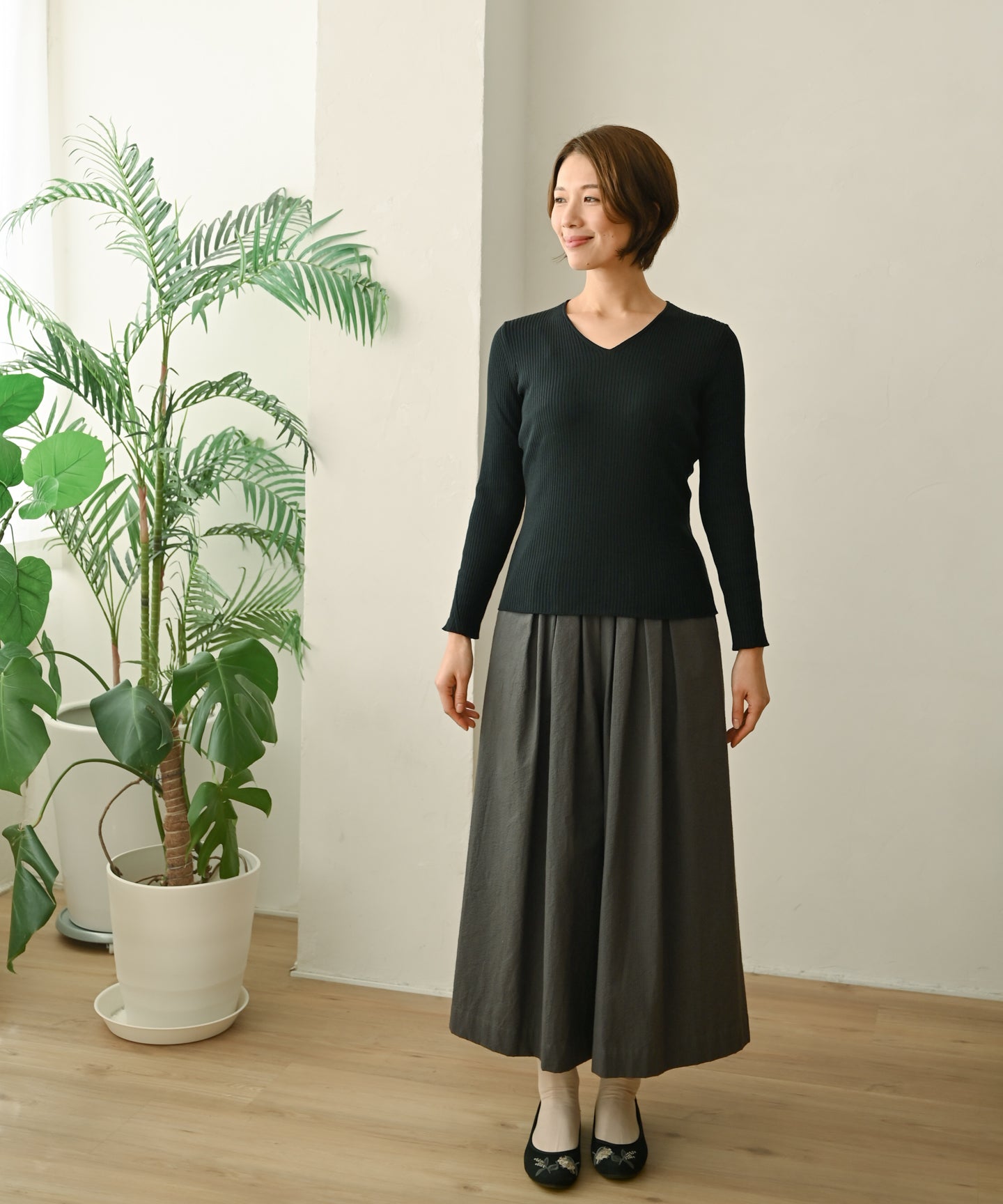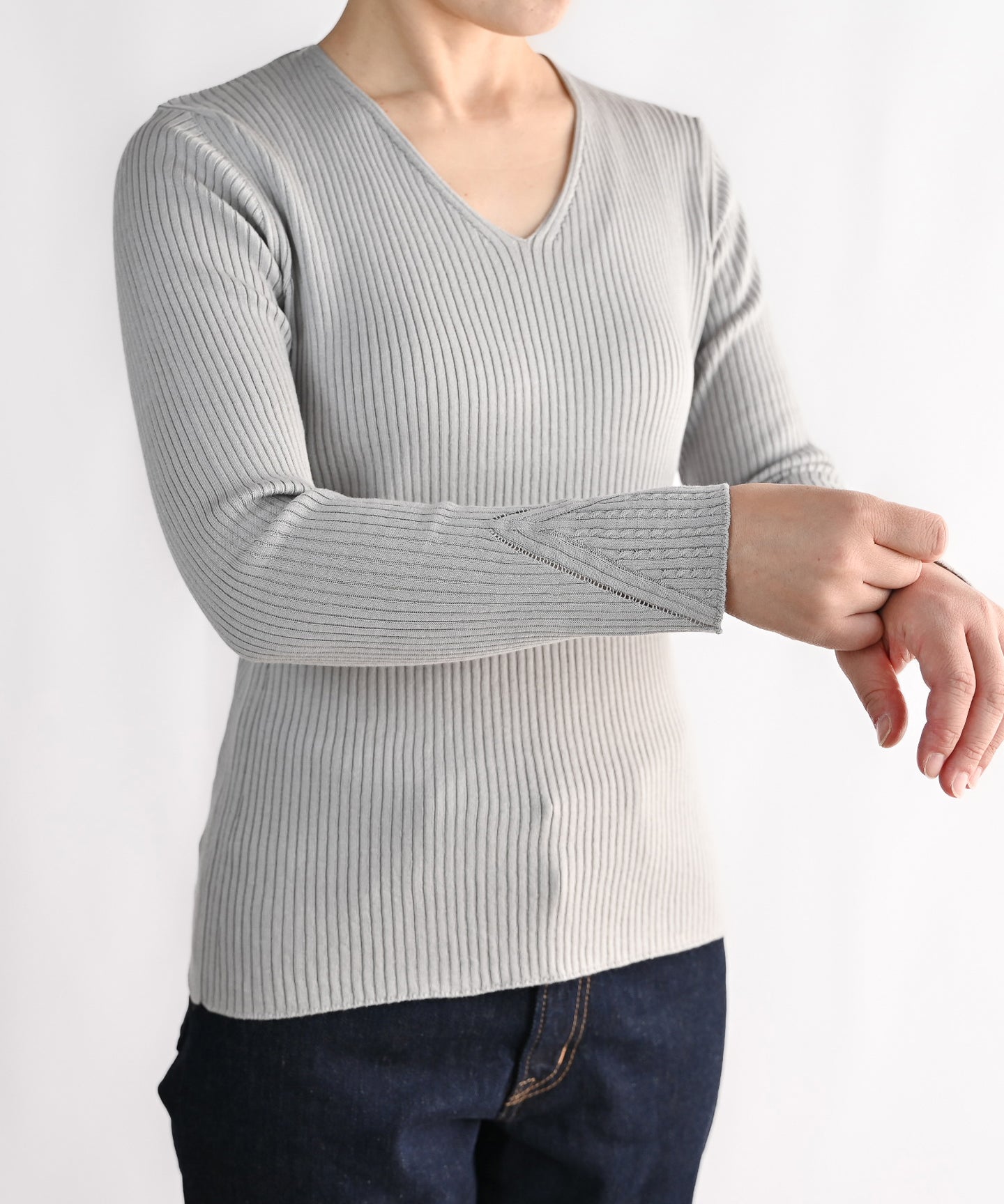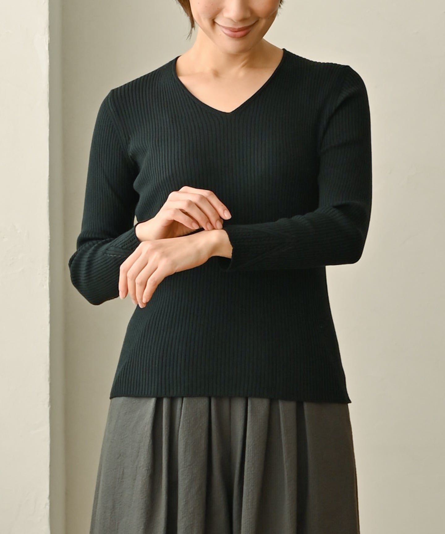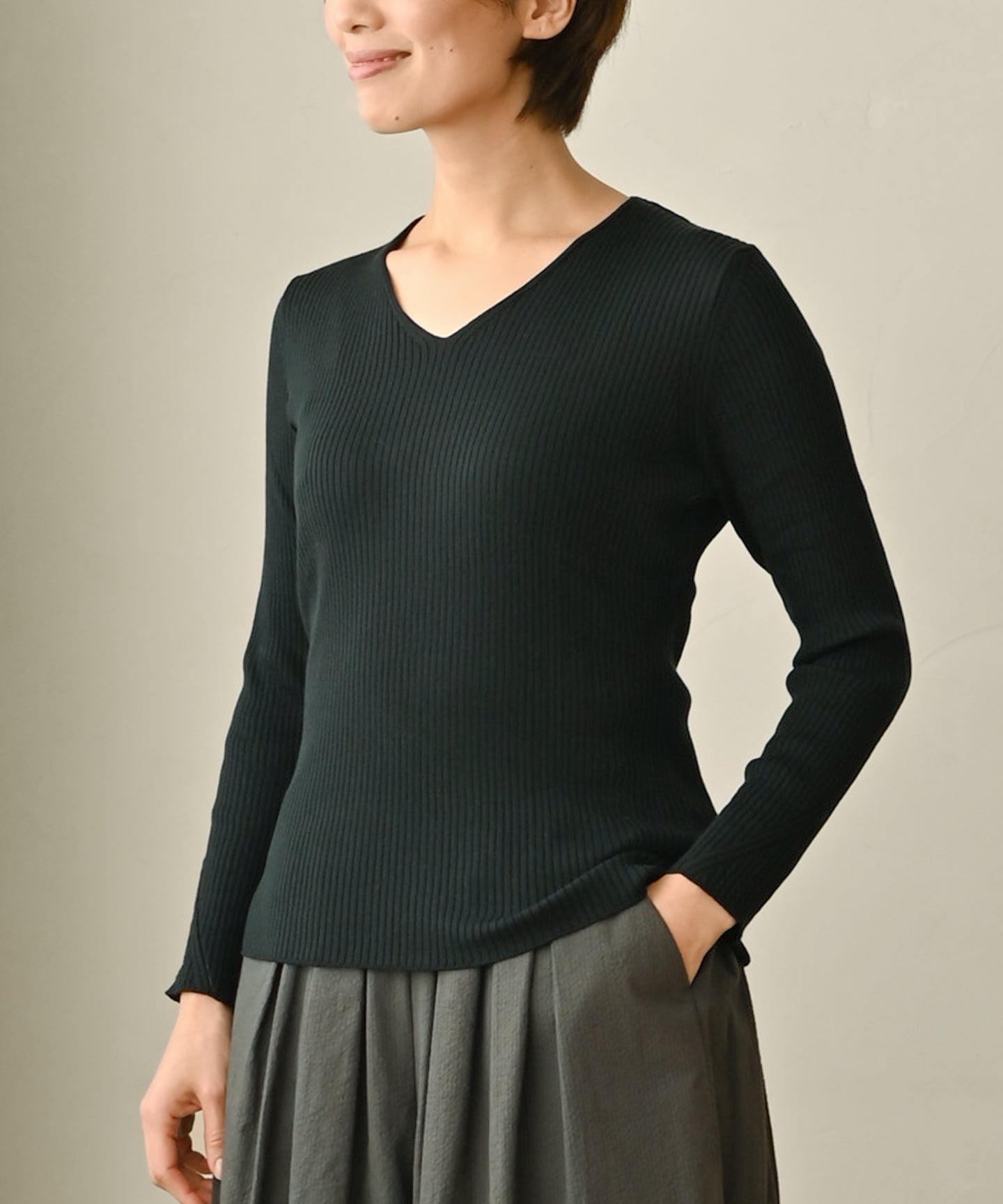 こちらは季節を問わず一年通して着られるニットです。
