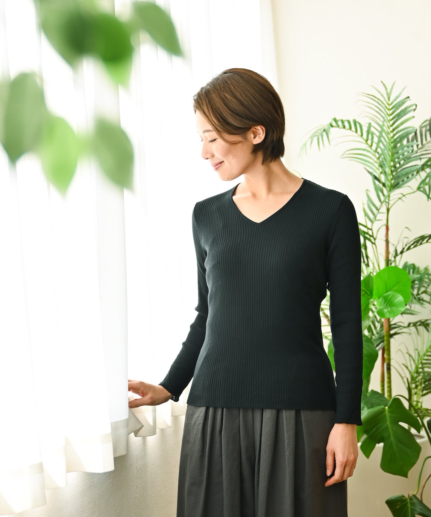 吸湿性・保温性・通気性に優れた上質なシルクコットン素材なので、春夏にはTシャツ感覚で一枚でさらっと着ていただけて、秋冬にはセーターやワンピースのインナーとして着ていただけます。強撚の糸をリブ編みにし、適度な伸縮性があり快適な着心地です。