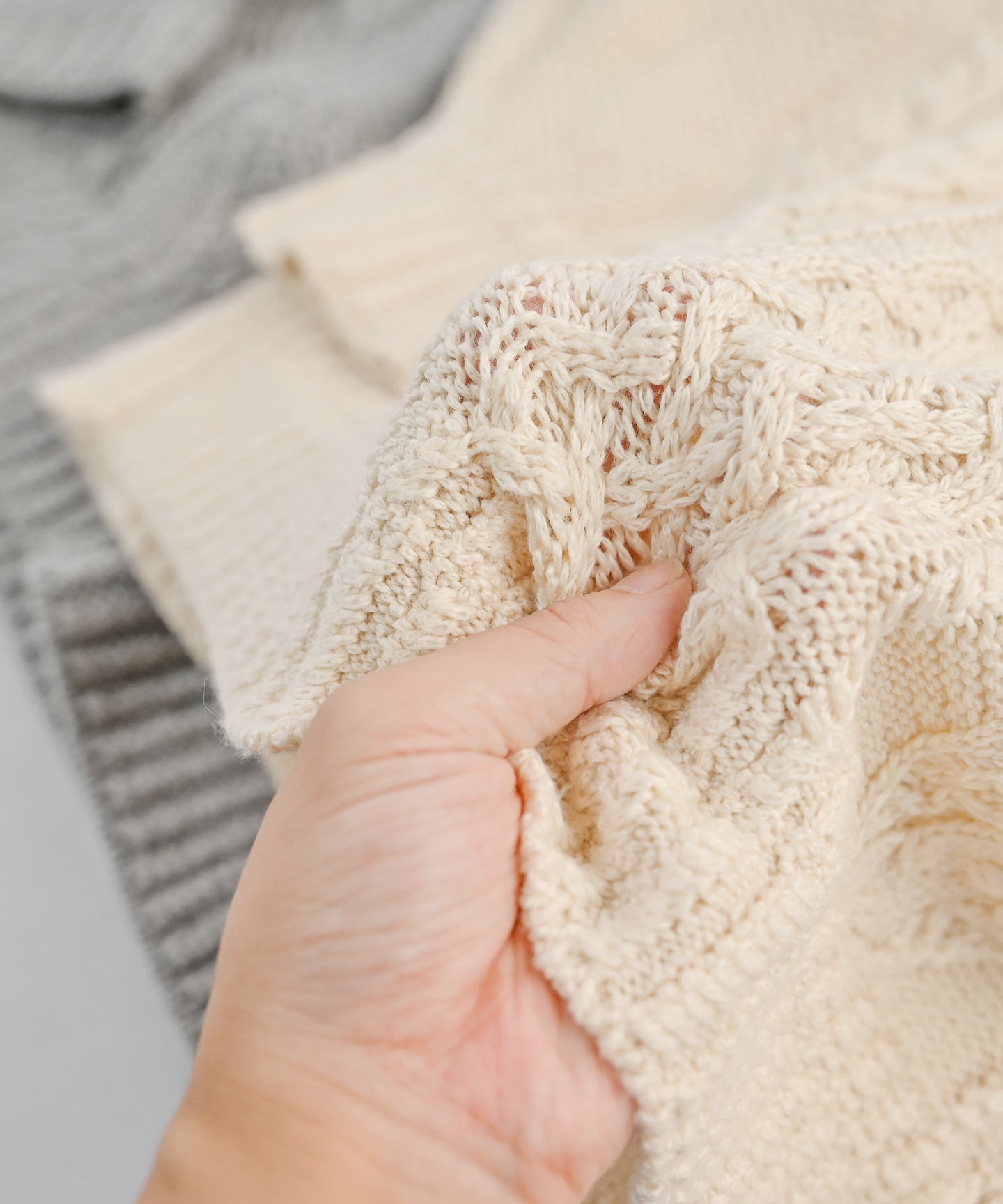 こちらはオーガニックコットン100%のニットです。一般的なコットンのローゲージニットは編みこむと重くなりますし、シルエットが野暮ったく大きくみえてしまうことが多いですが、このニットは特殊な糸で編んでいるためとても軽く、シルエットに落ちる感が生まれ、肩回りのシルエットなどフェミニンな要素が生まれます。また、使用している甘撚りの糸は、長く着ても大きな毛玉ができ縮むのも特長です。