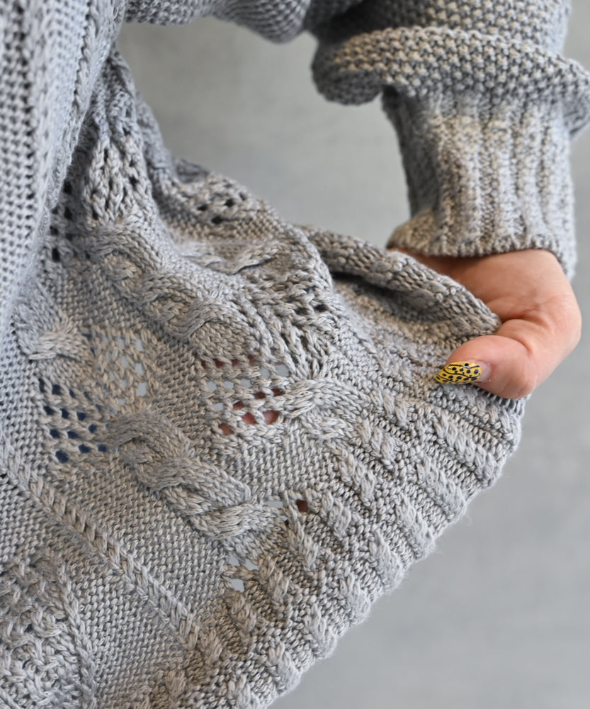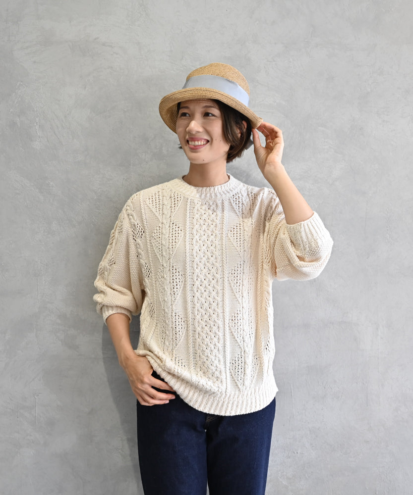 柔らかく光沢感が特徴のスーピマコットンを、粗糸(スライバー)の状態でリリヤーンにすることができる希少な機械で生産しています。その機械は、りが入っていない状態でリリヤーンにすることができる、一般的なリリヤーンよりも軽く、柔らかさや膨らみが感じられます。この空気をふんだんに含んだ糸を使用し、手で編み込んだ図案をもとにしてデザインしています。編地の特性上、部分的に少し透け感があります。ヴィンテージ感が出るような流行に左右されないニットです。
