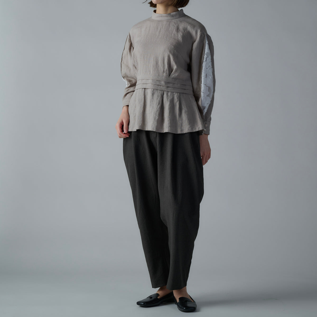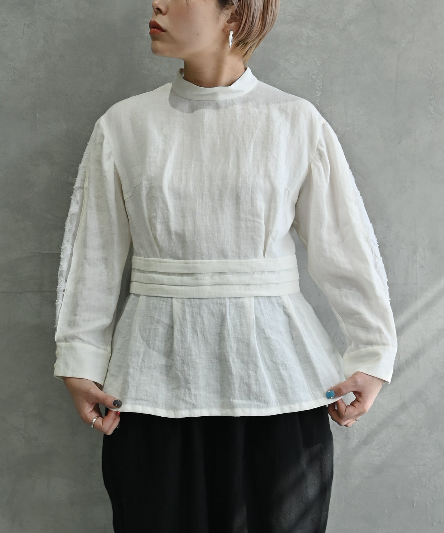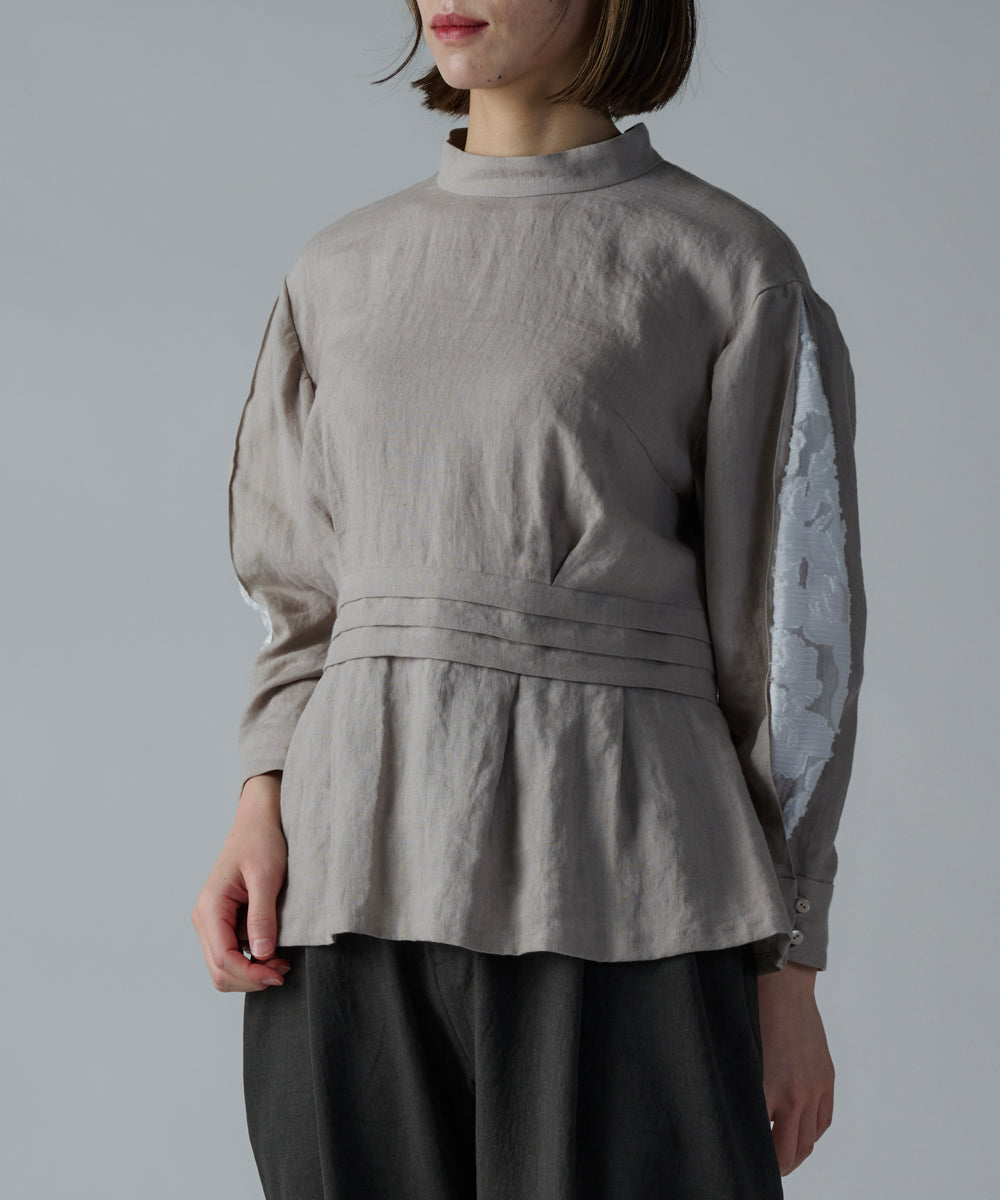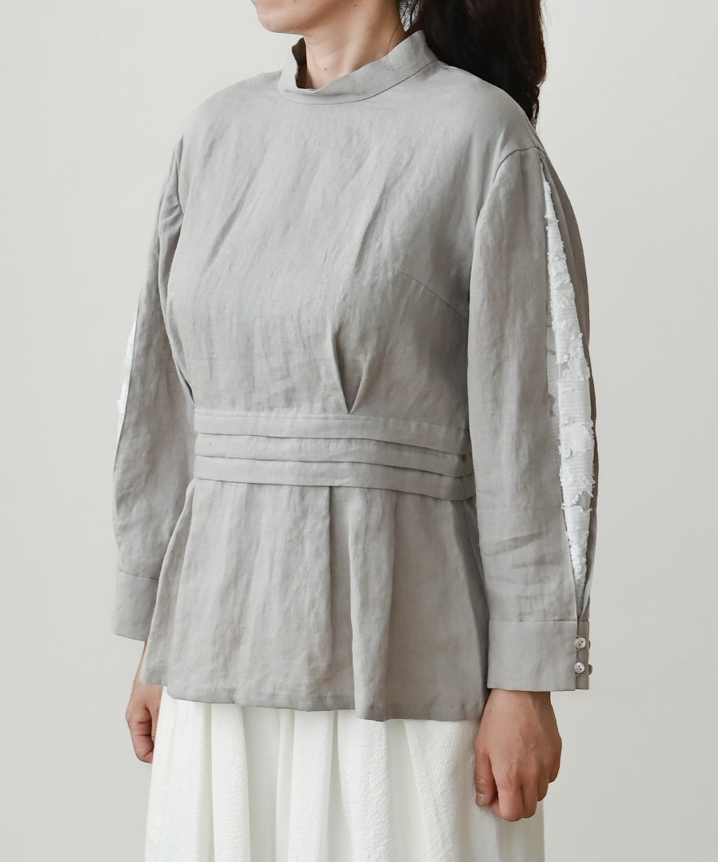 袖の奥ひだにエレガンスなカットジャカード生地を施したリネンブラウスです。襟元はすっきりとコンパクトなハイネックにデザインしました。クラシックさも感じさせながらもどこかノスタルジックで、上品な大人女性を演出してくれます。