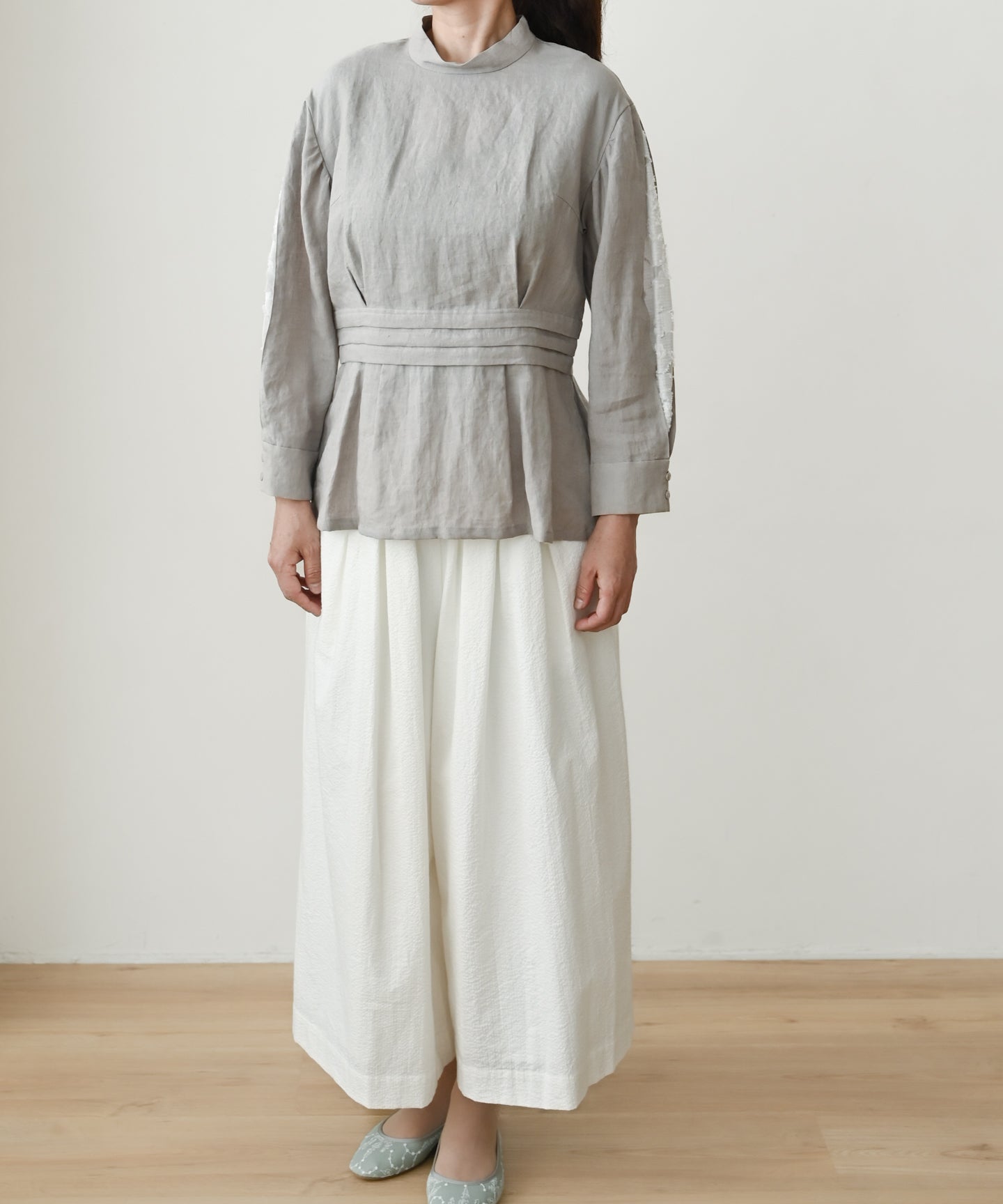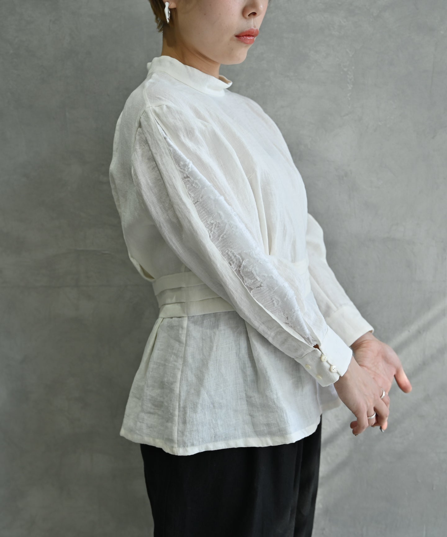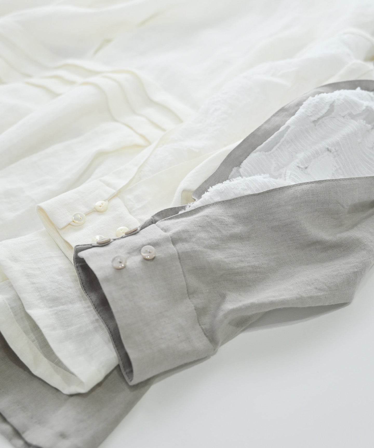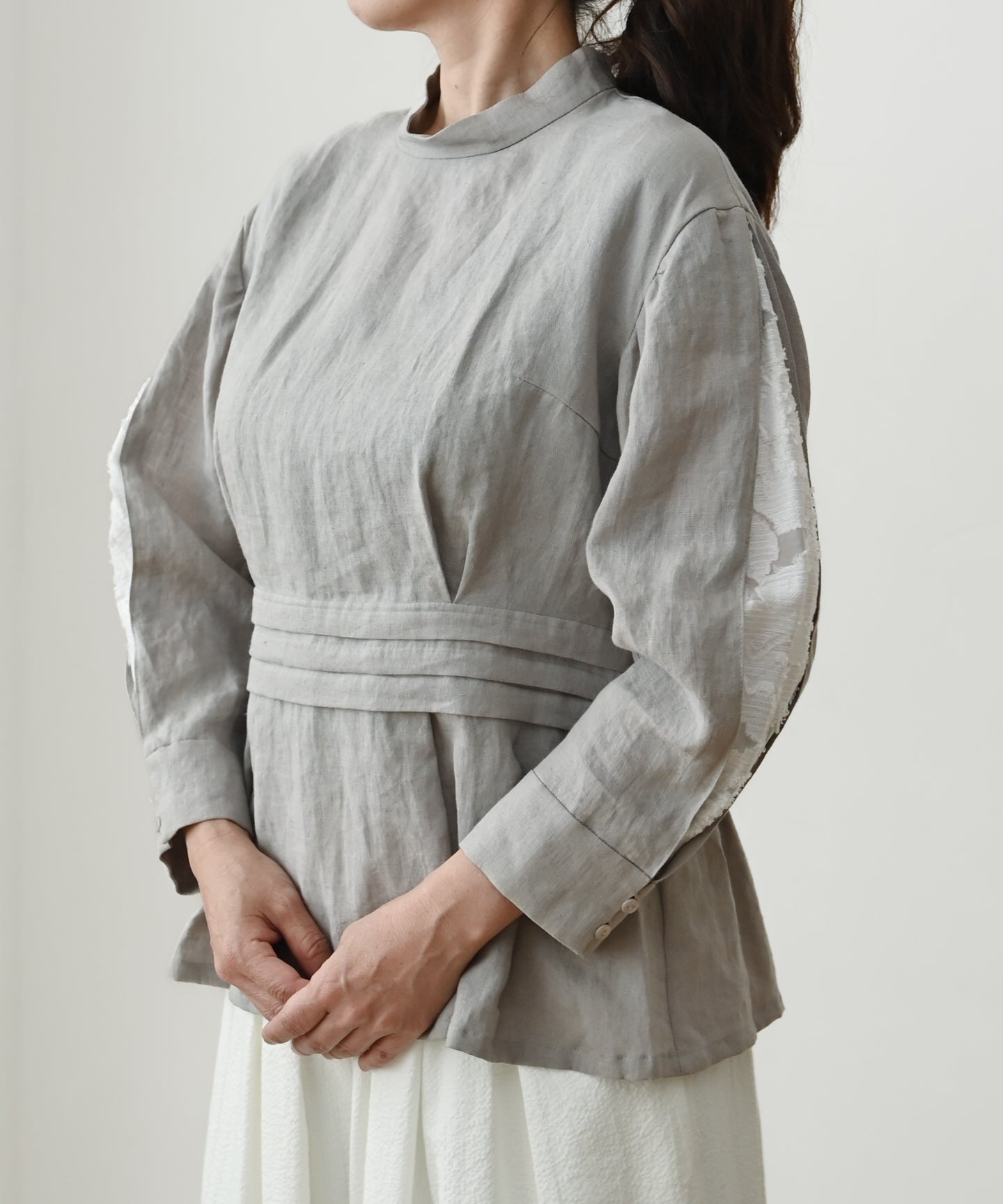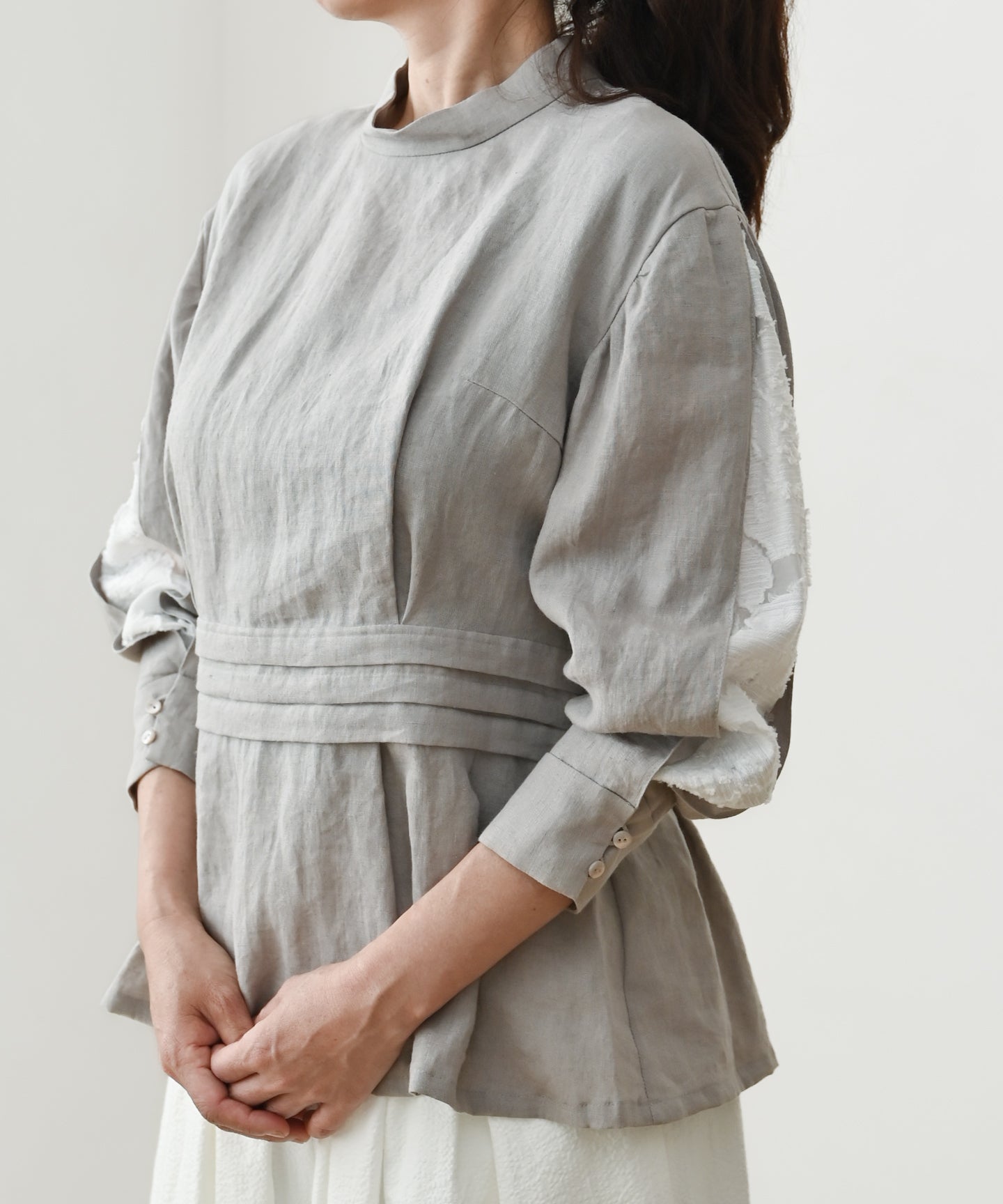 〈高品質ベルギーリネン100%〉カットジャカード生地デザイン袖 クラシカルシルエットのブラウス (mud911)