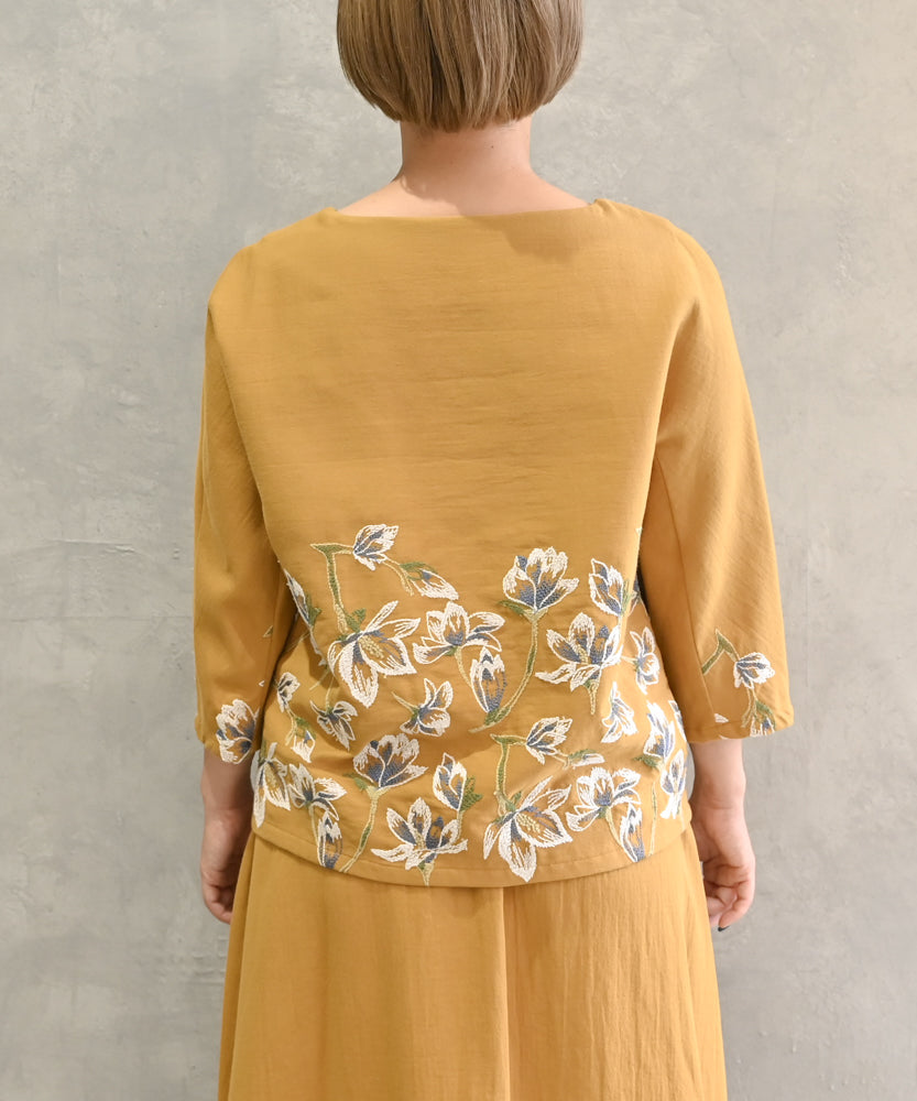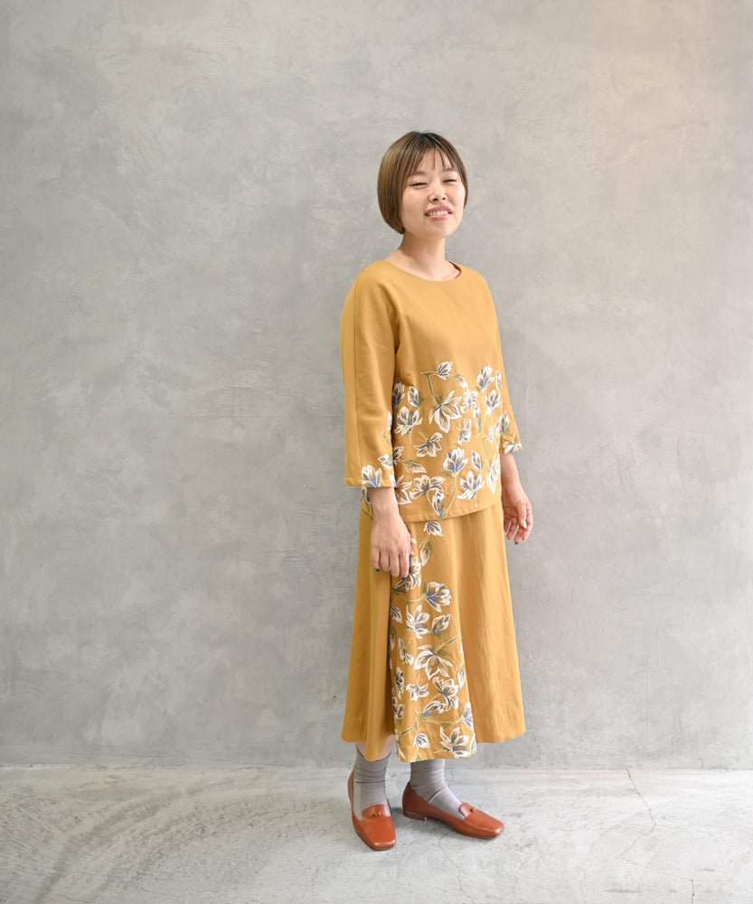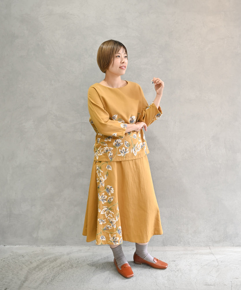 muucオリジナルテキスタイルの定番の一つ、モクレン刺繍のシリーズです。単品でも主役級の華やかさですが、同生地で様々なアイテムを展開しておりますのでセットアップでもお楽しみいただけます。