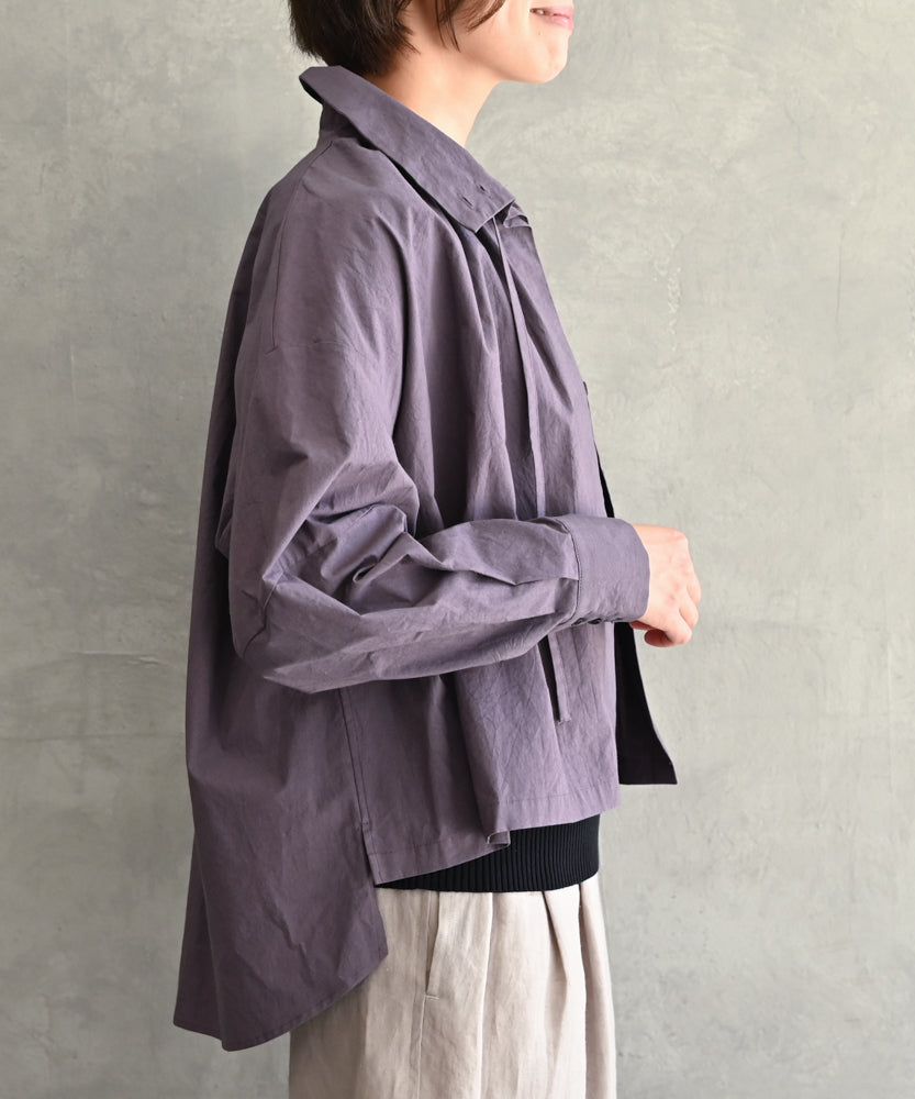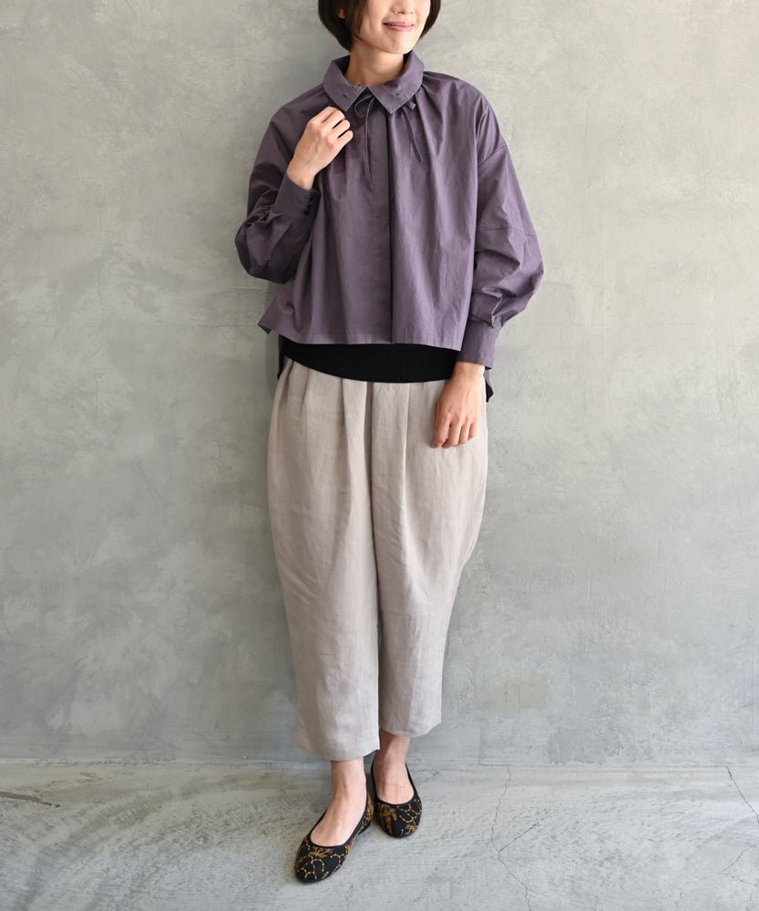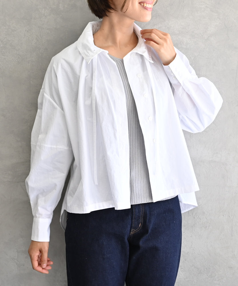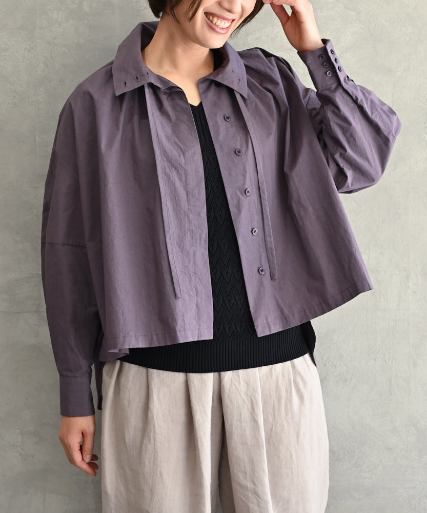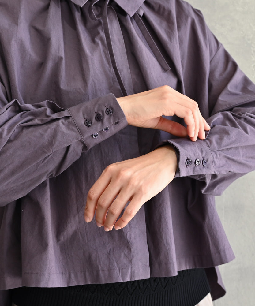 こちらは、衿の形が特長のmuucらしいデザインです。衿を立てても折っても着ていただけますし、さり気ないリボンを結んだり絞ったり垂らしたりでき、ボタンを留めるのはもちろん、前開きなのでボタンを開けて羽織りとしても着ていただけますので、様々なスタイリングをお楽しみいただけます。肩回りや身幅にゆとりをたっぷり入れていますので様々な体型の方に着ていただけます。