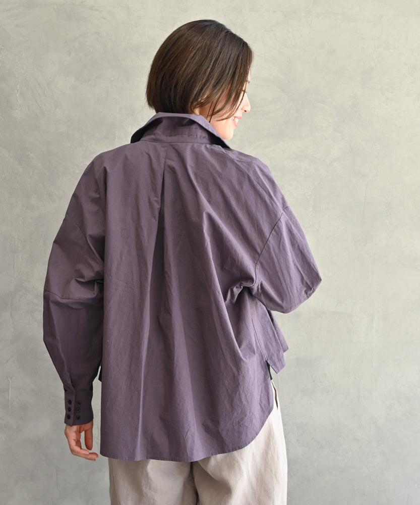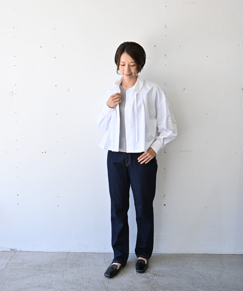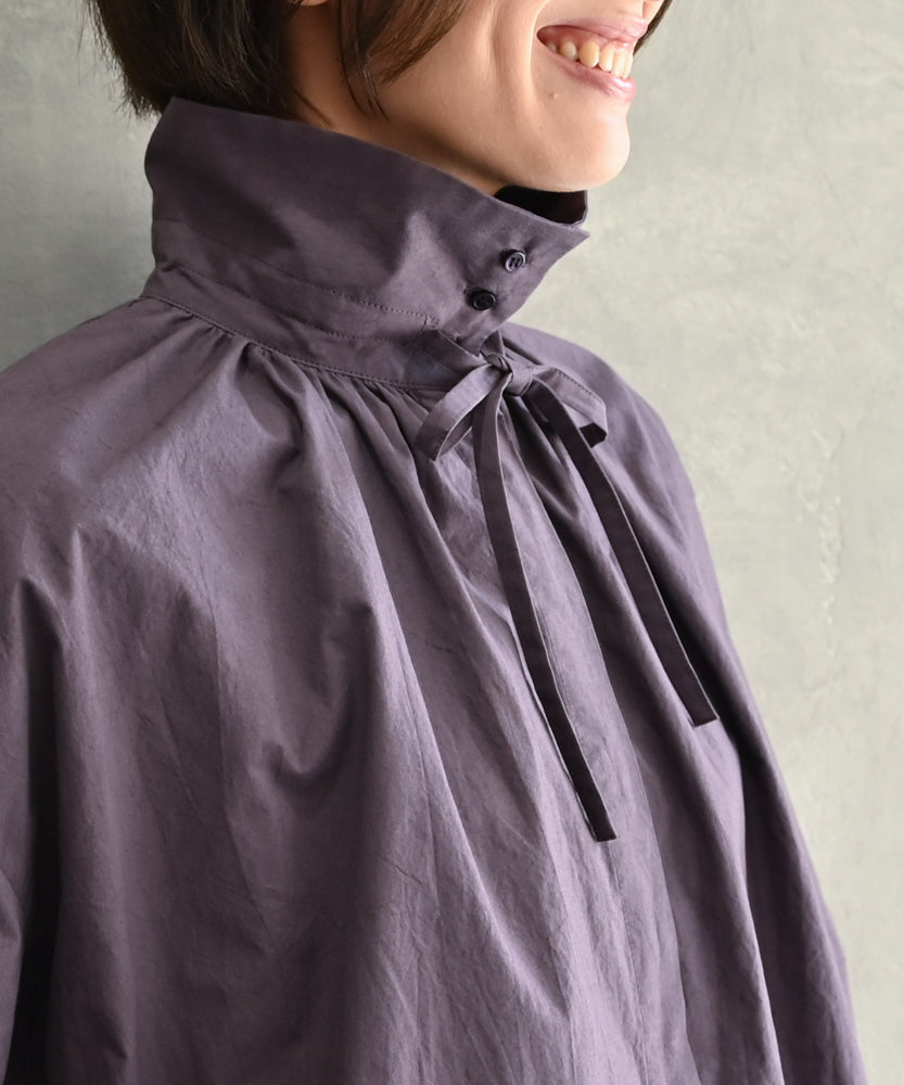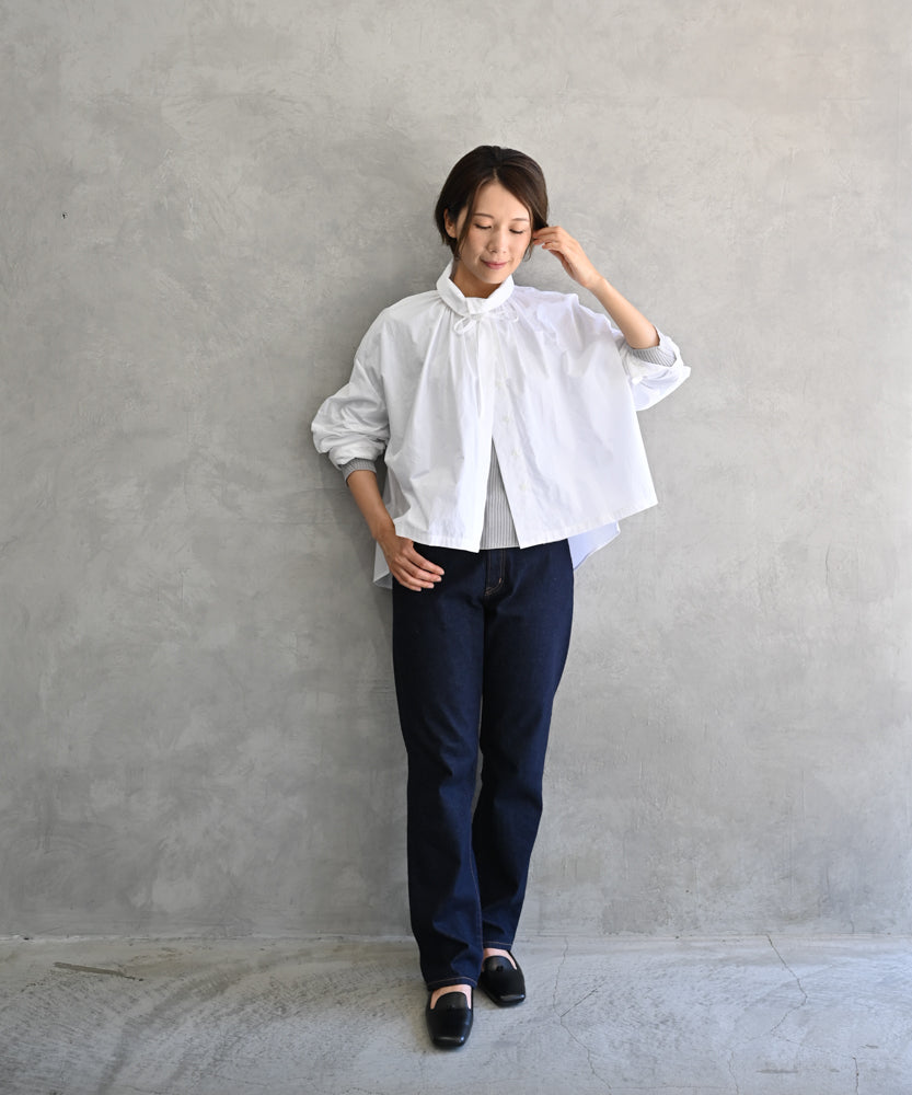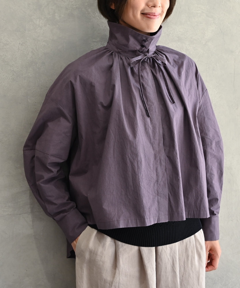 こちらは、衿の形が特長のmuucらしいデザインです。衿を立てても折っても着ていただけますし、さり気ないリボンを結んだり絞ったり垂らしたりでき、ボタンを留めるのはもちろん、前開きなのでボタンを開けて羽織りとしても着ていただけますので、様々なスタイリングをお楽しみいただけます。肩回りや身幅にゆとりをたっぷり入れていますので様々な体型の方に着ていただけます。