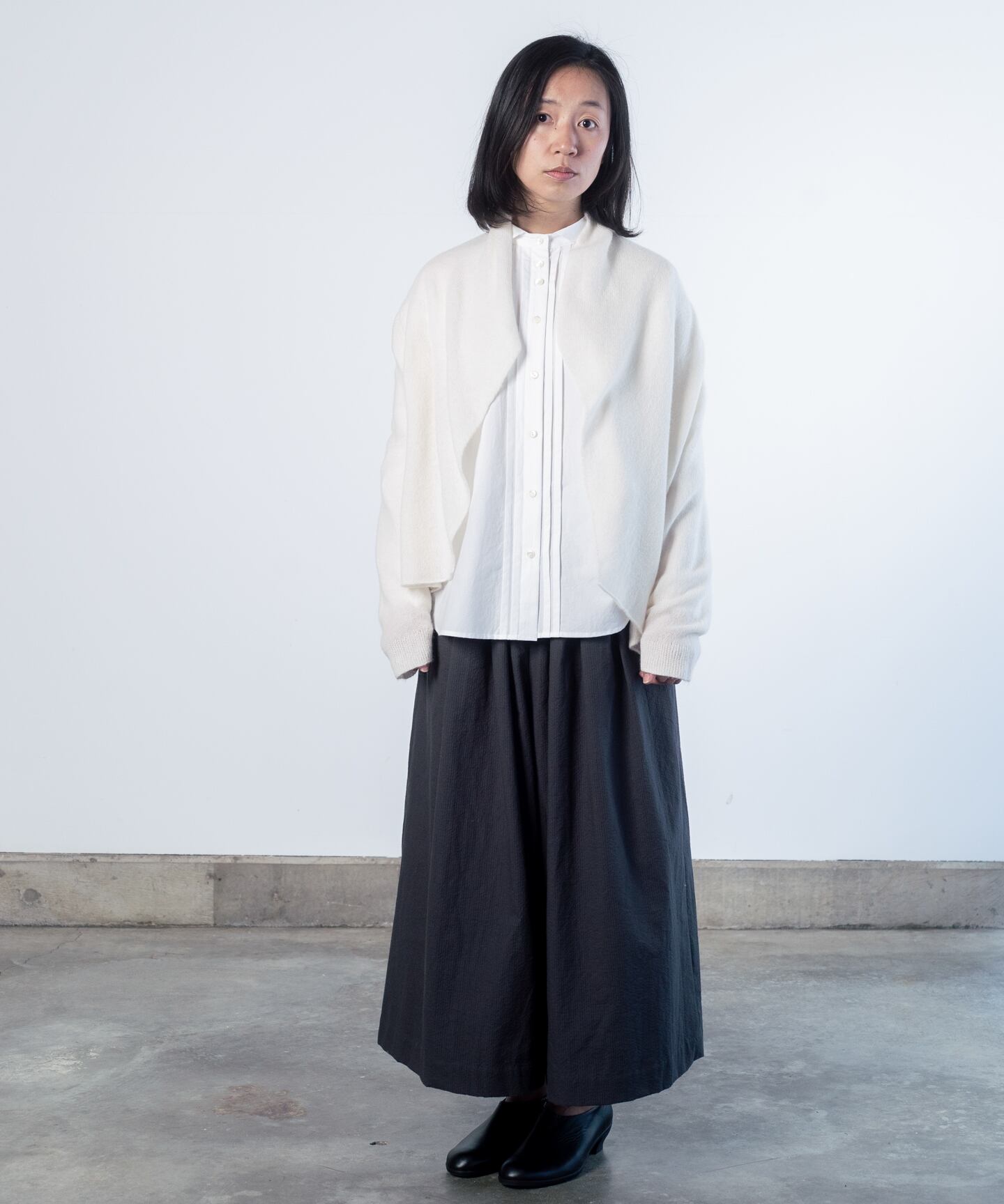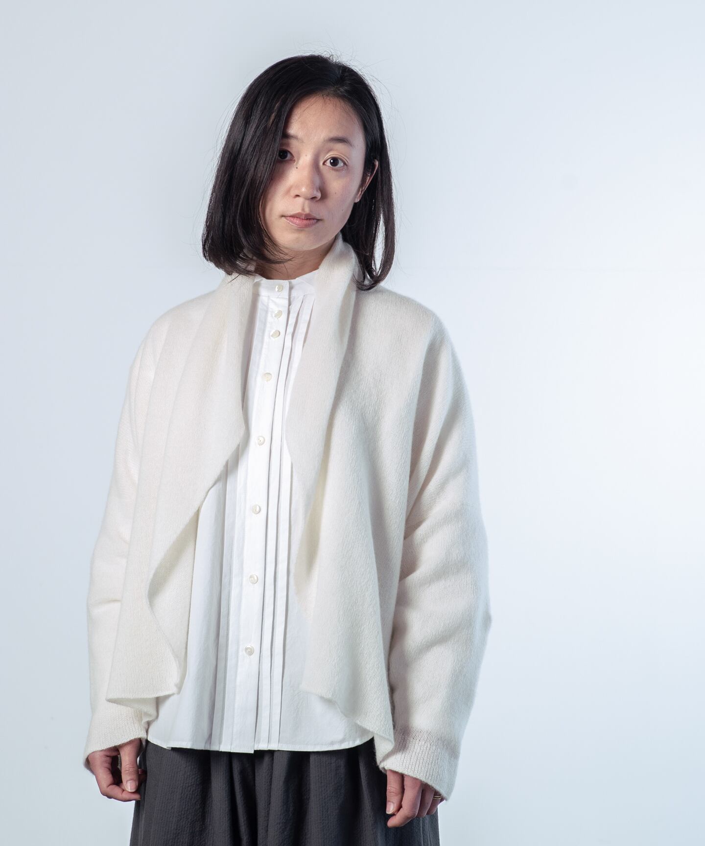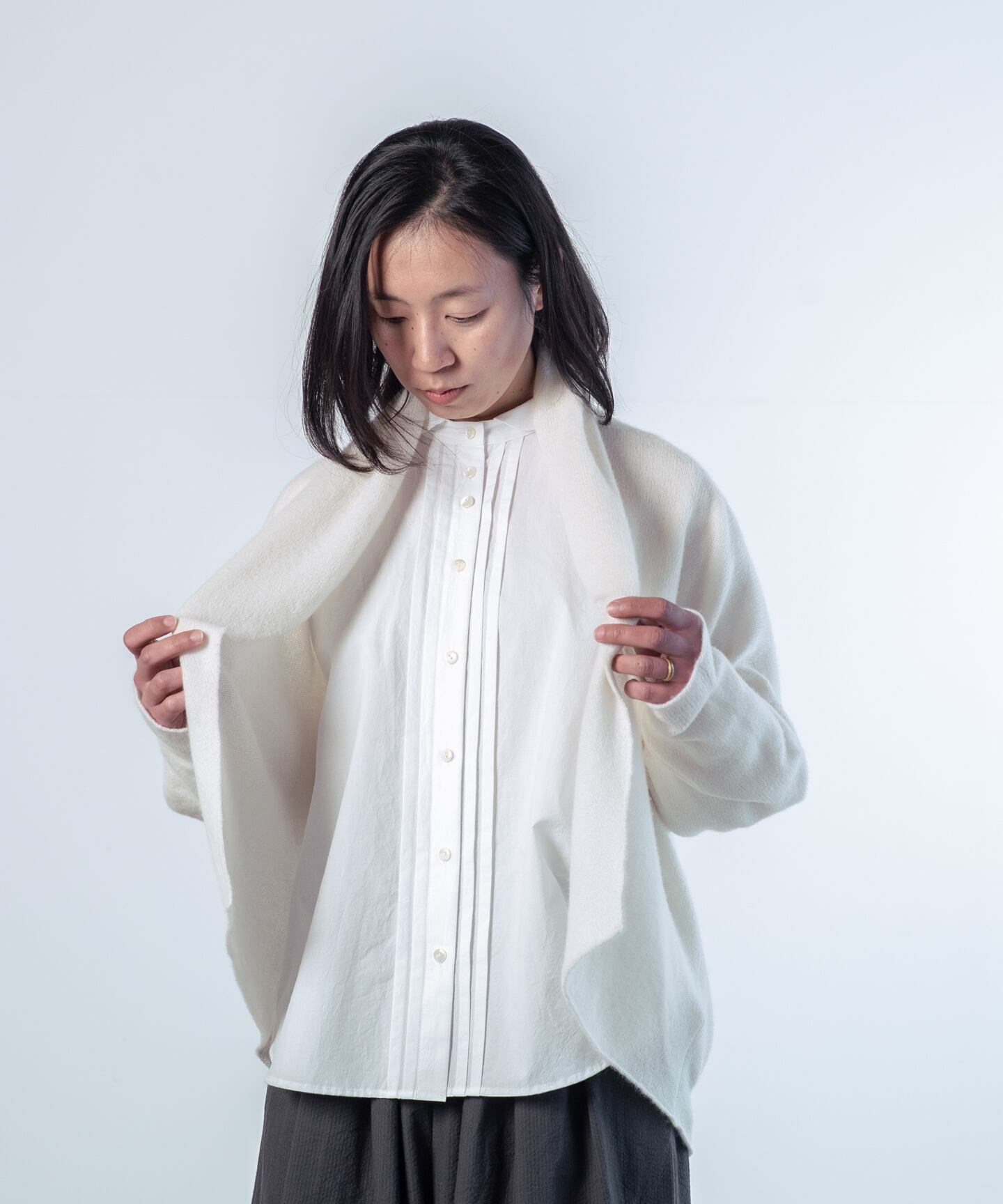 身幅にゆとりがあるフリーサイズで、襟は広げたり、ふわっと首周りにためたり、上下をひっくり返して着ることもできるので、着方を楽しんでいただければと思います。