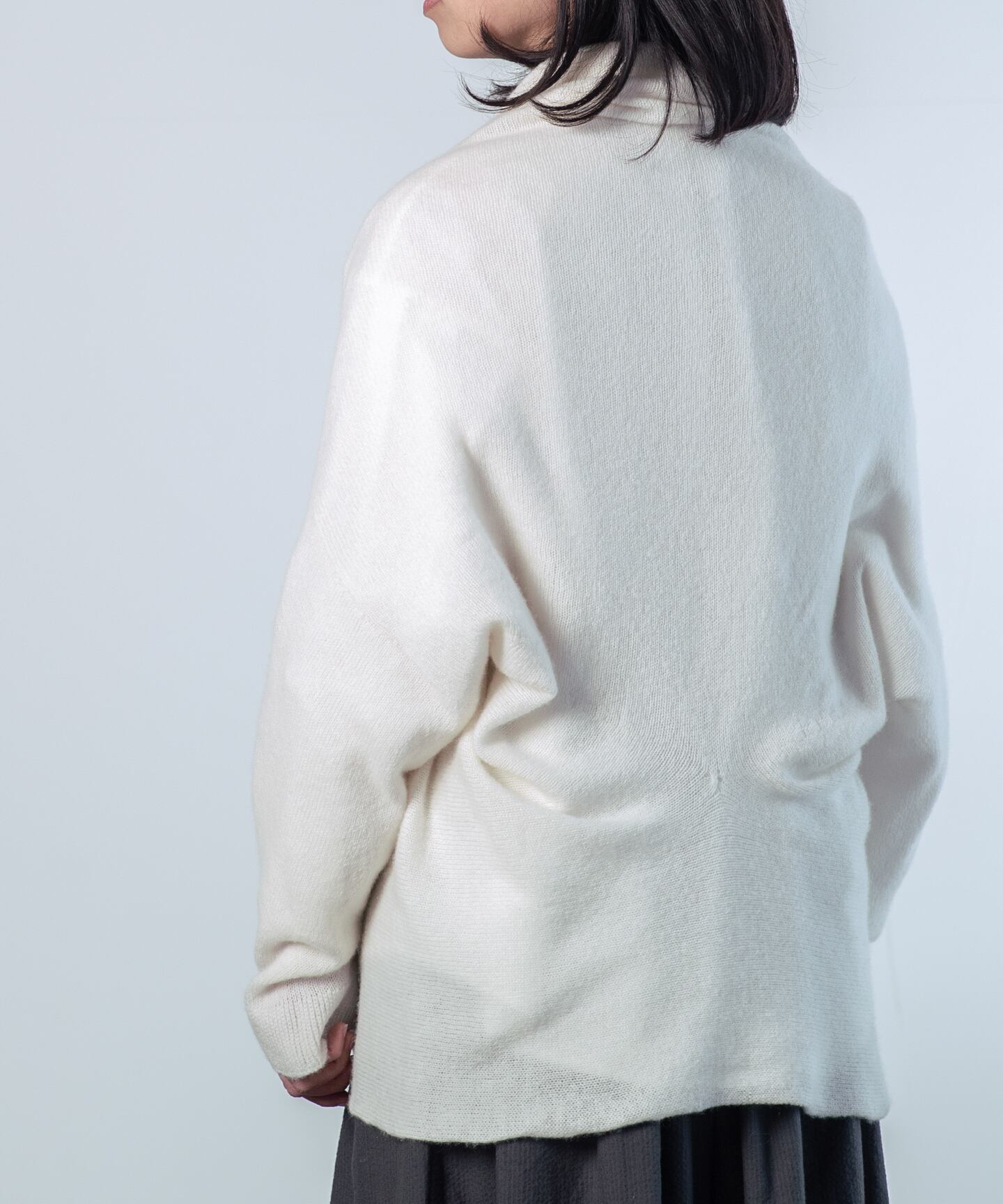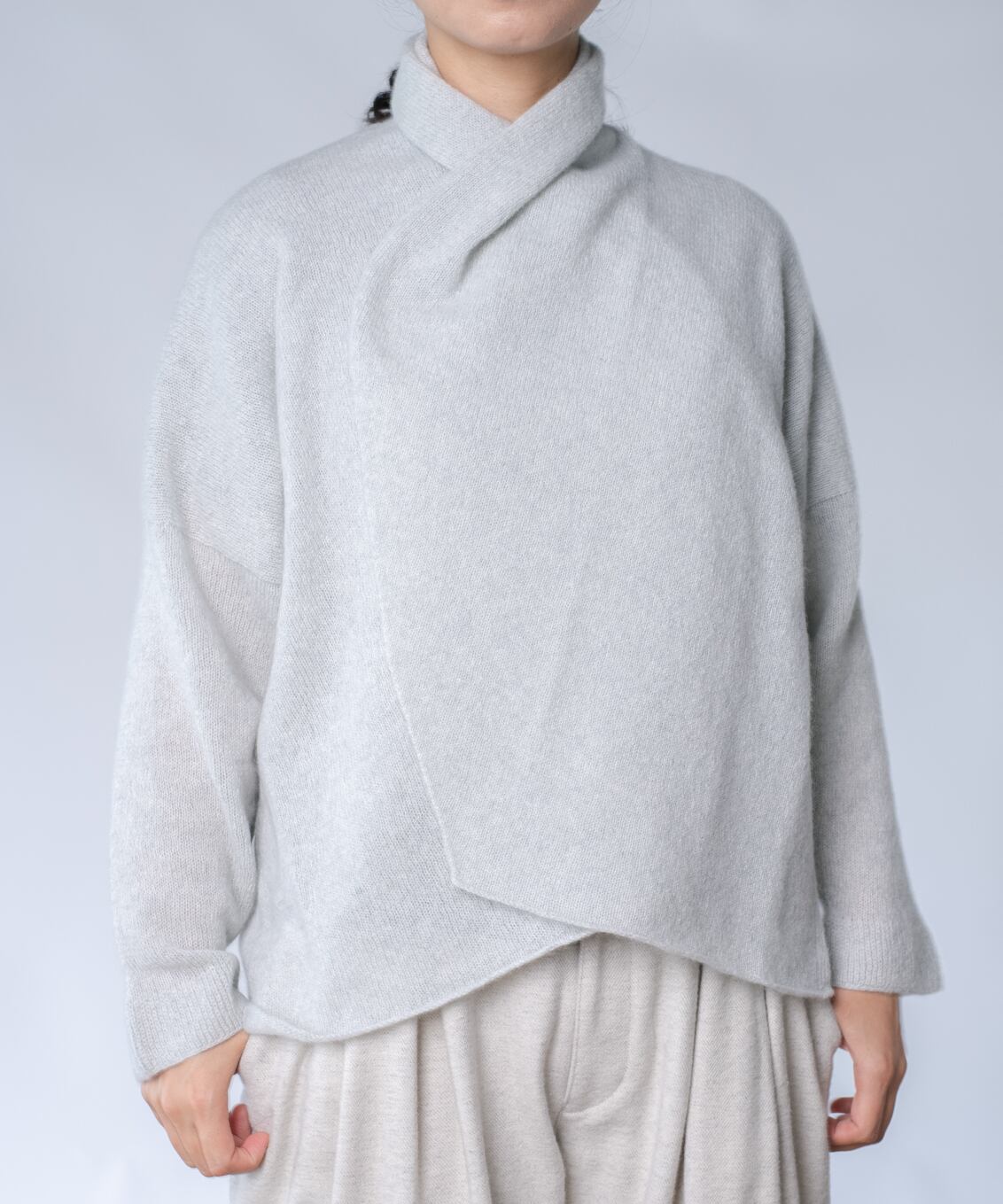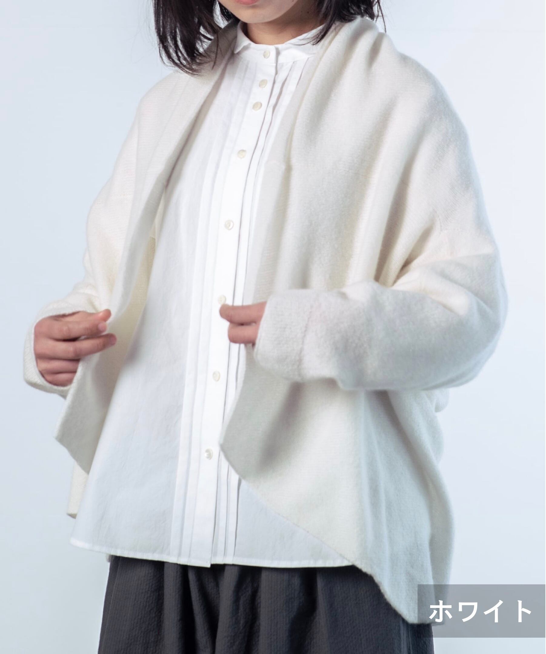 身幅にゆとりがあるフリーサイズで、襟は広げたり、ふわっと首周りにためたり、上下をひっくり返して着ることもできるので、着方を楽しんでいただければと思います。