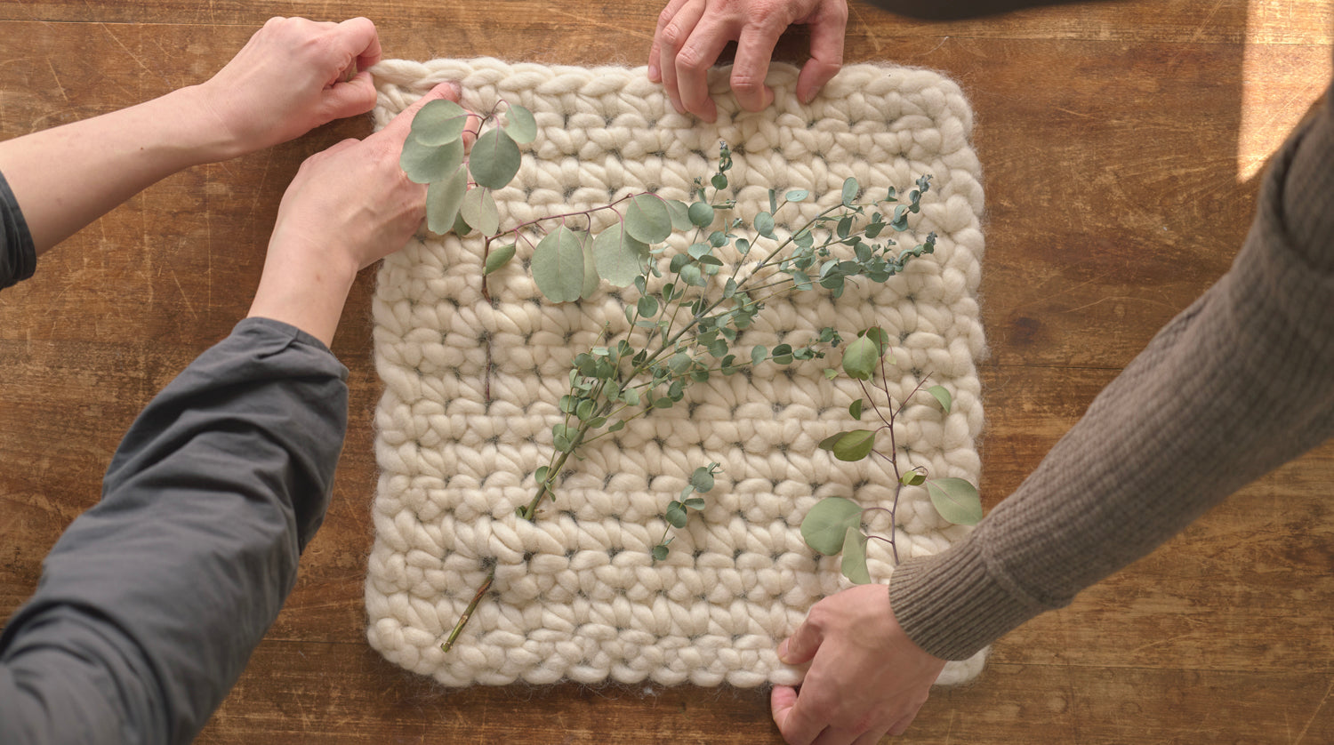 本ワークショップでは、毛糸になる前の羊毛を使い、指だけで編む「細編み」の技法を体験します。 まずは練習として、小さなコースター(鍋敷きとしても使用可)を制作し、こちらはそれぞれお持ち帰りいただけます。 その後、イベント当日に展示されるタペストリーの一部を編んでいただきます。