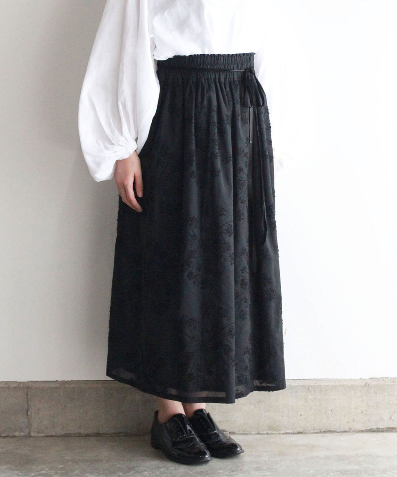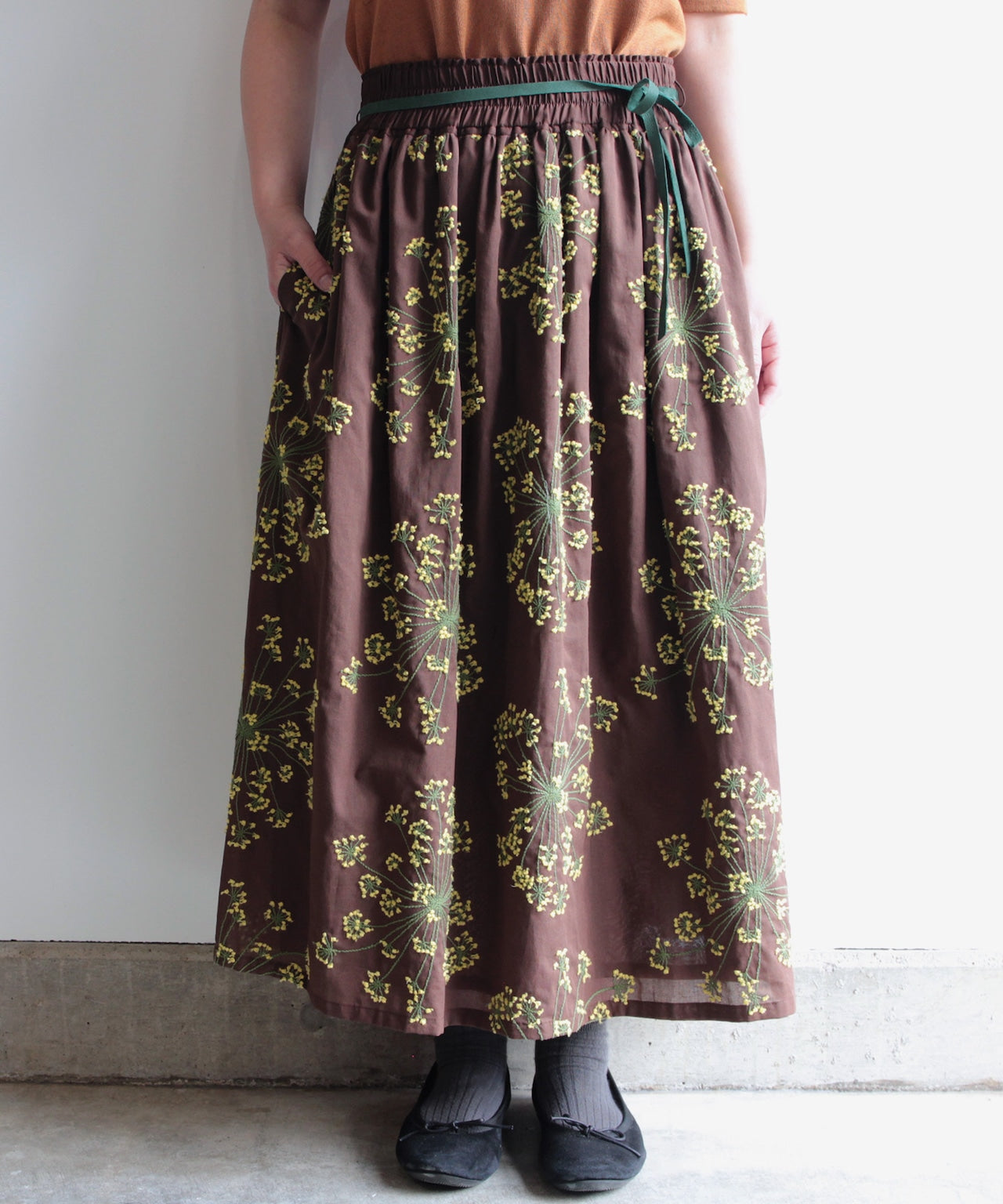 こちらのフェンネル刺繍スカートは、ウエストがゴム仕様になっており、イージーサイズです。