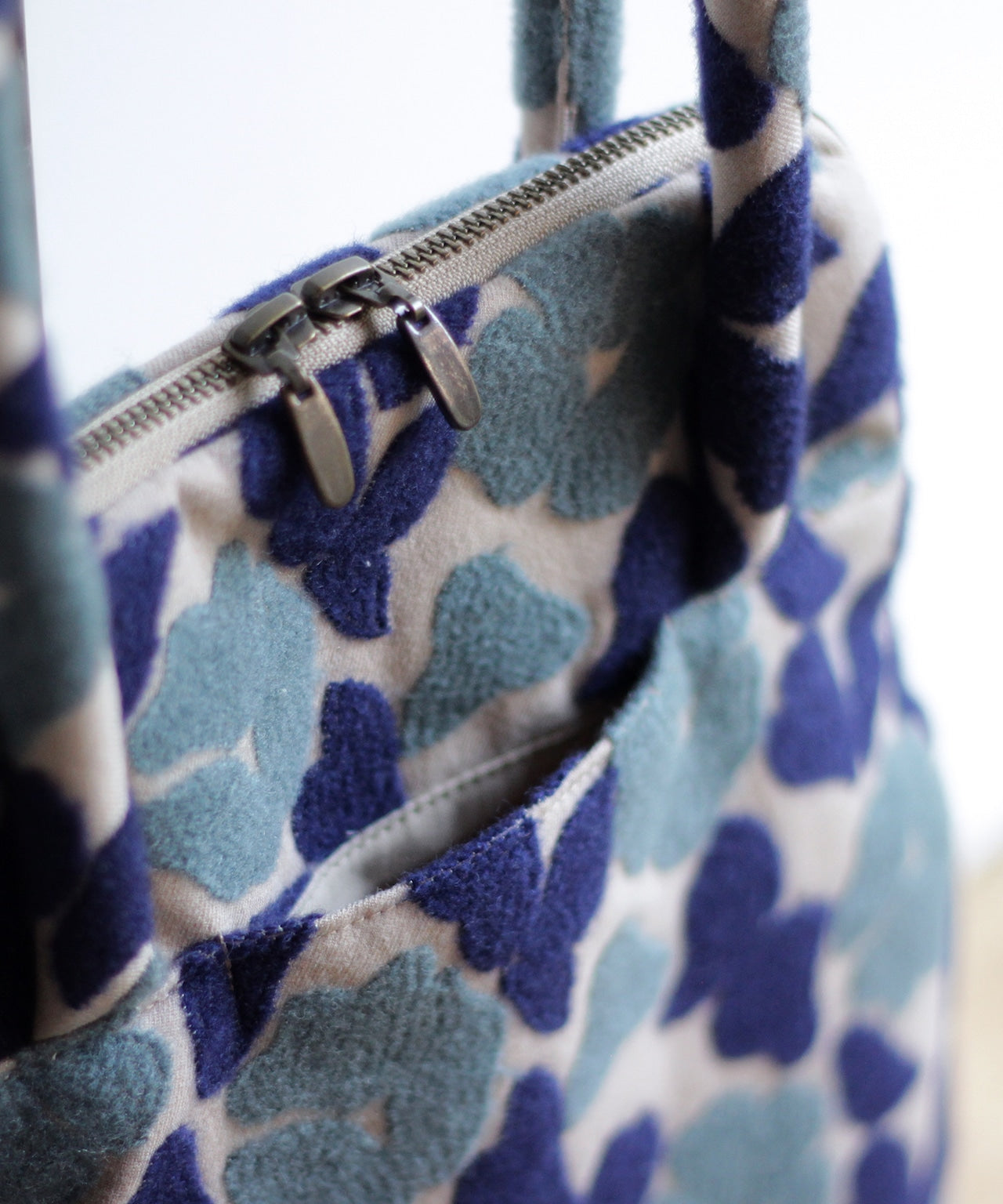 椿をイメージした手刺繍を思わせるような立体的な刺繍を、福井県の刺繍工場に作っていただき、そのオリジナルテキスタイルをバッグにしました。