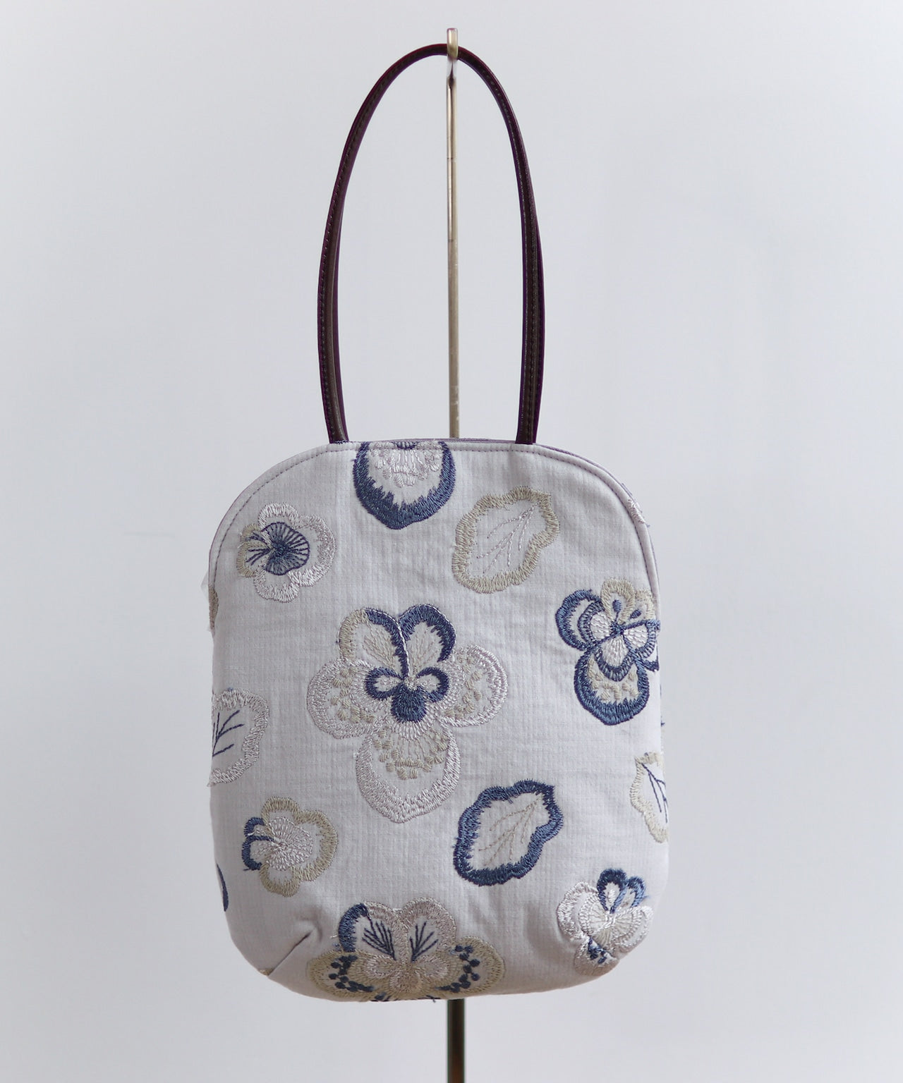 刺繍は、一度 手を使って刺繍をし図案をつくり、その刺繍図案を刺繍職人さんたちの力で刺繍機械で再現する。という ひと手間かけた方法で制作しています。 今回はビオラの花を刺繍しました。