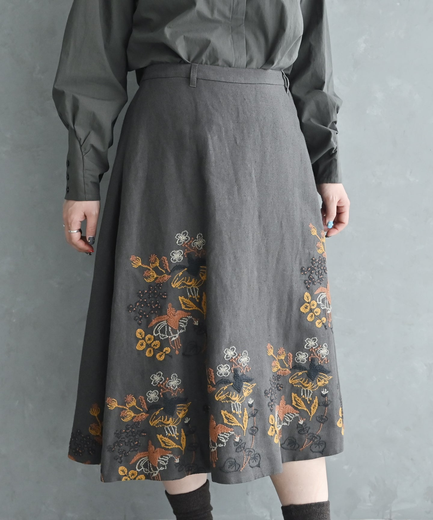 〈遠州織物 リネンウール〉フクシアの花刺繍 フレアースカート (muc202)