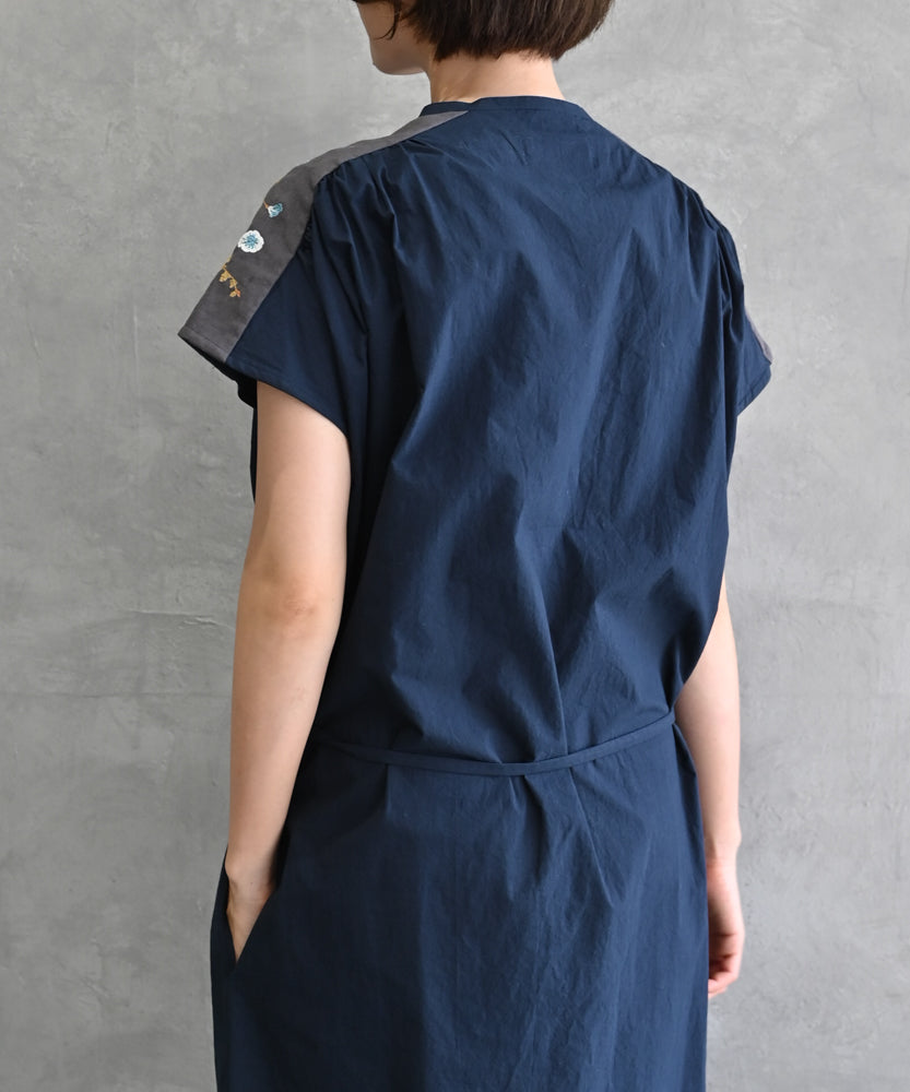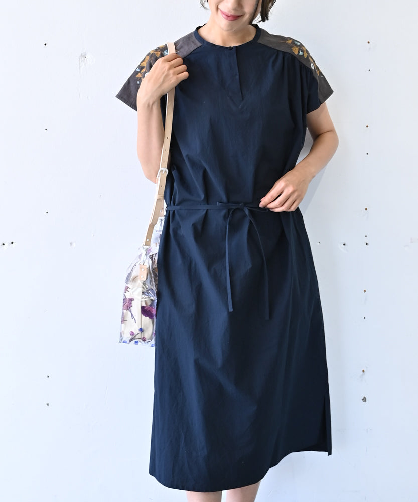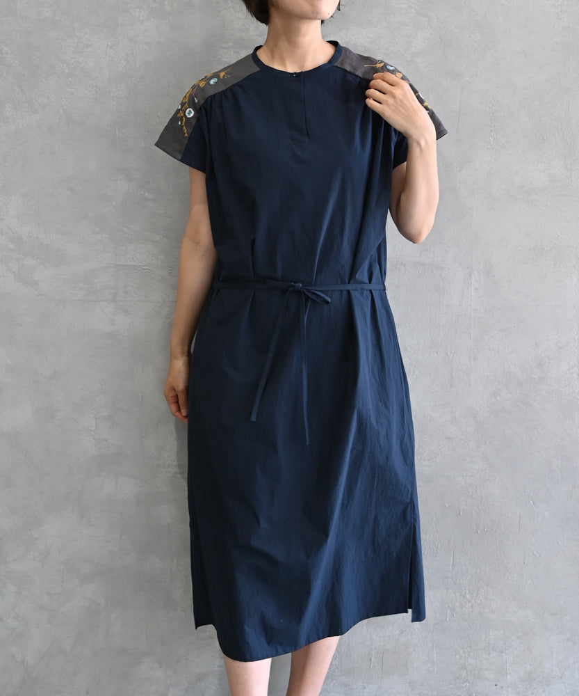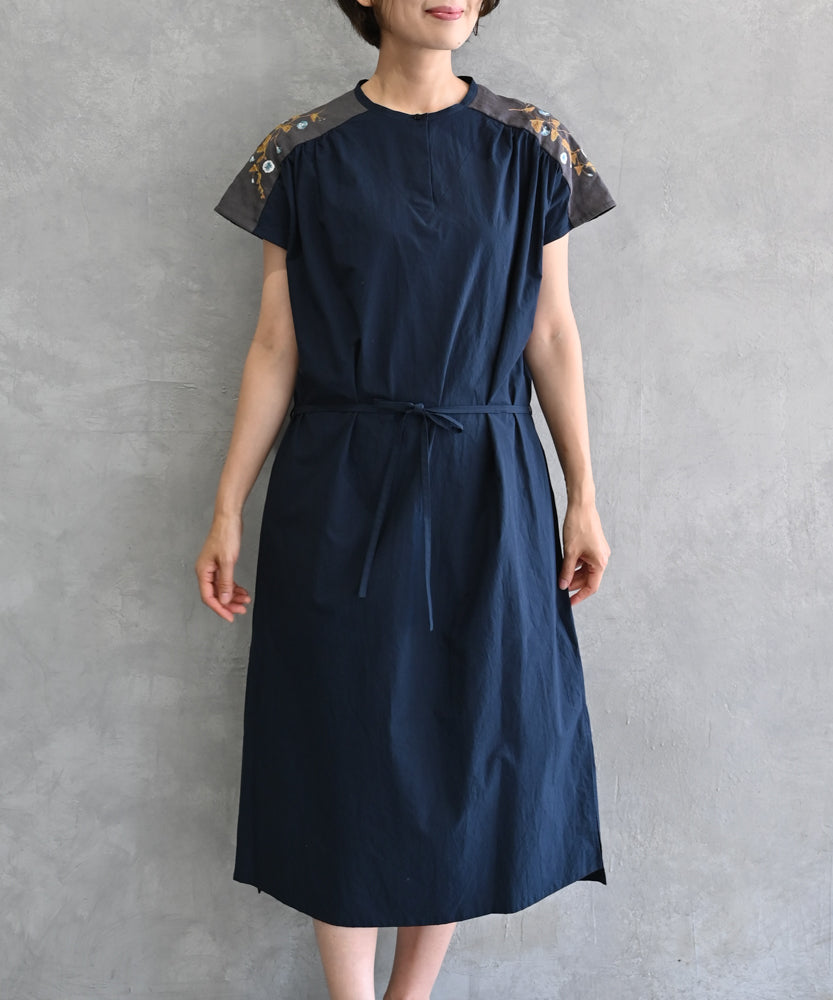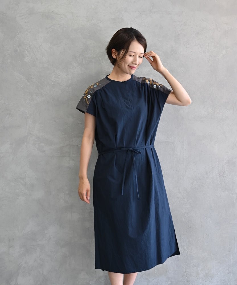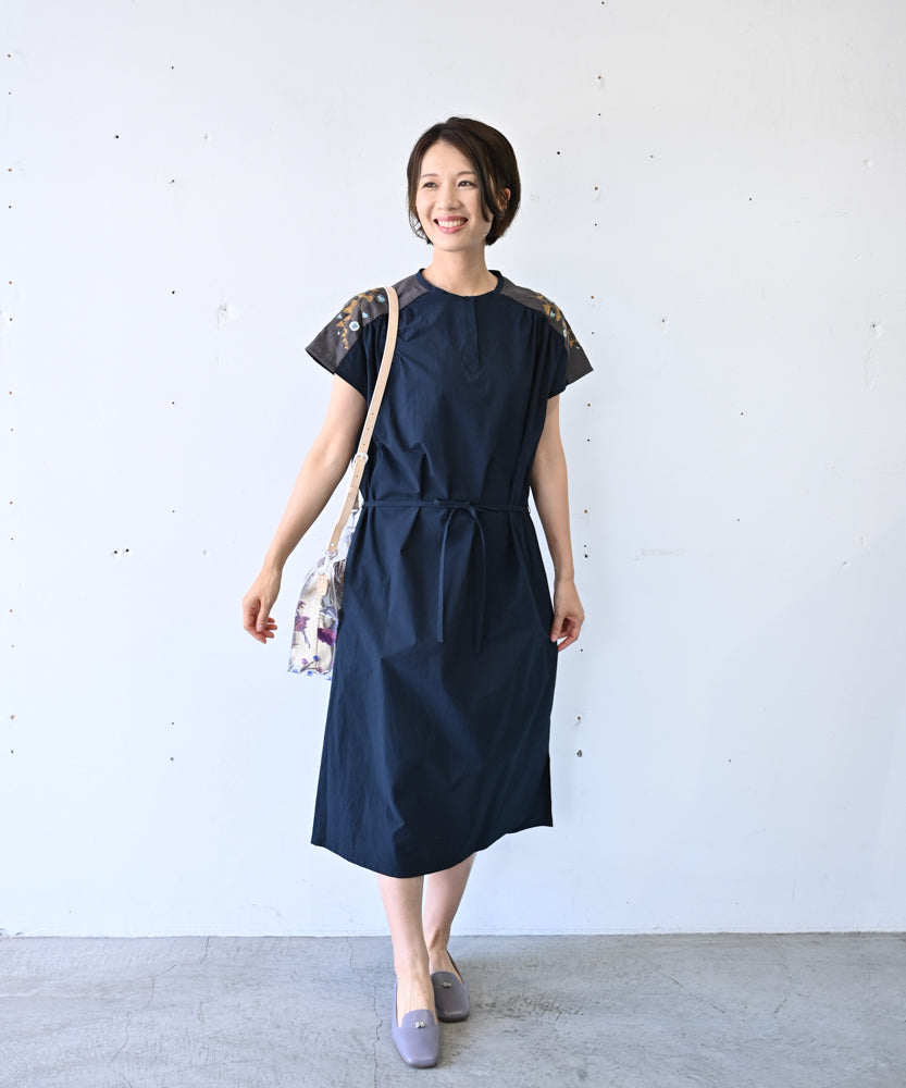〈遠州織物〉〈涼しいドライタッチ生地〉ウエスト紐付き フレンチスリーブ フロントギャザー ヒルガオの花刺繍 ワンピースドレス (muf601)