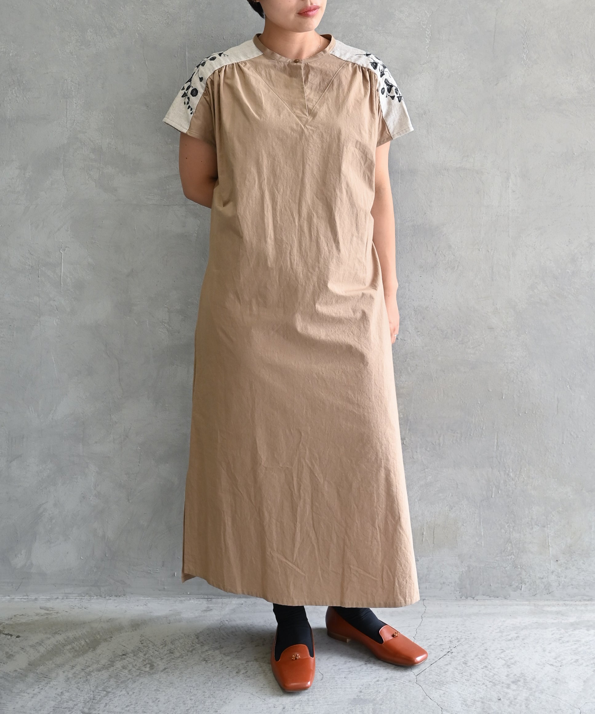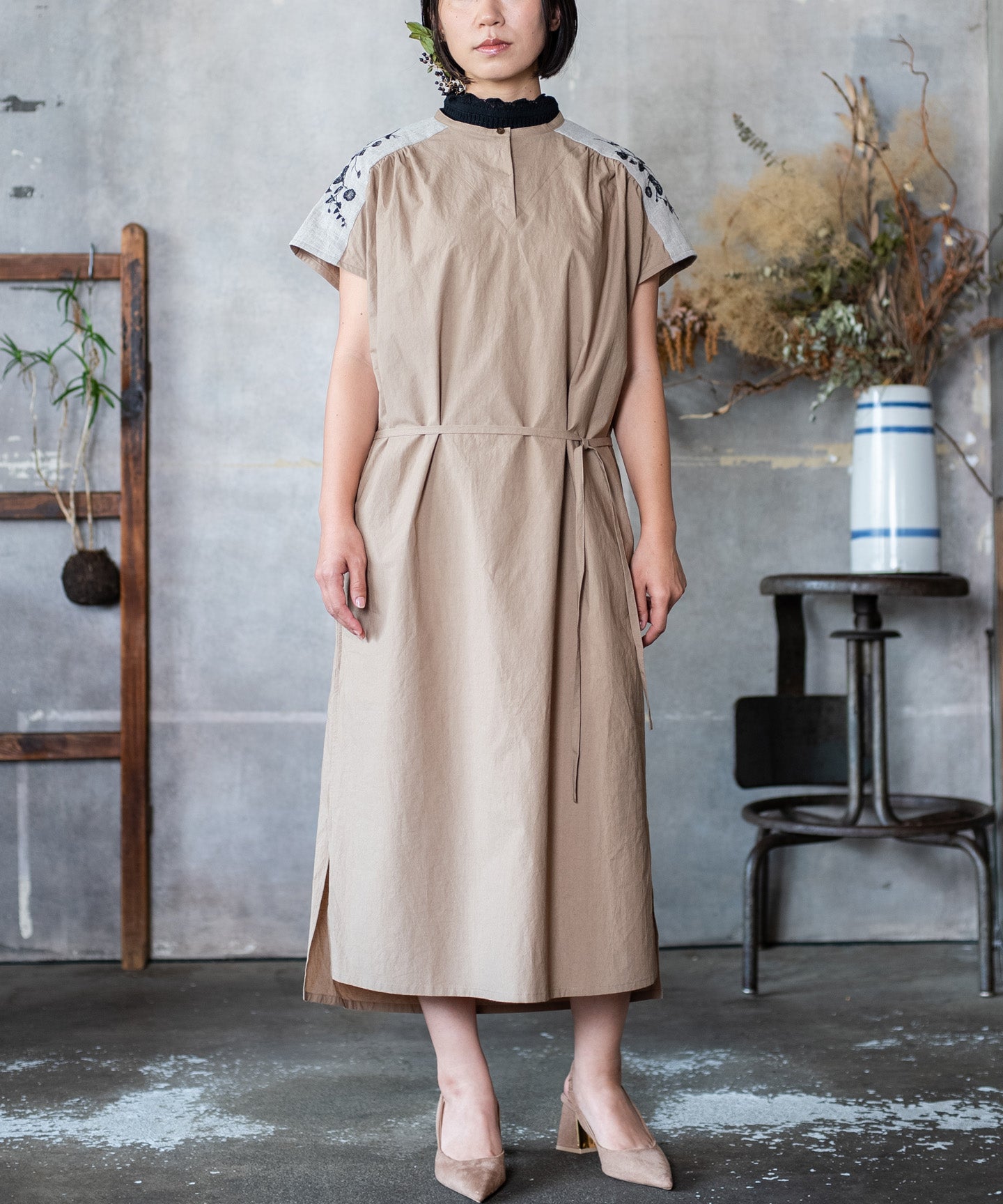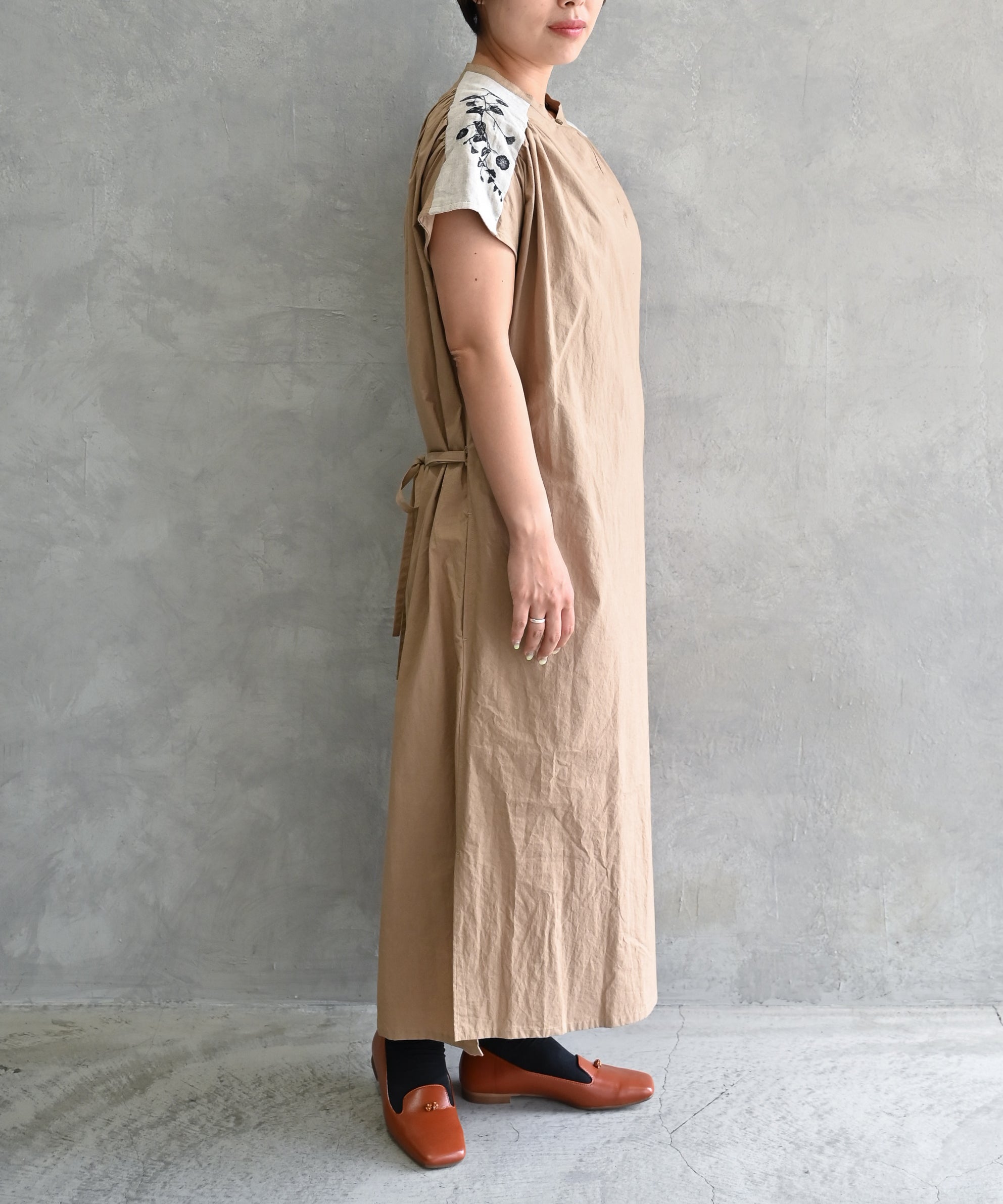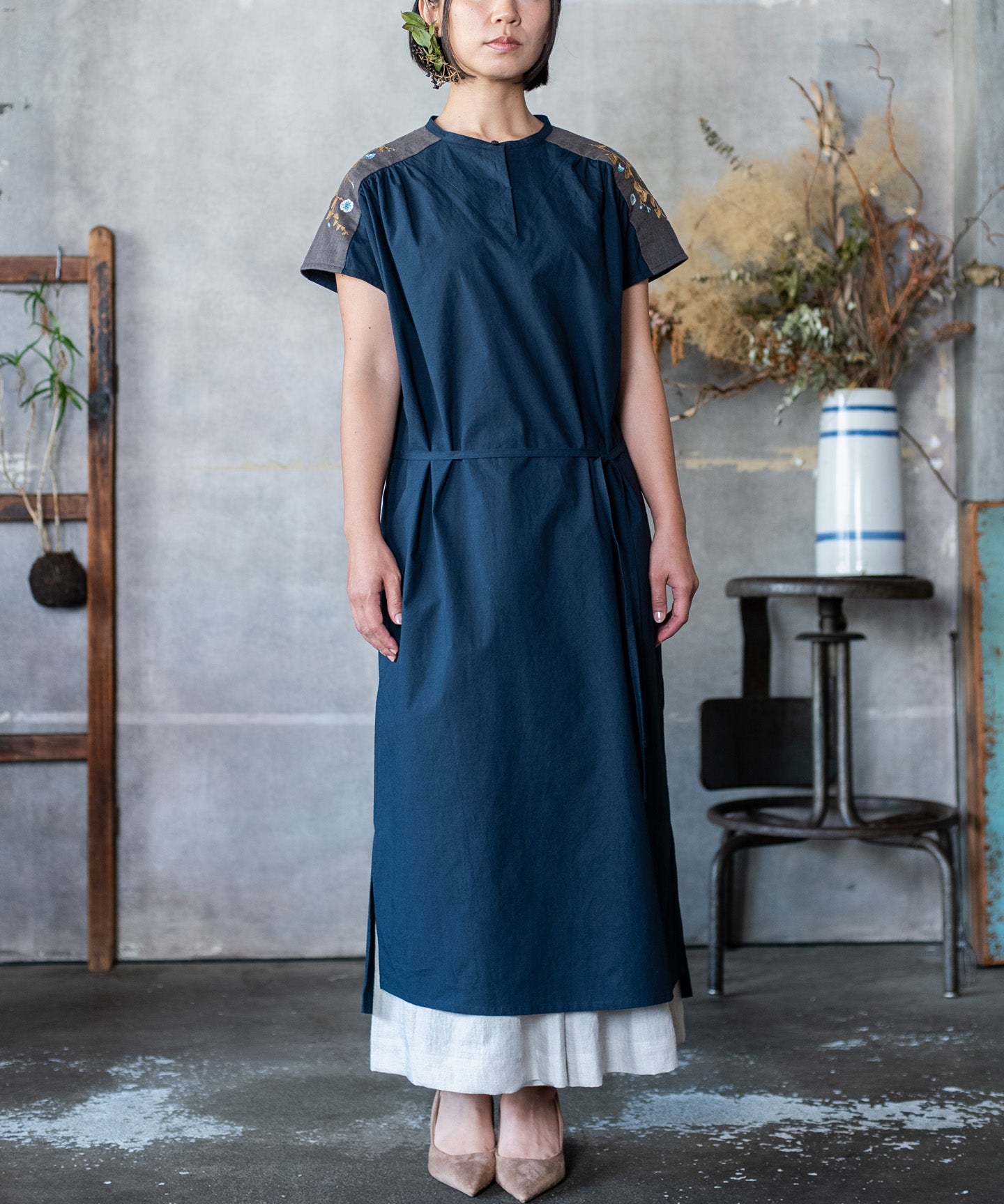 〈遠州織物〉〈涼しいドライタッチ生地〉ウエスト紐付き フレンチスリーブ フロントギャザー ヒルガオの花刺繍 ワンピースドレス (muf601)