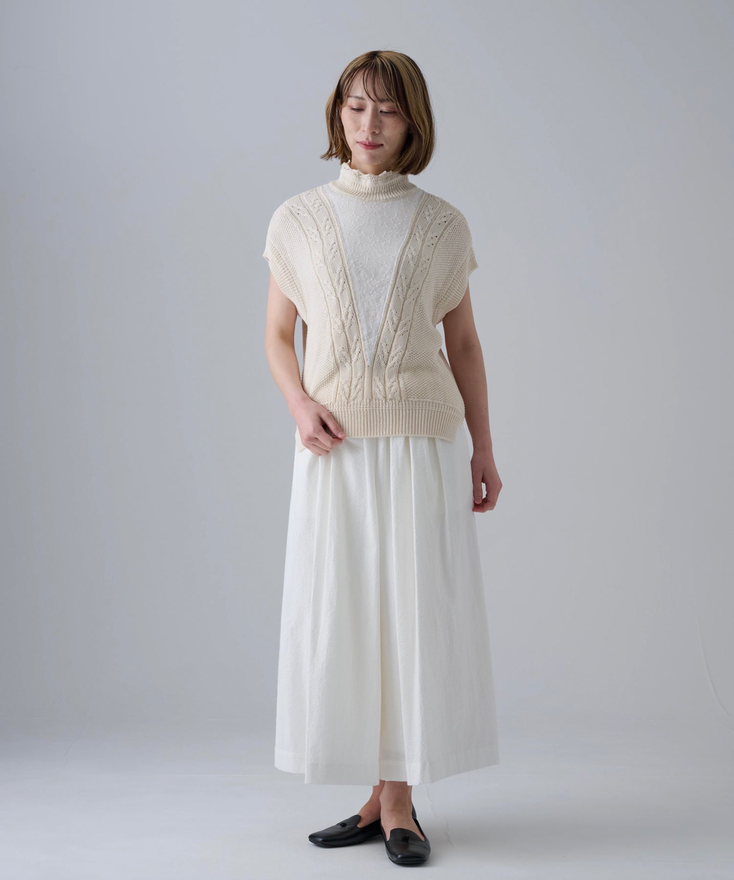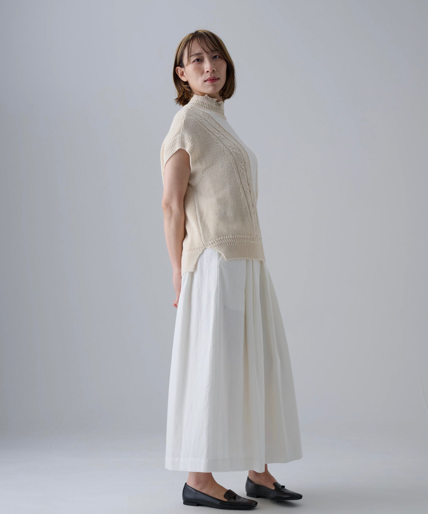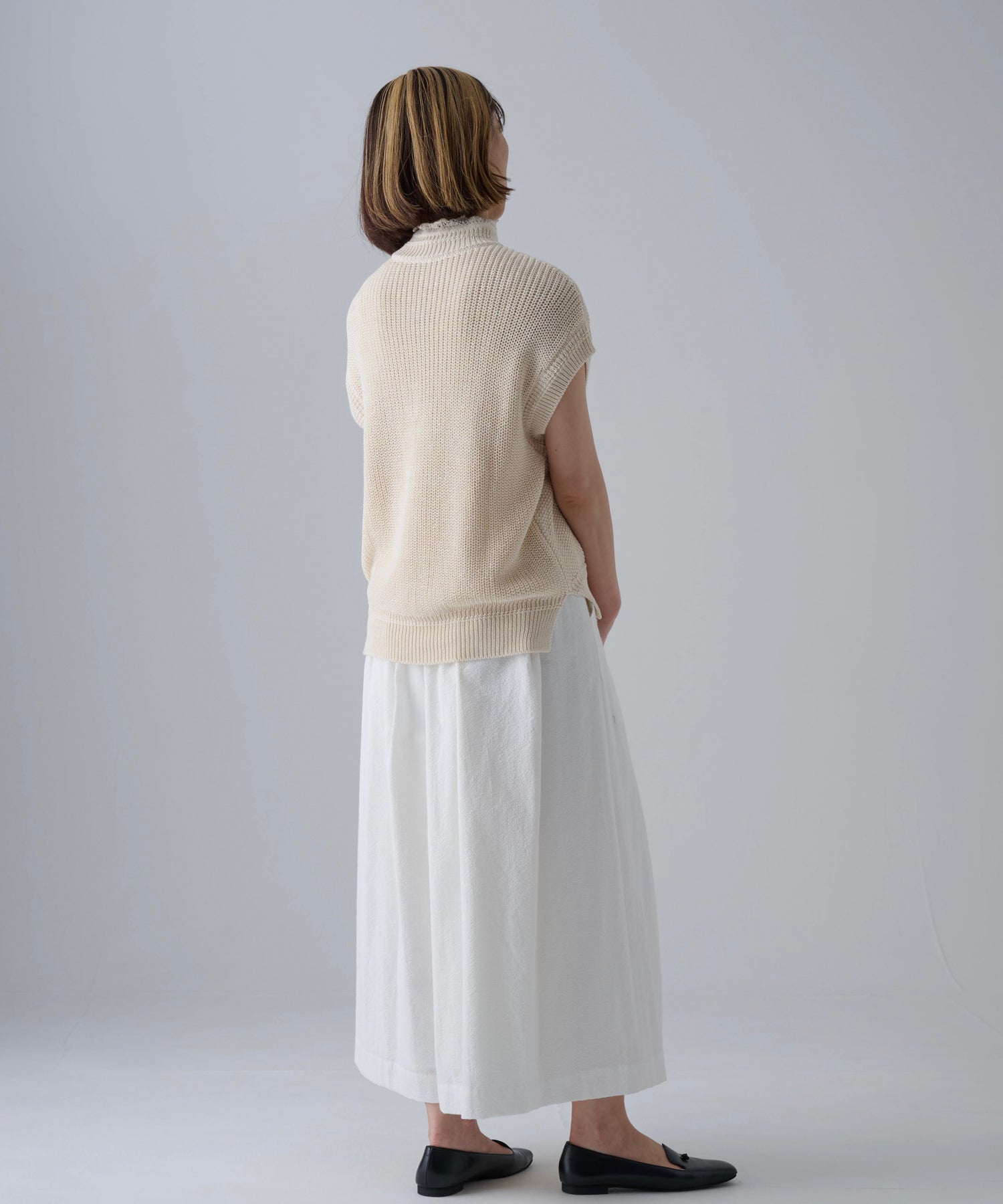 オーバーシルエットなので様々なスタイリングをお楽しみいただけます。サイドリブに前後差もあるので重たい印象にならず、パンツやロングスカートなどとのコーディネートはもちろん、ワンピースの上から着ていただくスタイリングもお勧めです。