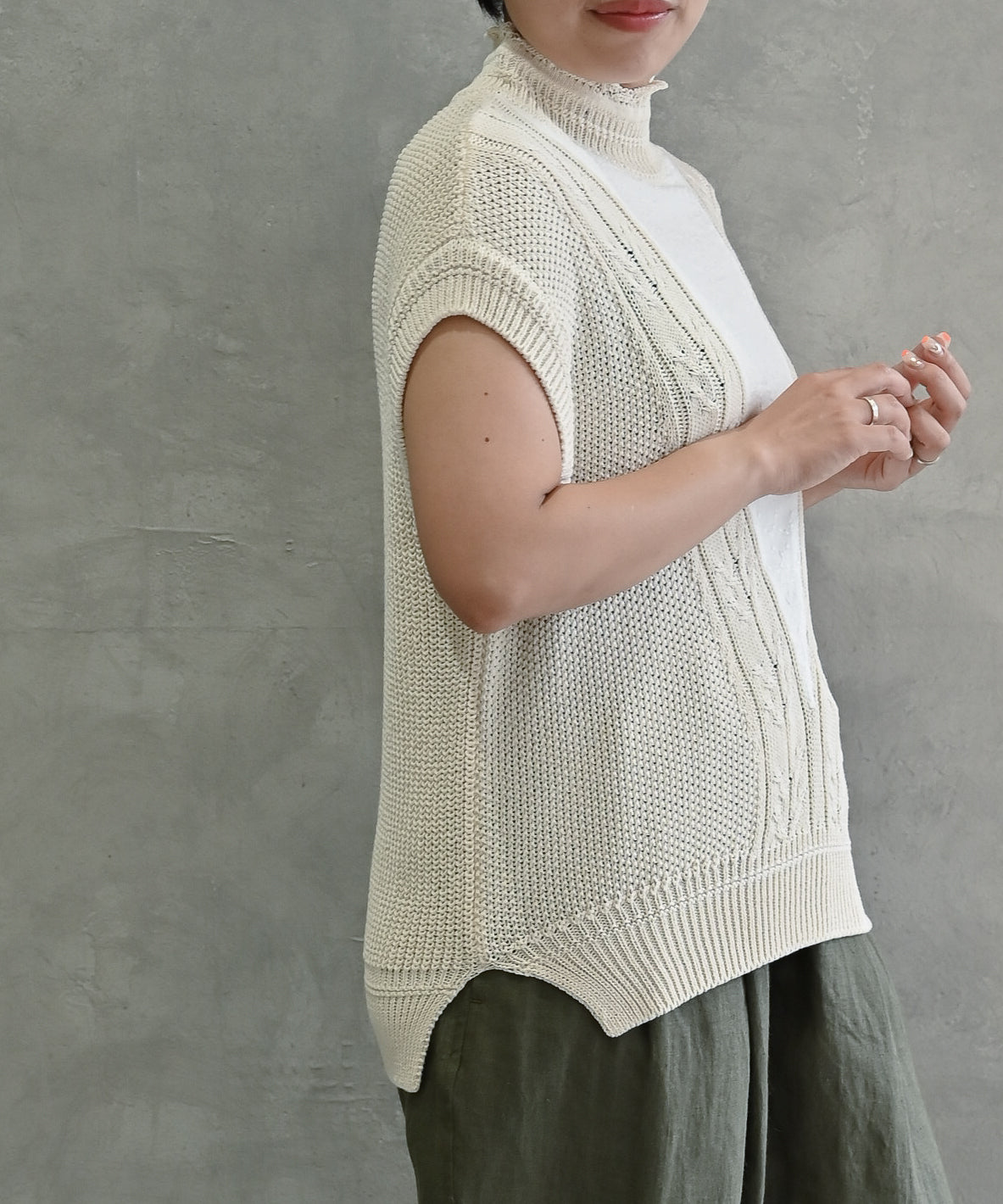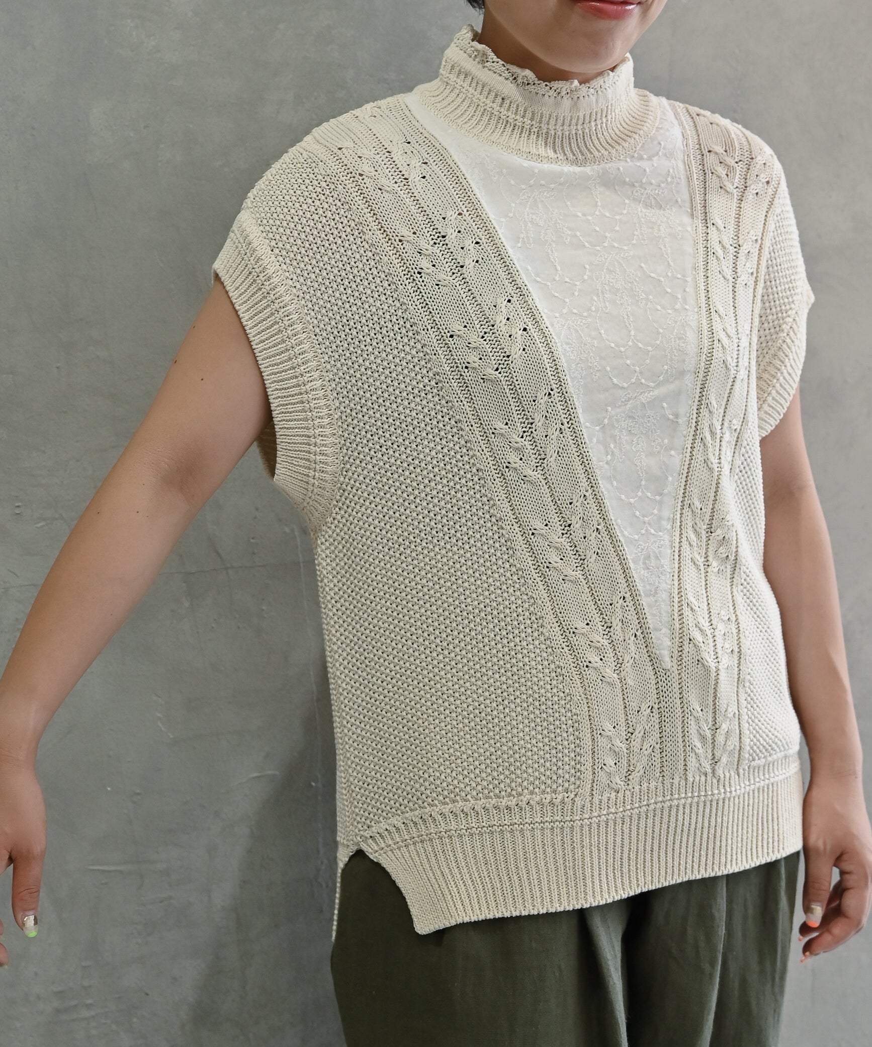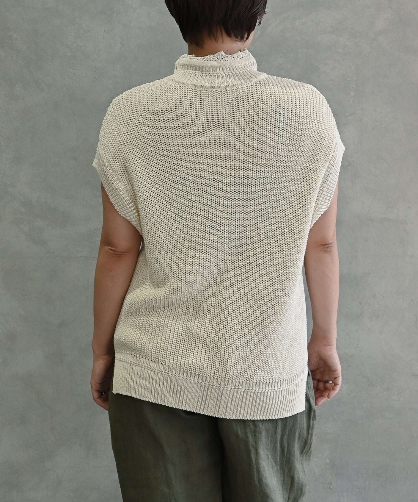 こちらは、汗ばむ季節でもさらっとした着心地を感じていただけるドライタッチなニットベストです。