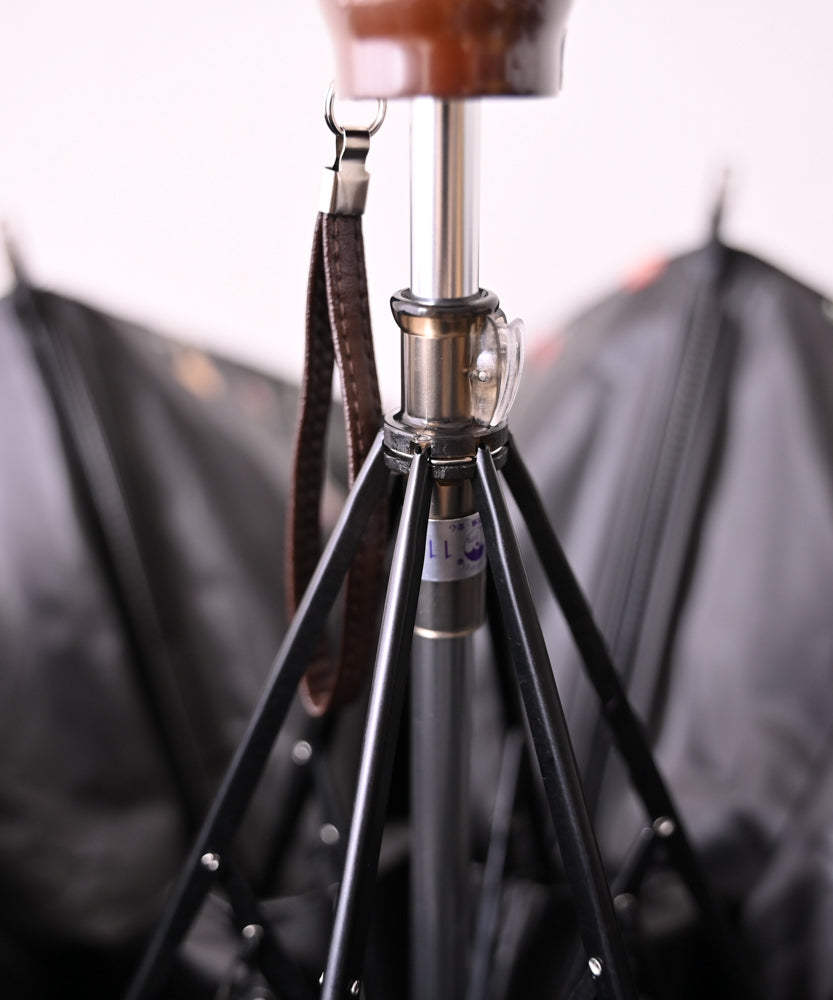 傘骨は、構造の一部に東レ高性能カーボンファイバーのトレカを使用しています。トレカは軽量且つ耐久性に優れた特性を持ち、飛行機の主翼や胴体部、スポーツ用品、宇宙用途など幅広く使用されている素材です。持ち運び時のストレスを少しでも減らせるように軽く仕上げました。また、手動で開くタイプの傘です。開いた傘を固定させる金具の部分で指を挟まないようプラスチックのカバーを付けました。安心してお使いください。