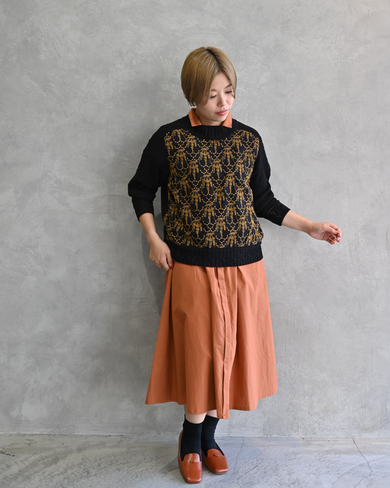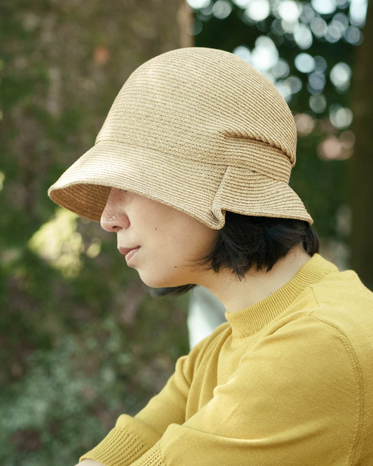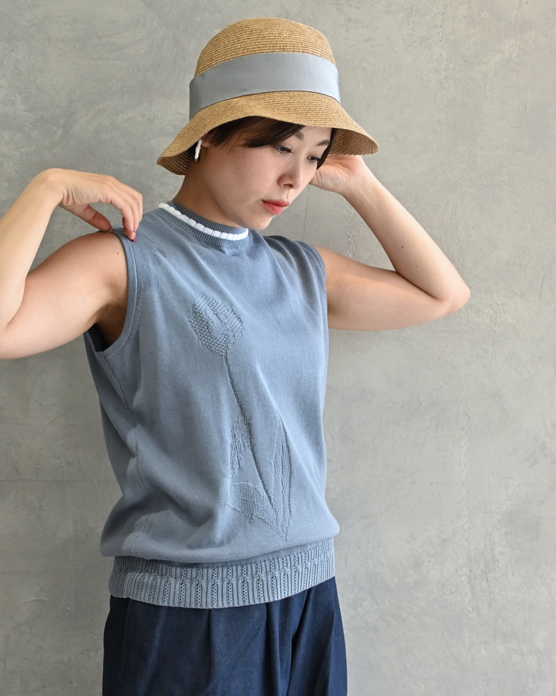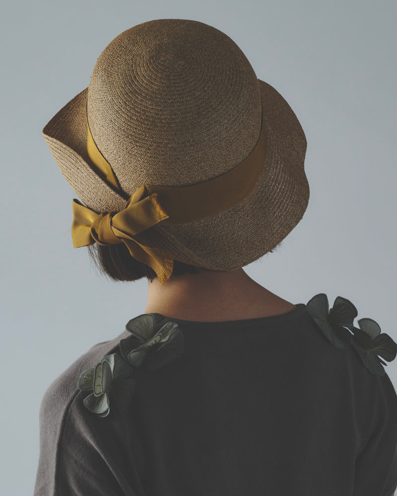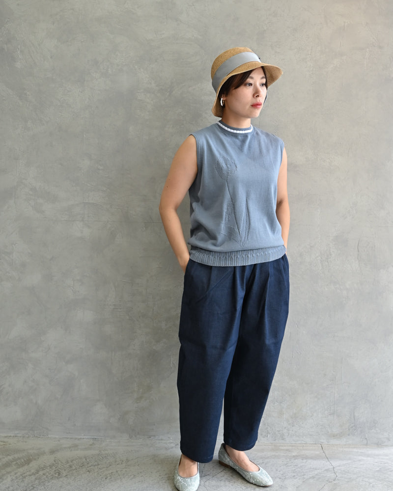 一般的なフレンチスリーブよりも袖丈を長めにし、二の腕を隠しやすくしております。肩をつくるセットインスリーブではなく、肩と袖が一体化したフレンチスリーブなので、肩回りが動きやすくなっています。