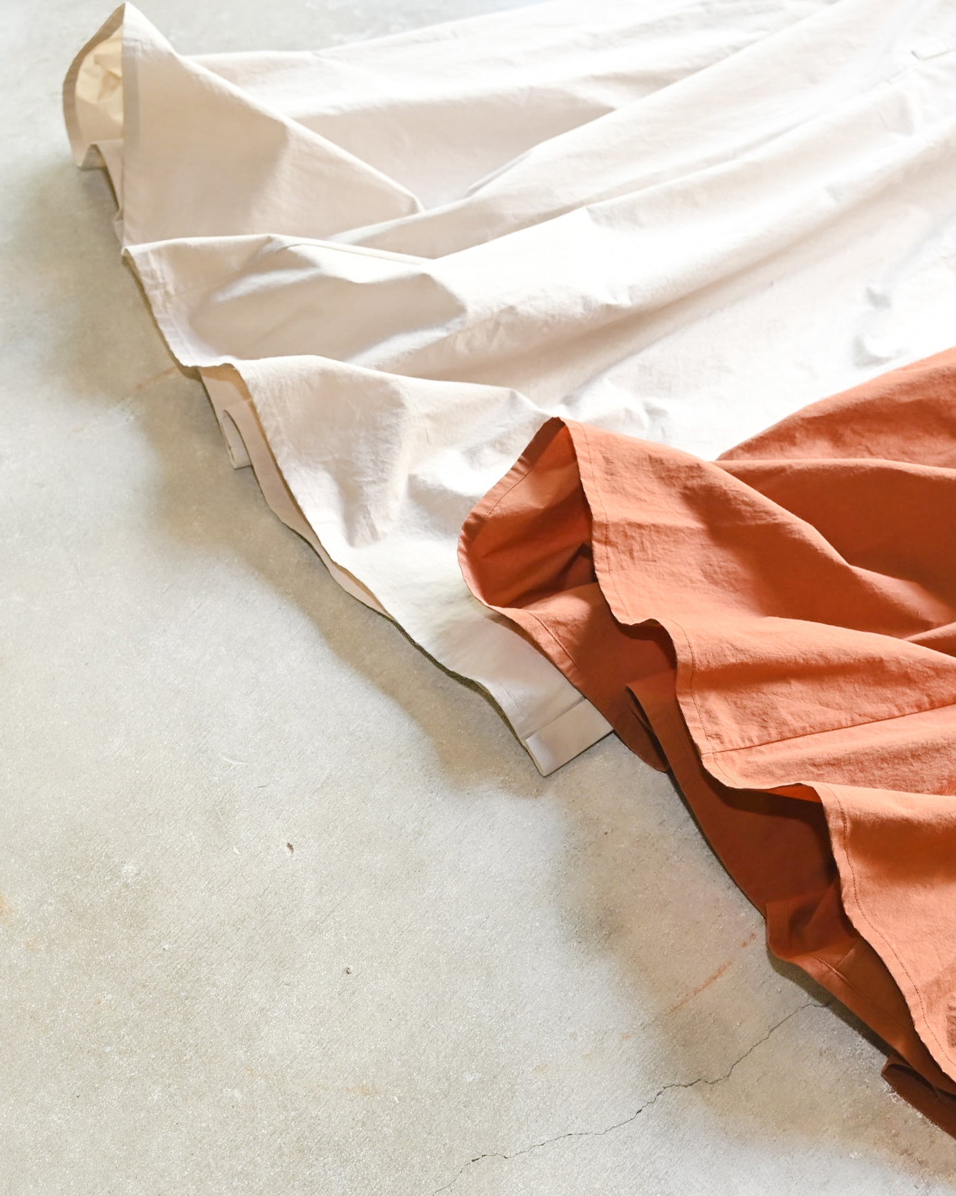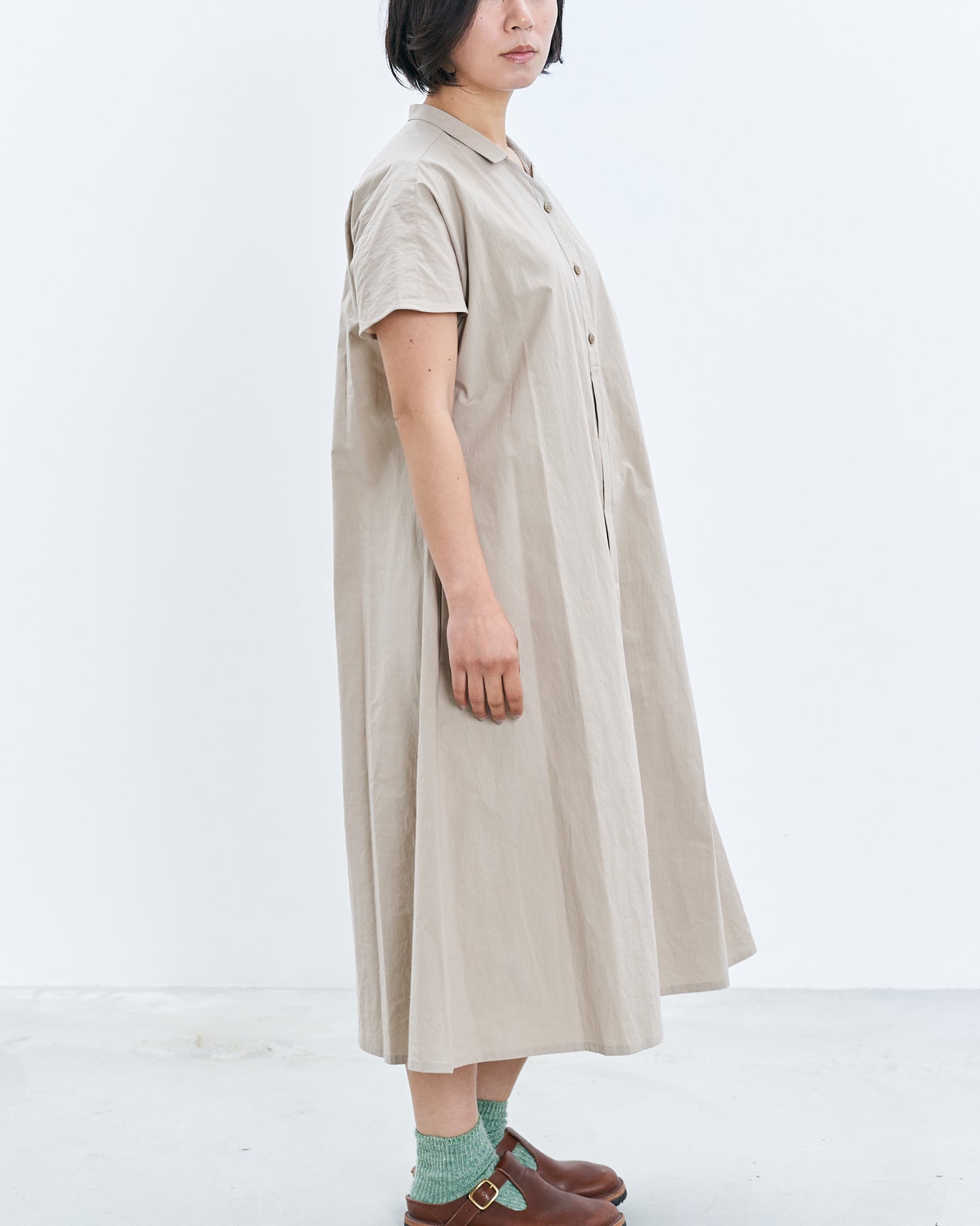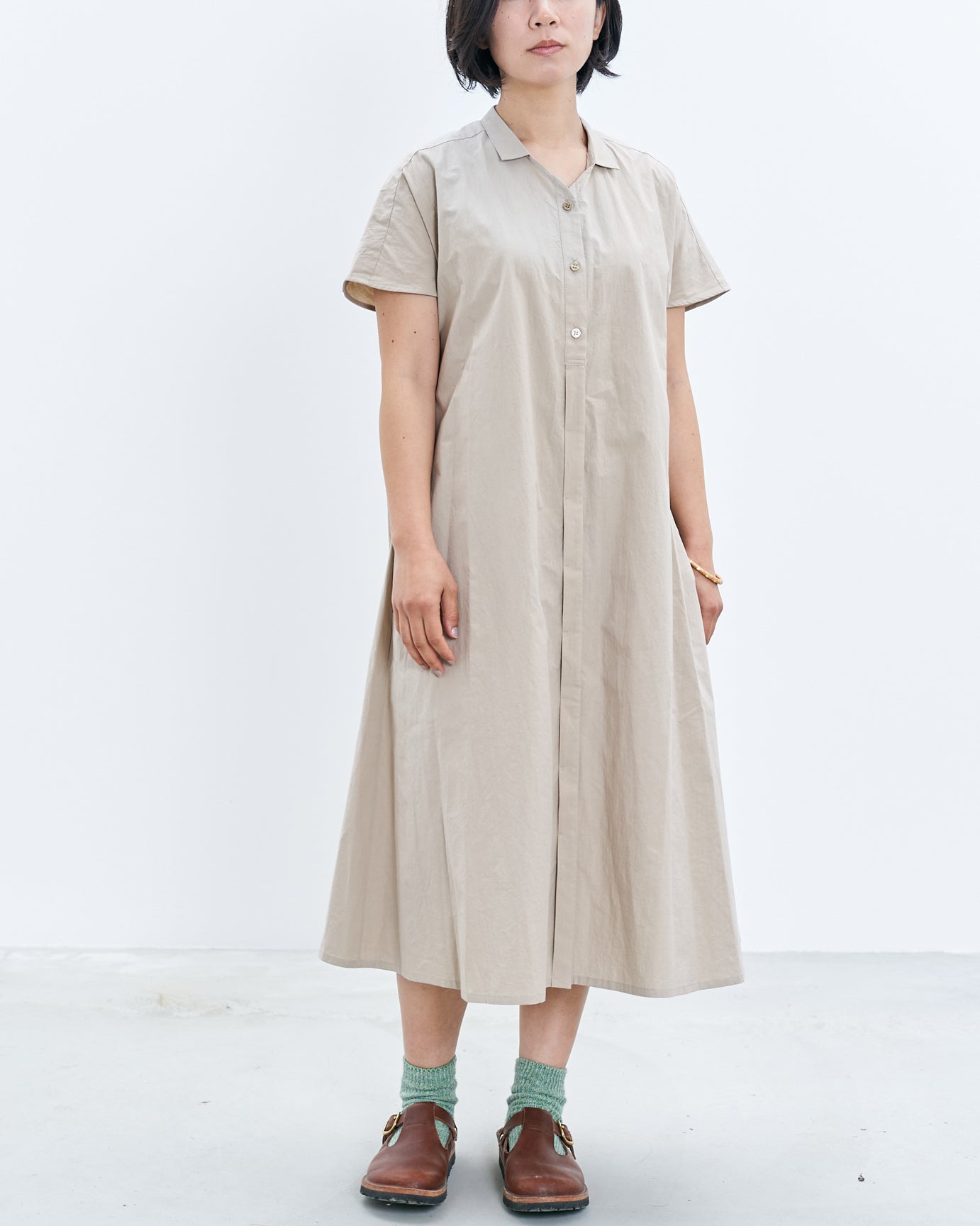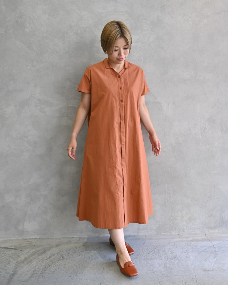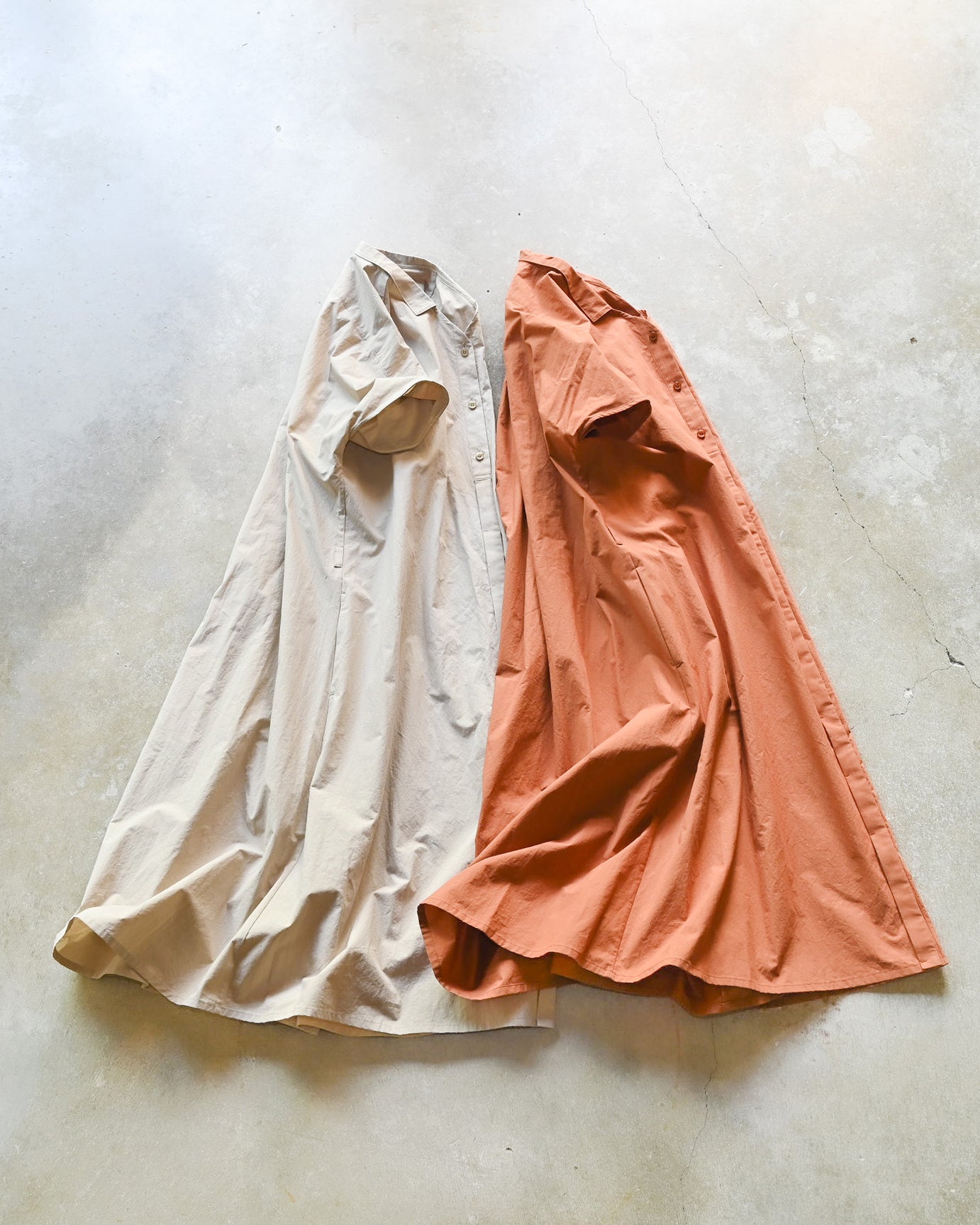 こちらのワンピースは、静岡県の遠州織物の工場で作られた上質なコットン素材の60/1タイプライター生地を使用しています。特殊な加工方法により、ドライタッチで肌離れが良く、汗ばむ季節も心地良くご着用いただけます。ナチュラルな風合いや細かなシワ加工があり、アイロンを綺麗にかけなくても美しくカジュアルな装いお楽しみいただけます。