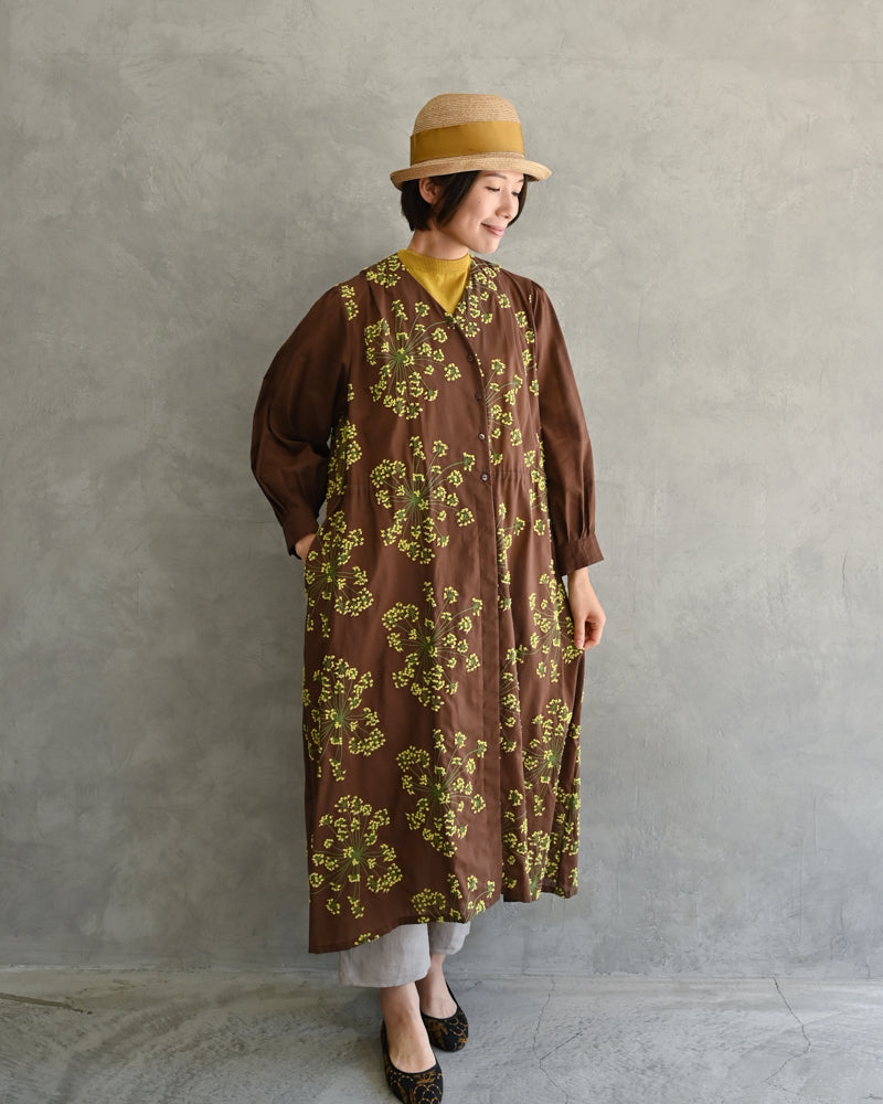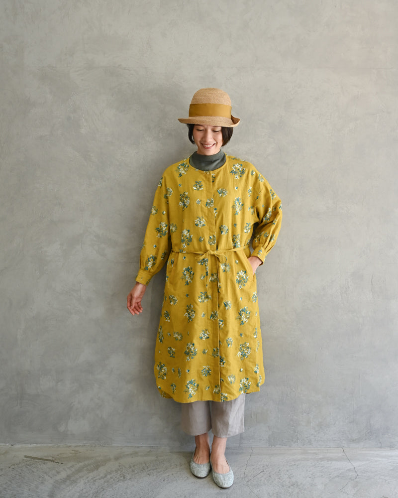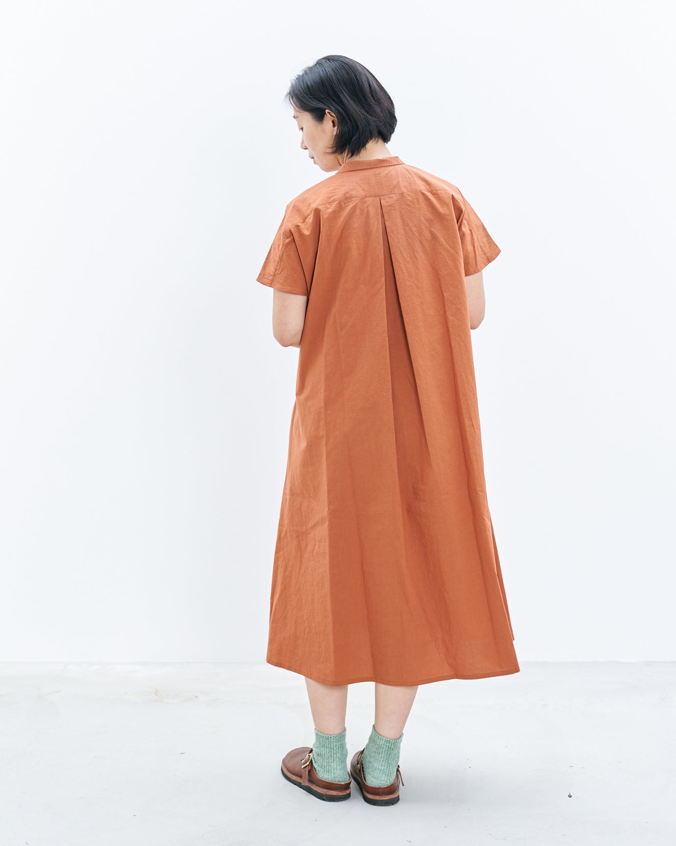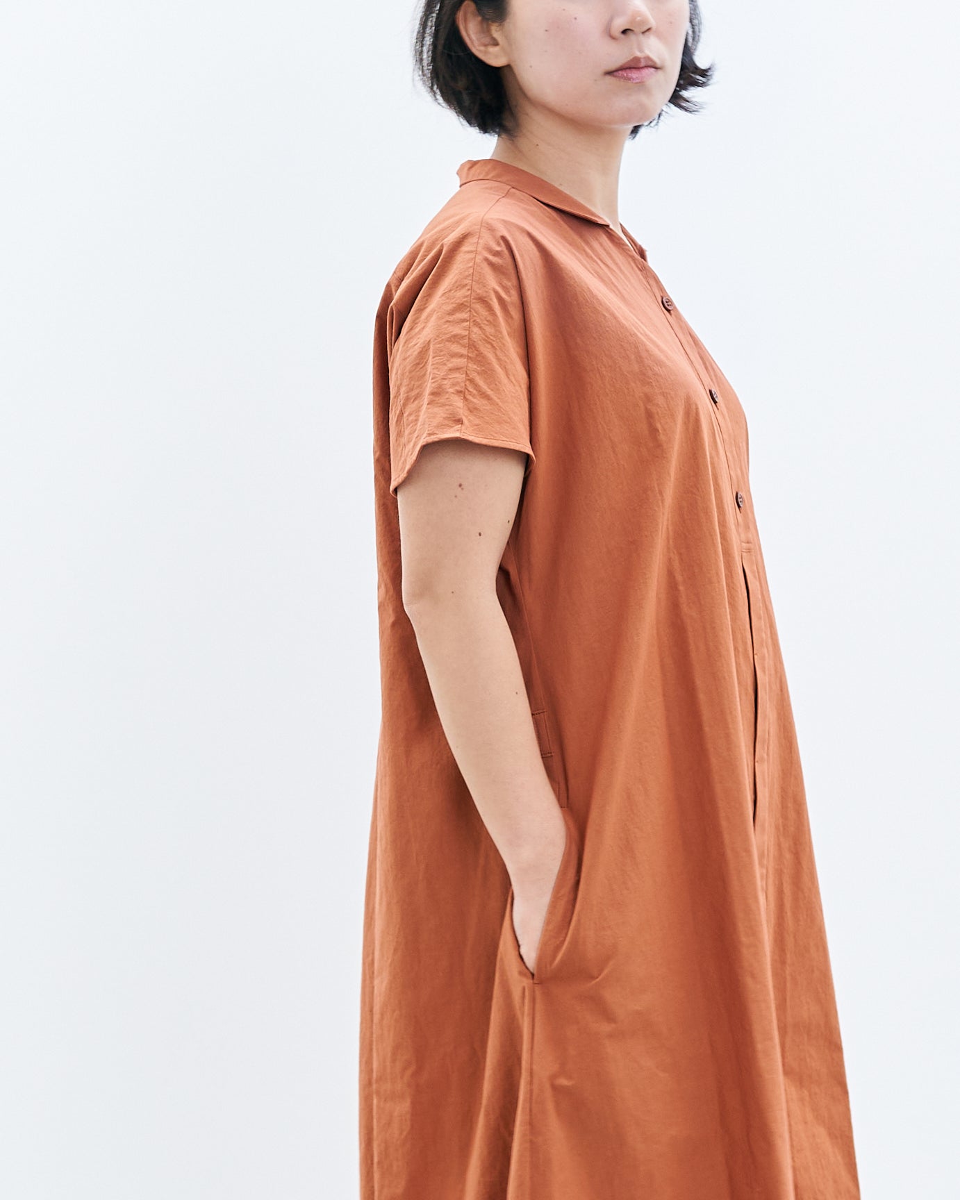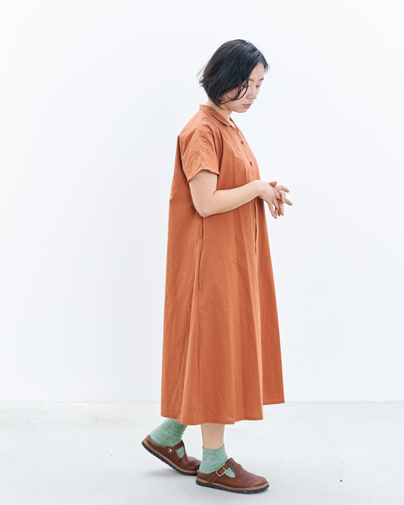 こちらのワンピースは、静岡県の遠州織物の工場で作られた上質なコットン素材の60/1タイプライター生地を使用しています。特殊な加工方法により、ドライタッチで肌離れが良く、汗ばむ季節も心地良くご着用いただけます。ナチュラルな風合いや細かなシワ加工があり、アイロンを綺麗にかけなくても美しくカジュアルな装いお楽しみいただけます。