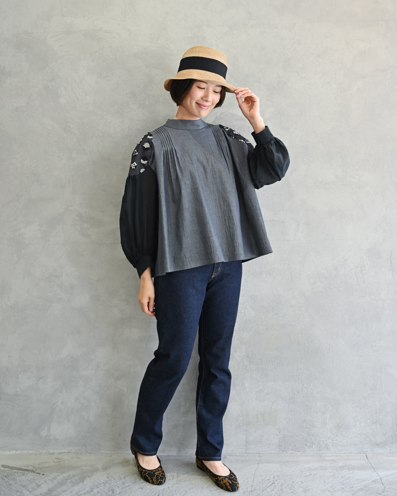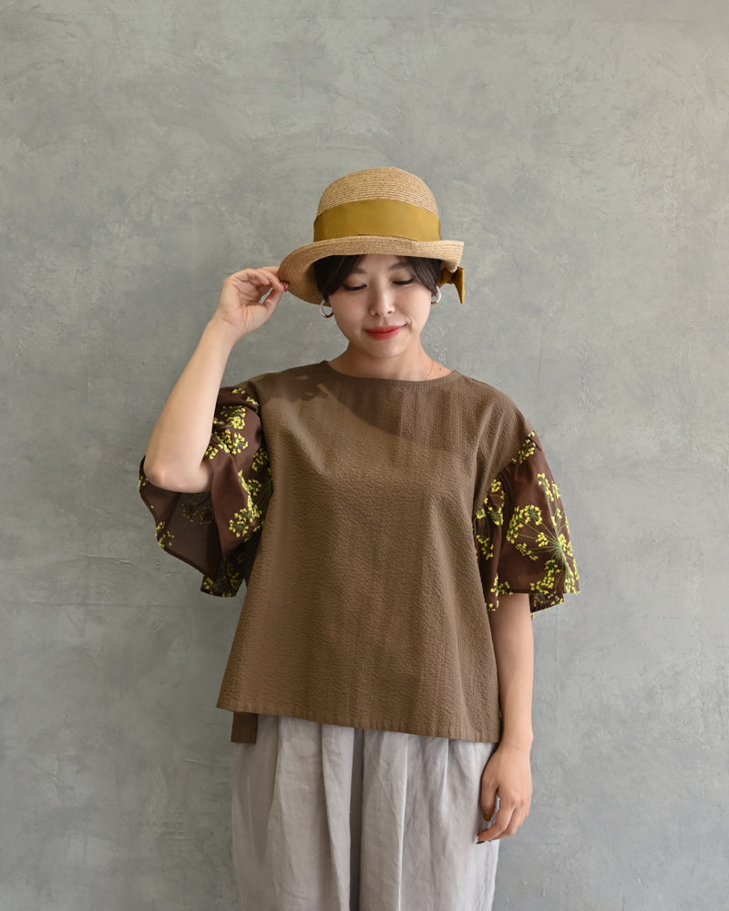 〈コットンタイプライター生地〉後ろギャザー入り フレンチスリーブのブラウス (muf925)